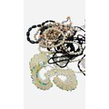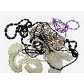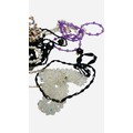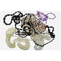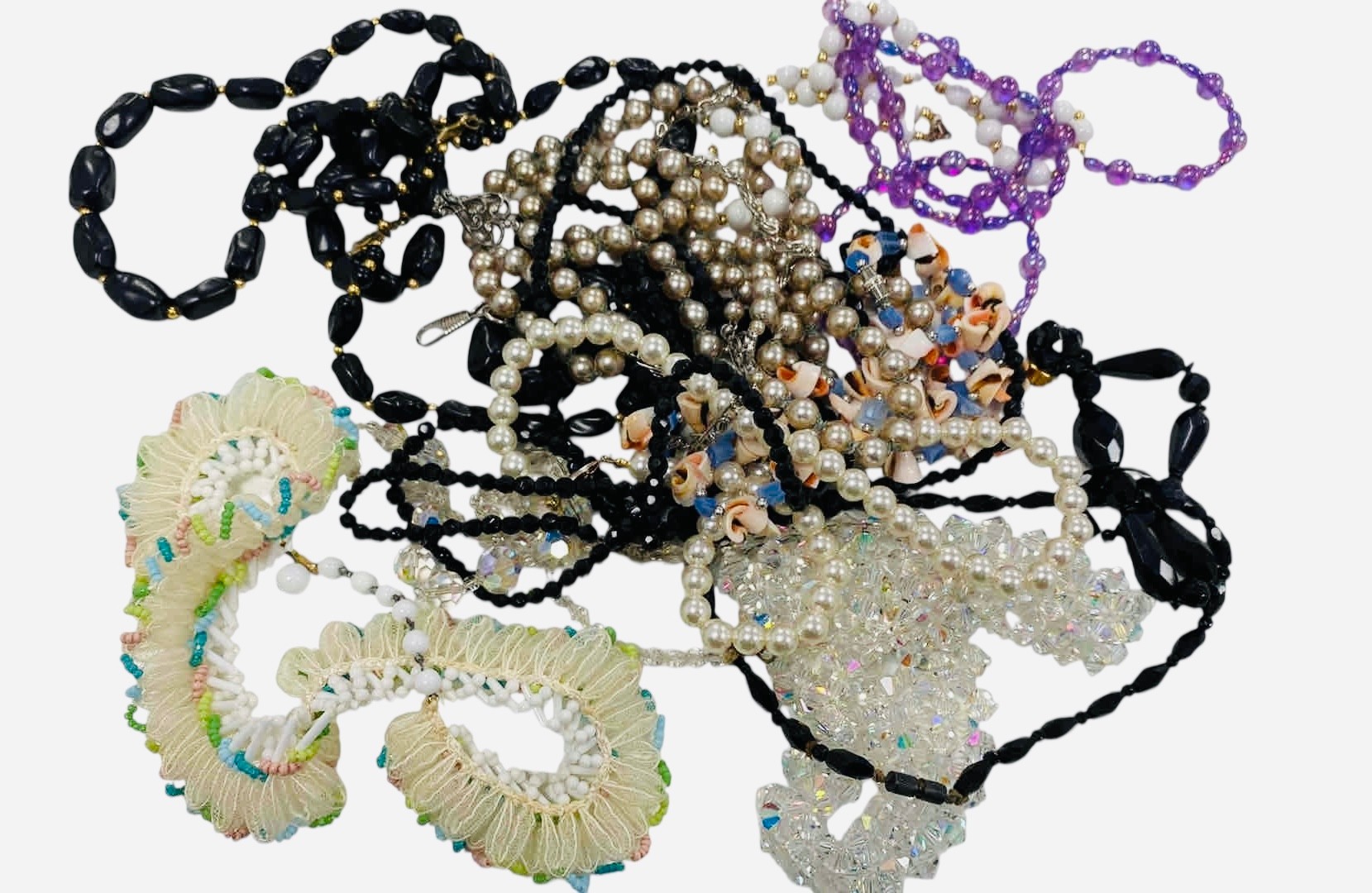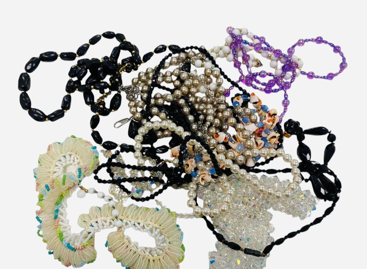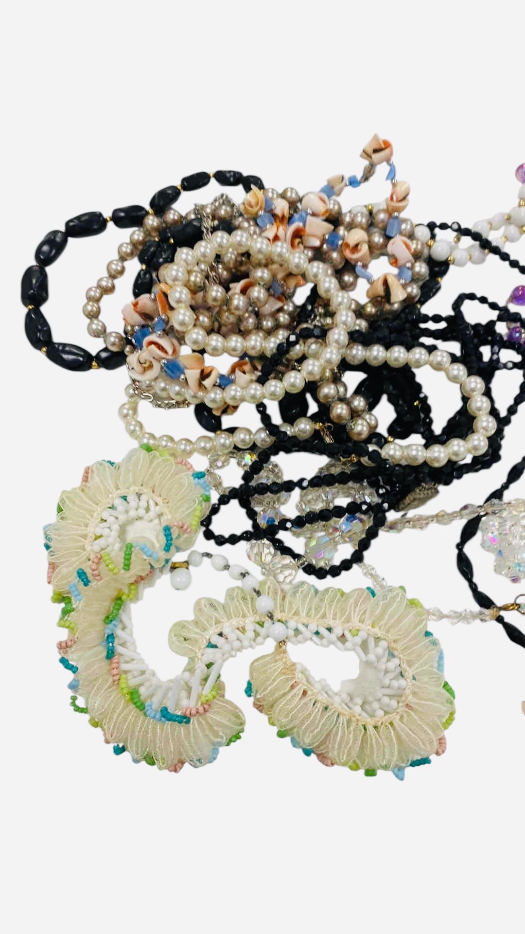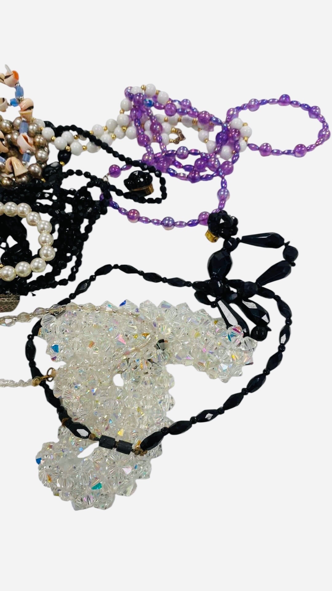 Group of costume jewellery, including assorted beaded necklaces and bracelets in faux pearl, black glass, iridescent clear crystal beads, shell-like beads, and purple/white plastic bead strands.
