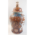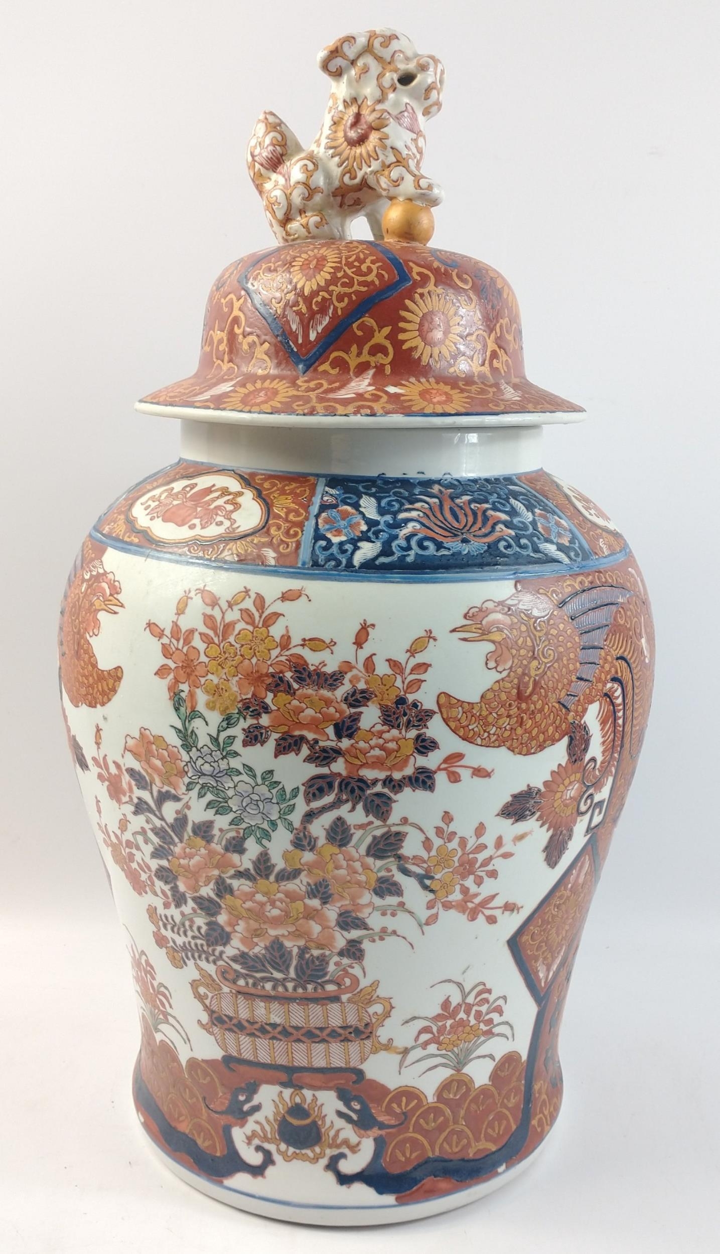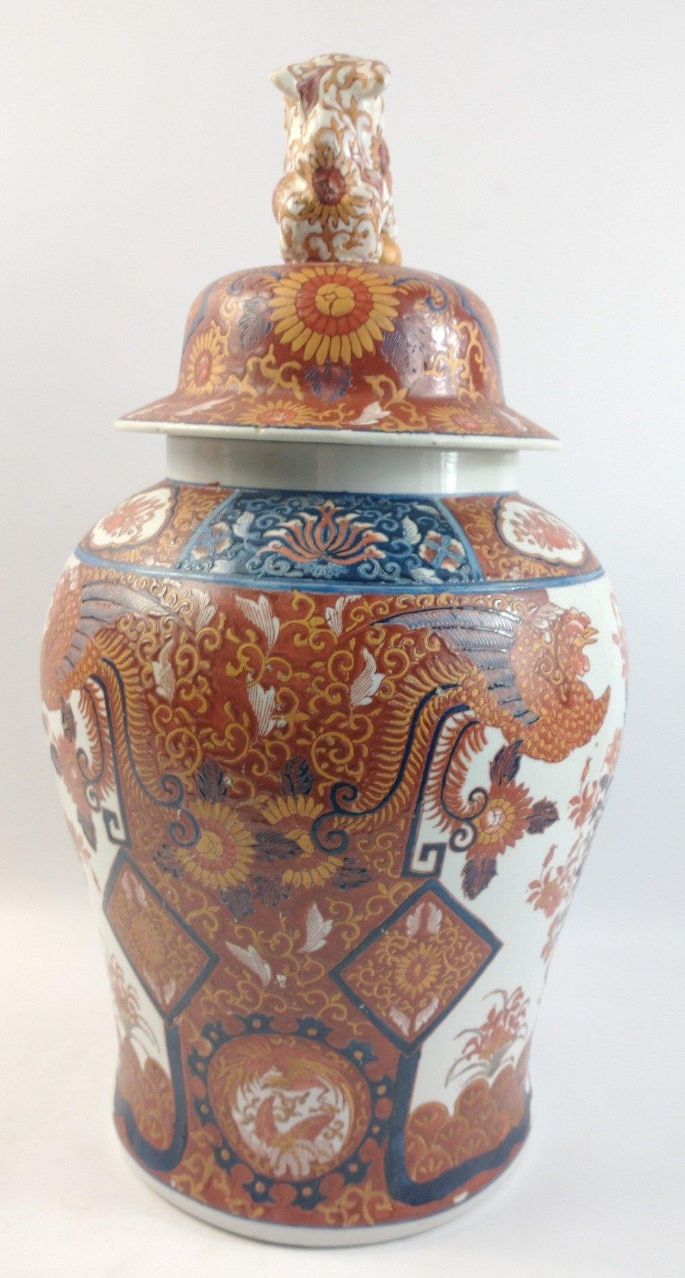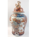 A large Oriental Japanese Imari baluster shaped jar with Foo Dog finial. Marks to base. A rather impressive piece in nice undamaged condition standing 48cm tall approx.
