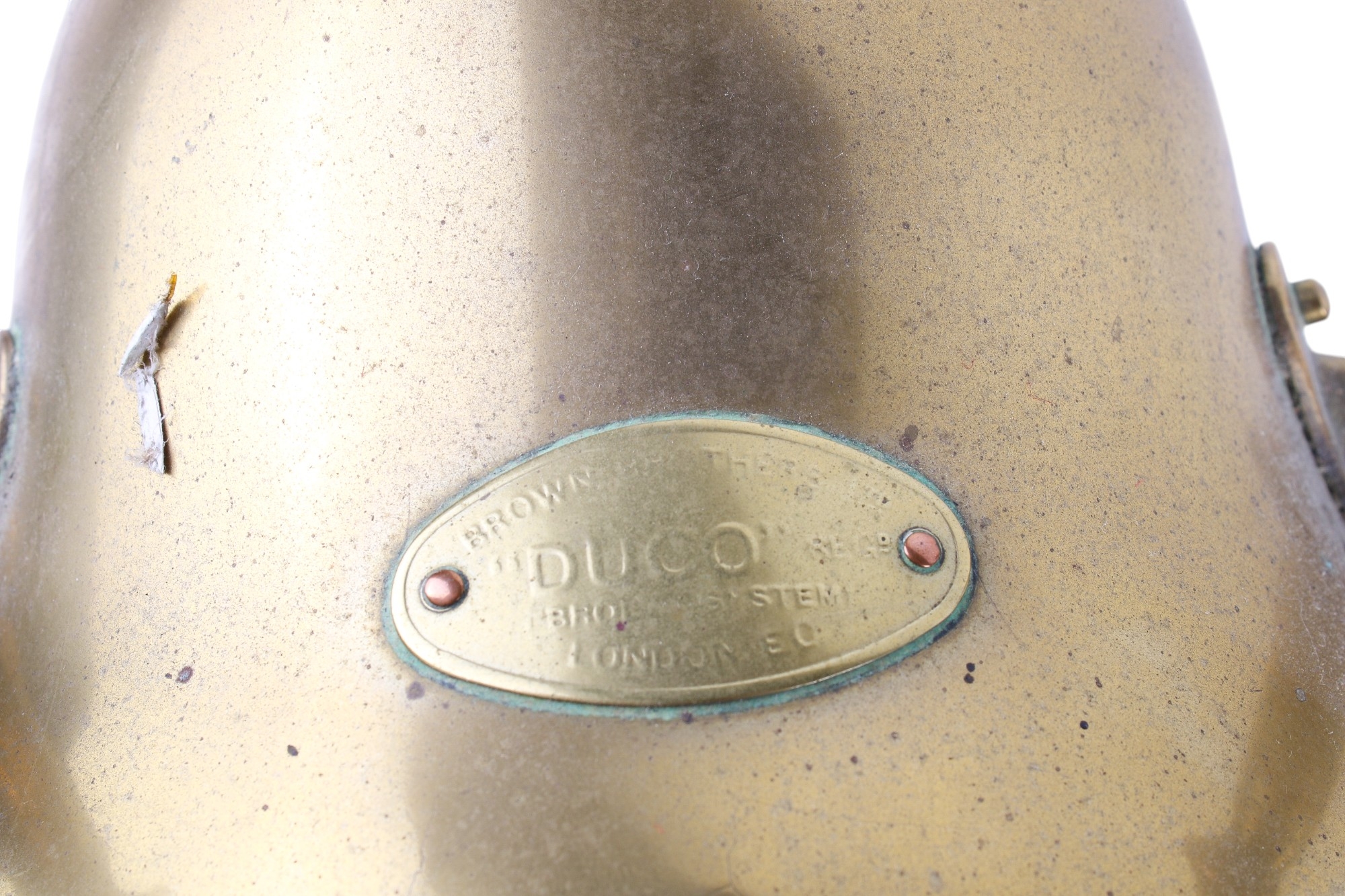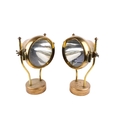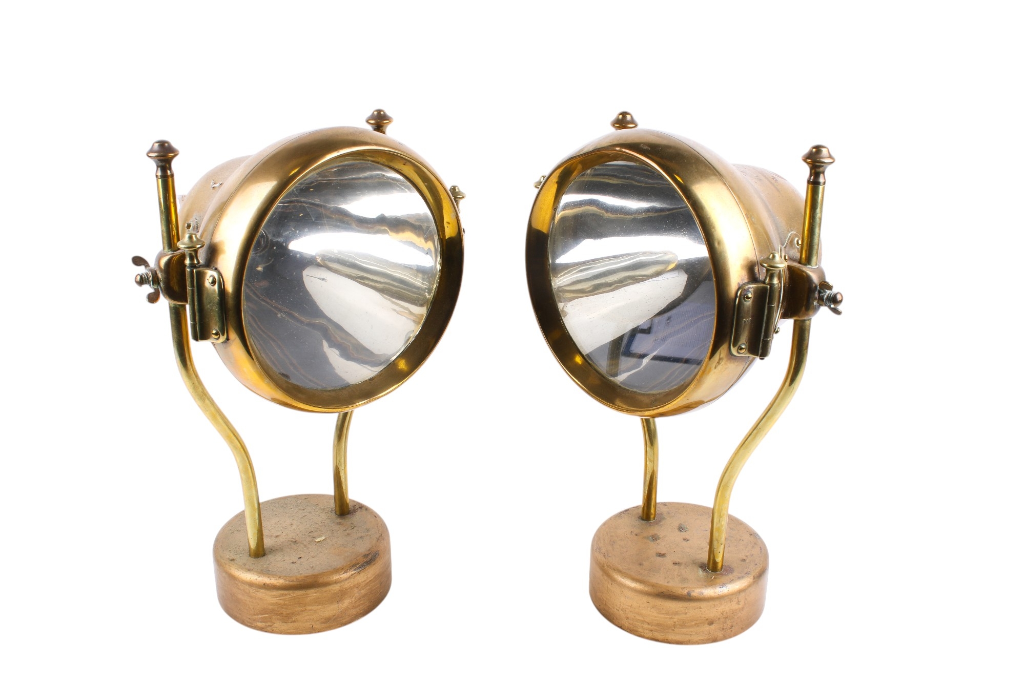 A pair of vintage Browns Brothers Ltd 'Duco' brass vehicle headlamps. Constructed from headlights attached to adjustable stands, mounted on circular weighted bases, makers plaques to the backs of the lights, height 40cm