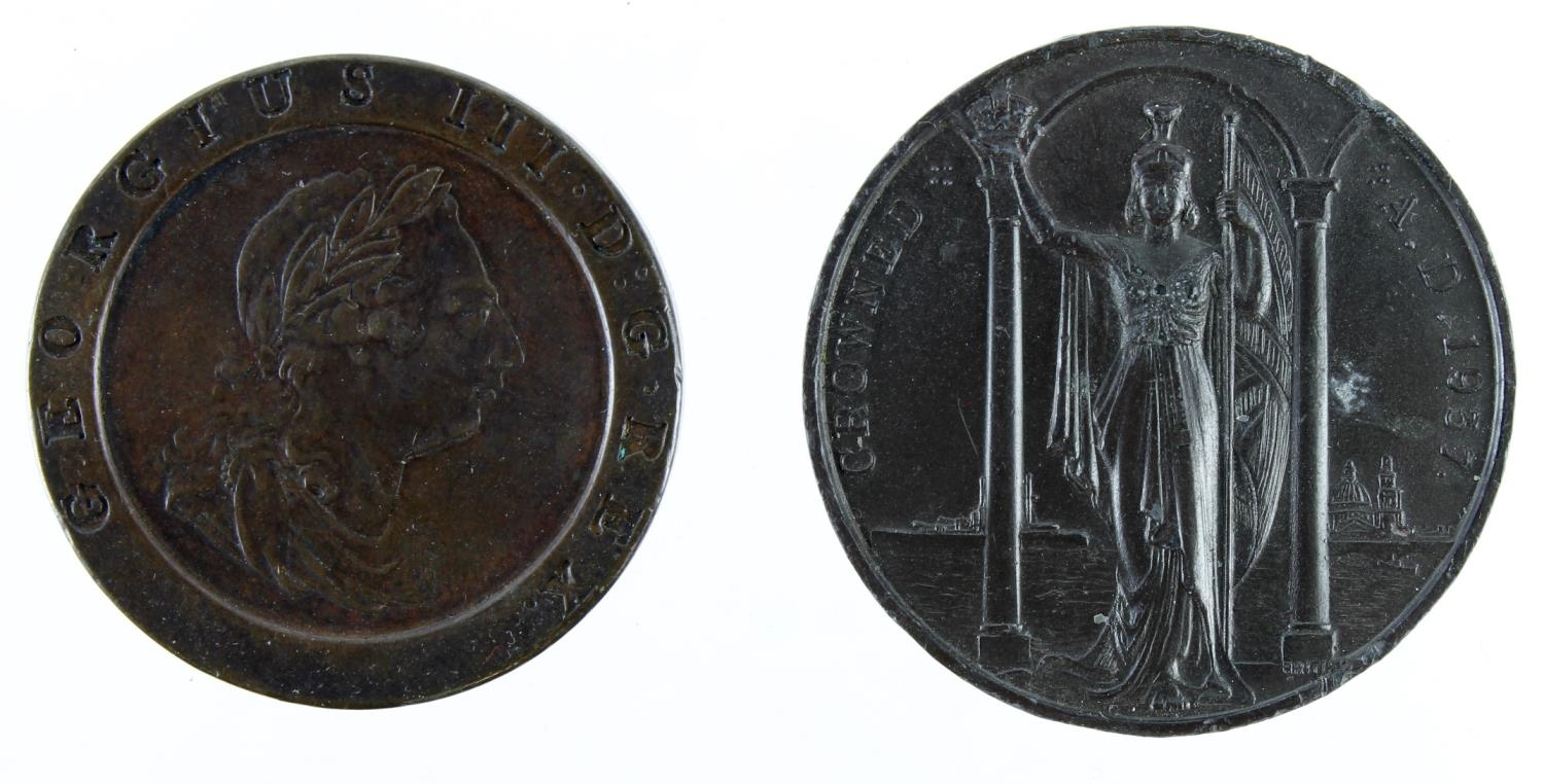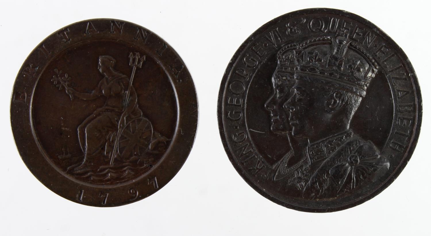 GB Copper (2): Cartwheel Twopence 1797 VF, and a George VI Coronation 1937 bronzed base medal d.44mm, GVF