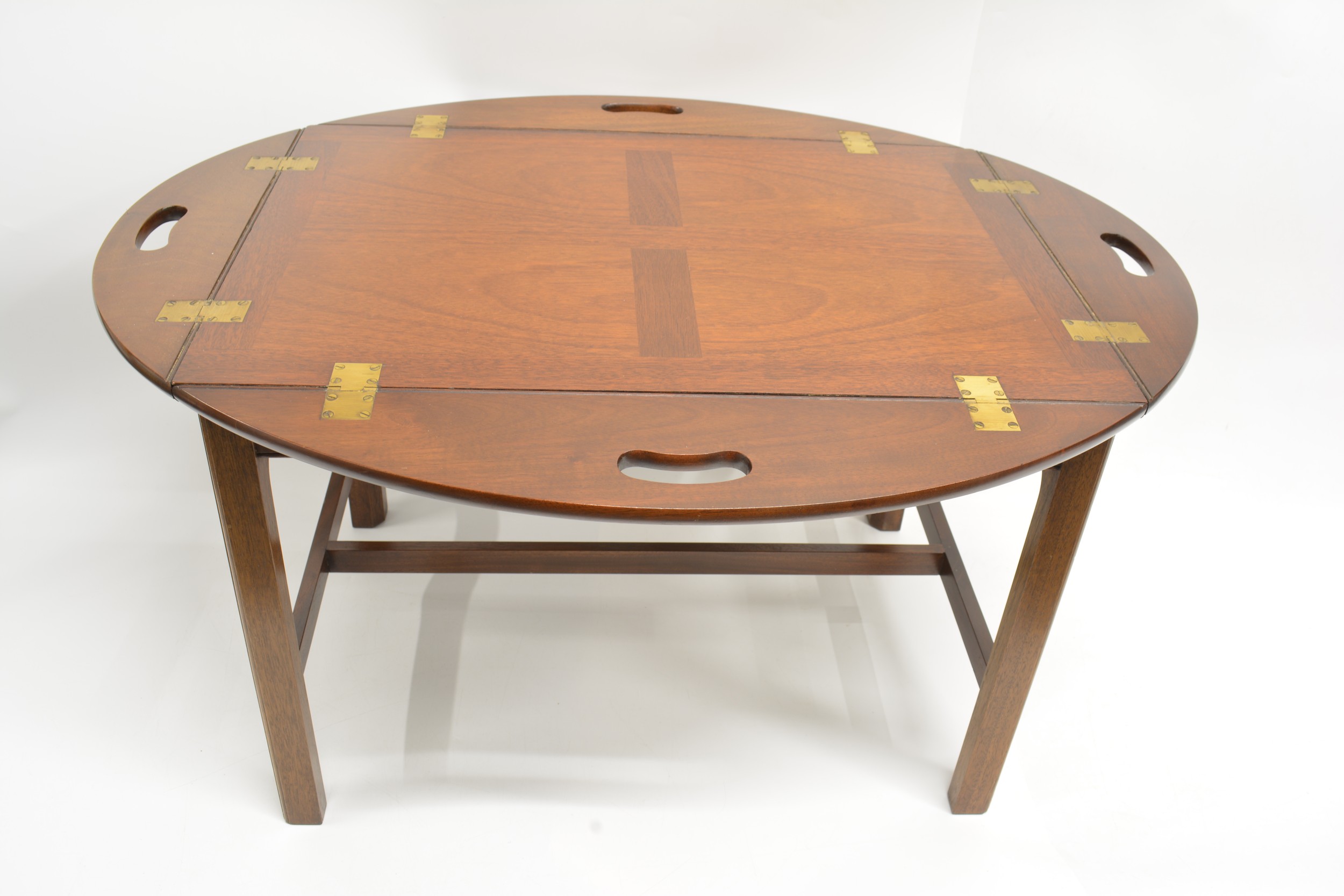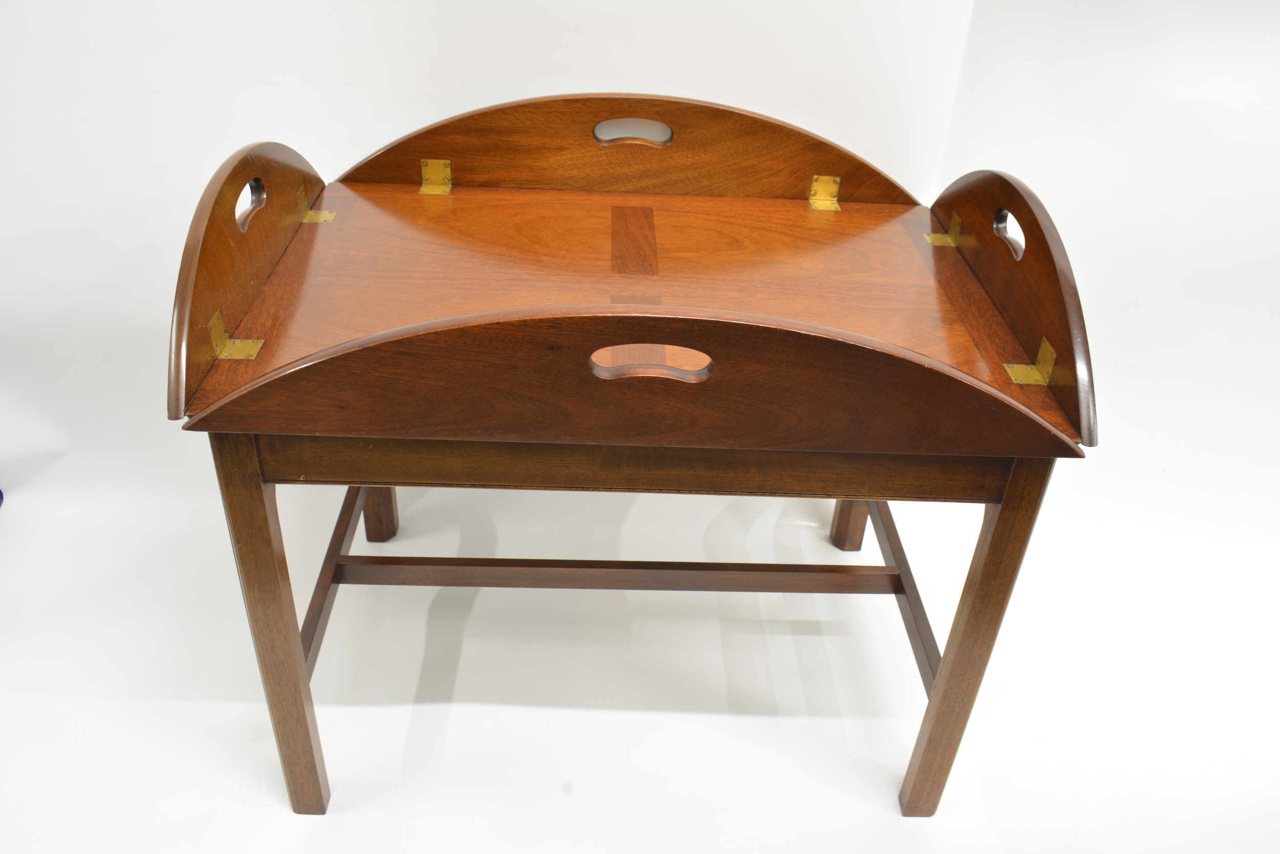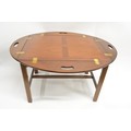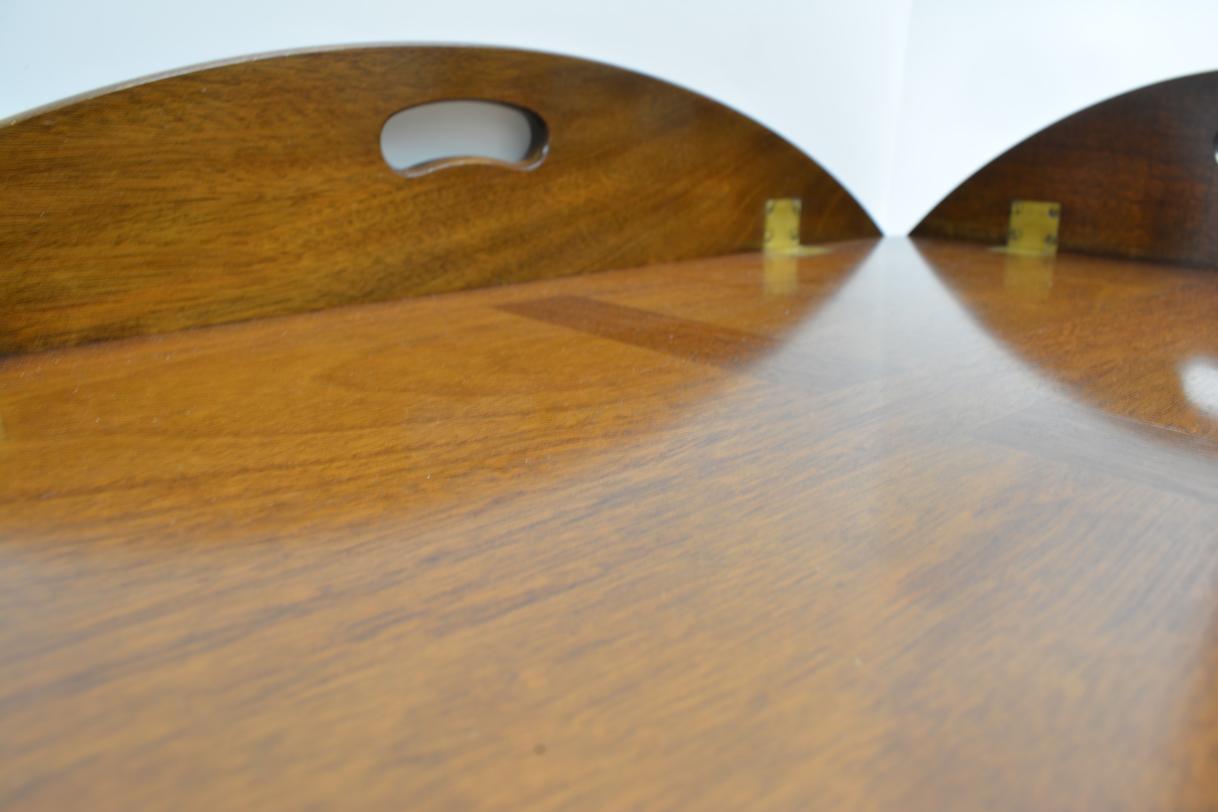 Mahogany butlers tray with folding brass hinges, on removable stand
