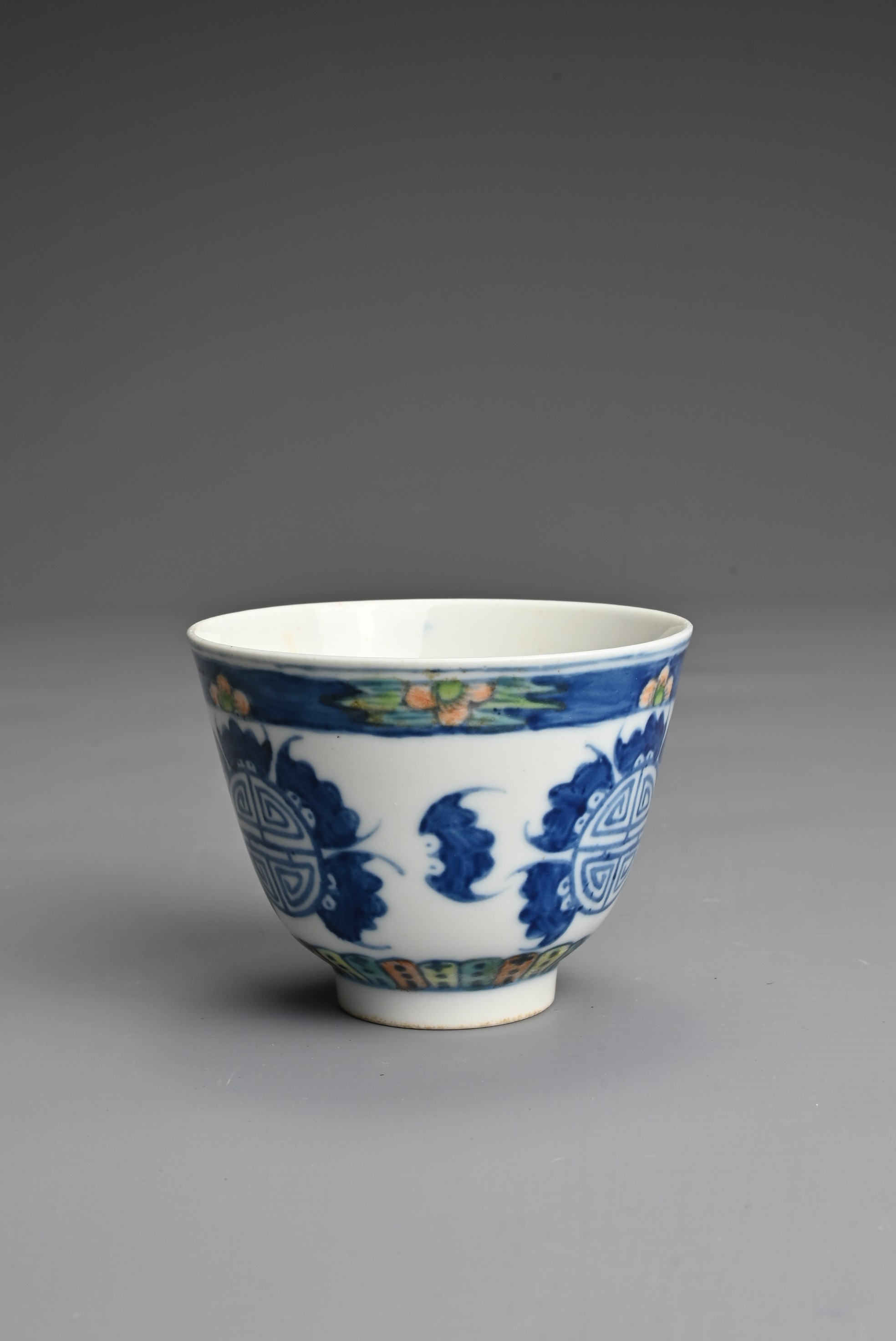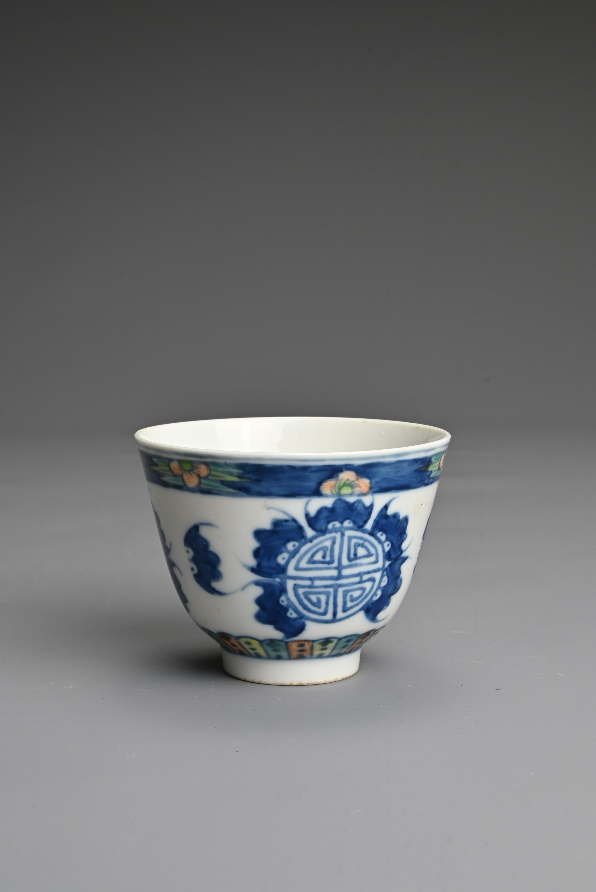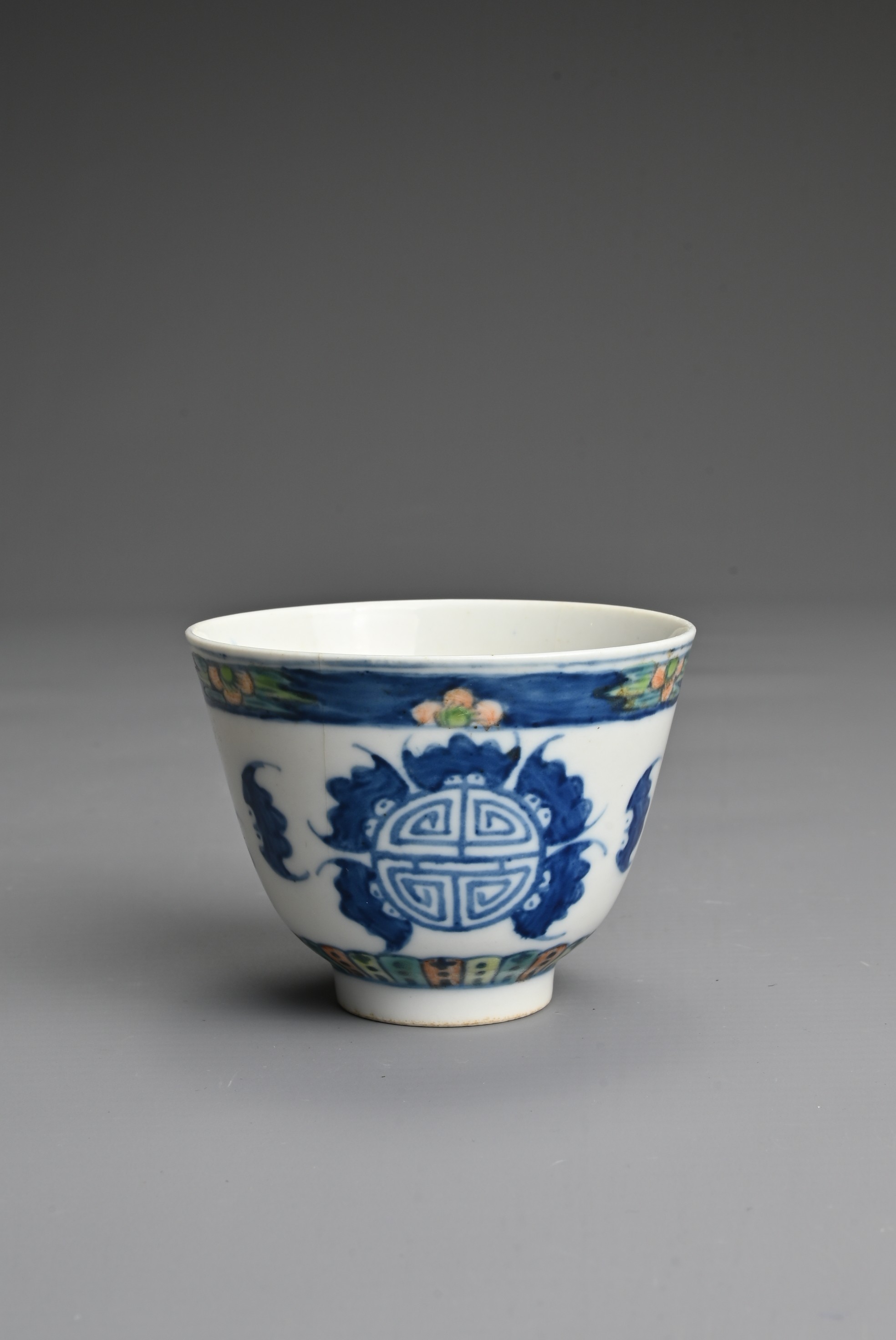 A CHINESE PORCELAIN WIN CUP, GUANGXU PERIOD. Decorated in underglaze blue with Shou medallions by bats. Further decorated with turquoise, orange and yellow enamel filled lappets and flowers. Guangxu period (1875-1908). 5.8cm tall