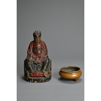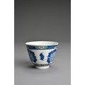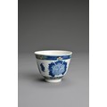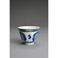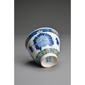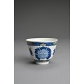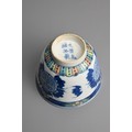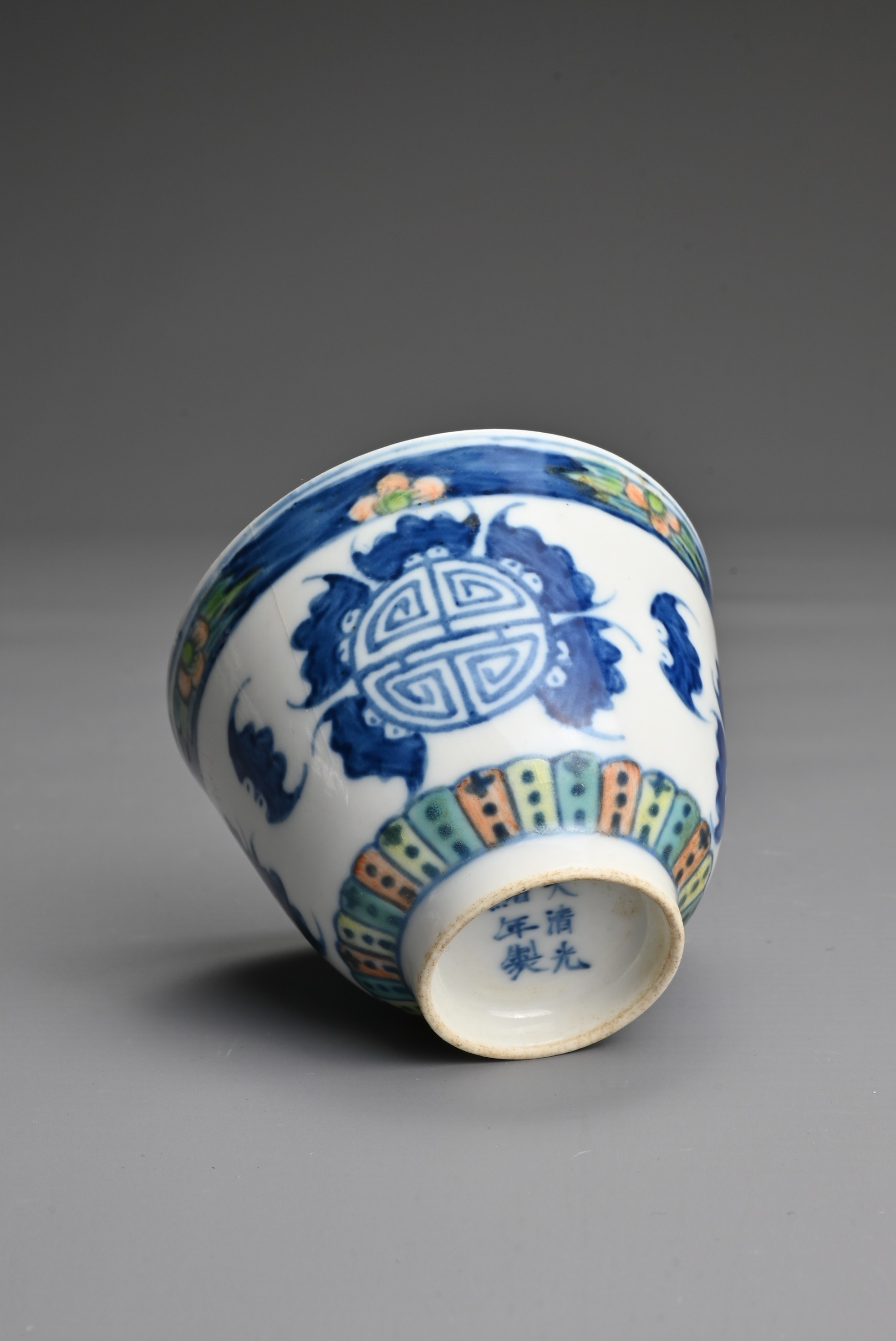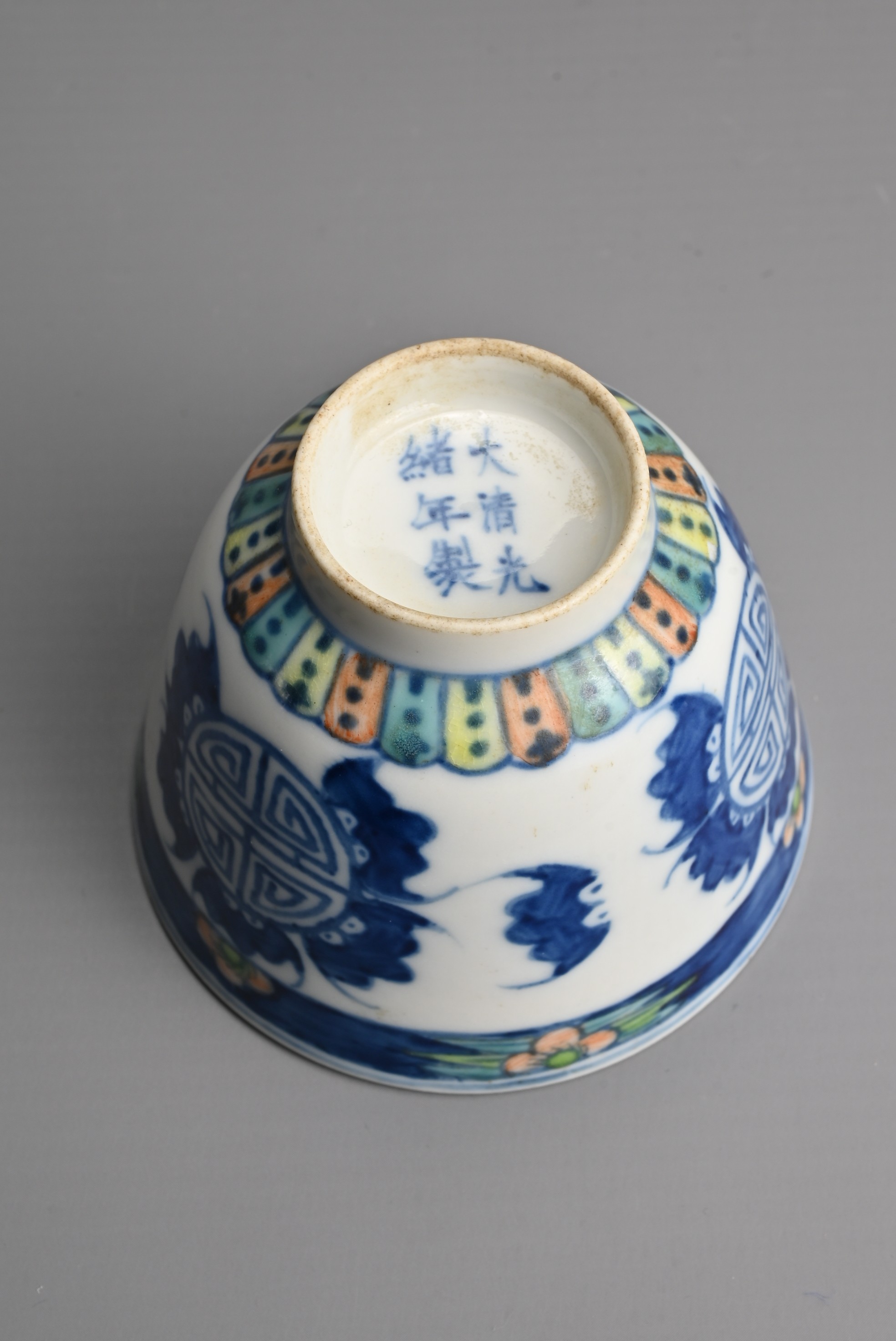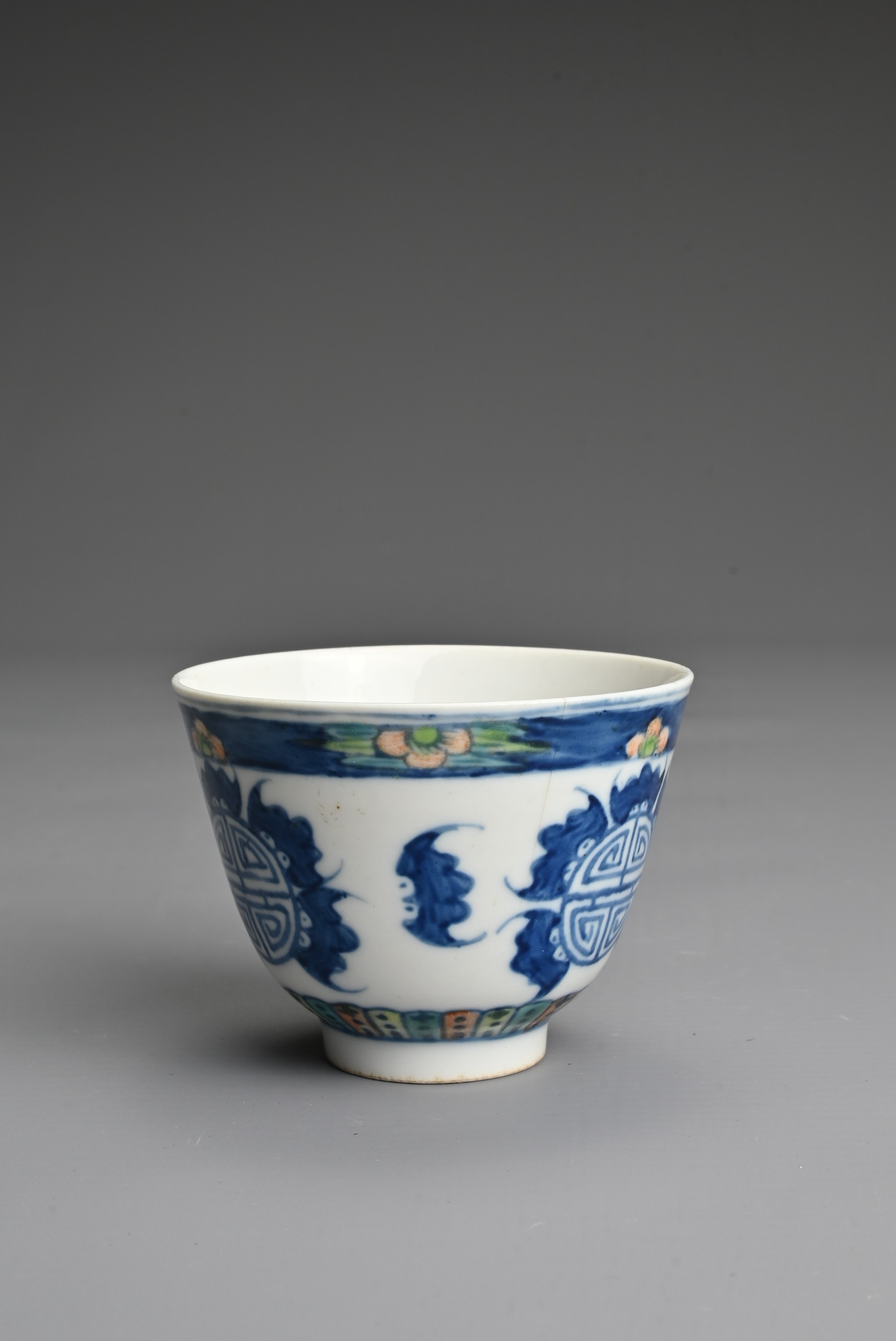 A CHINESE PORCELAIN WIN CUP, GUANGXU PERIOD. Decorated in underglaze blue with Shou medallions by bats. Further decorated with turquoise, orange and yellow enamel filled lappets and flowers. Guangxu period (1875-1908). 5.8cm tall
