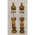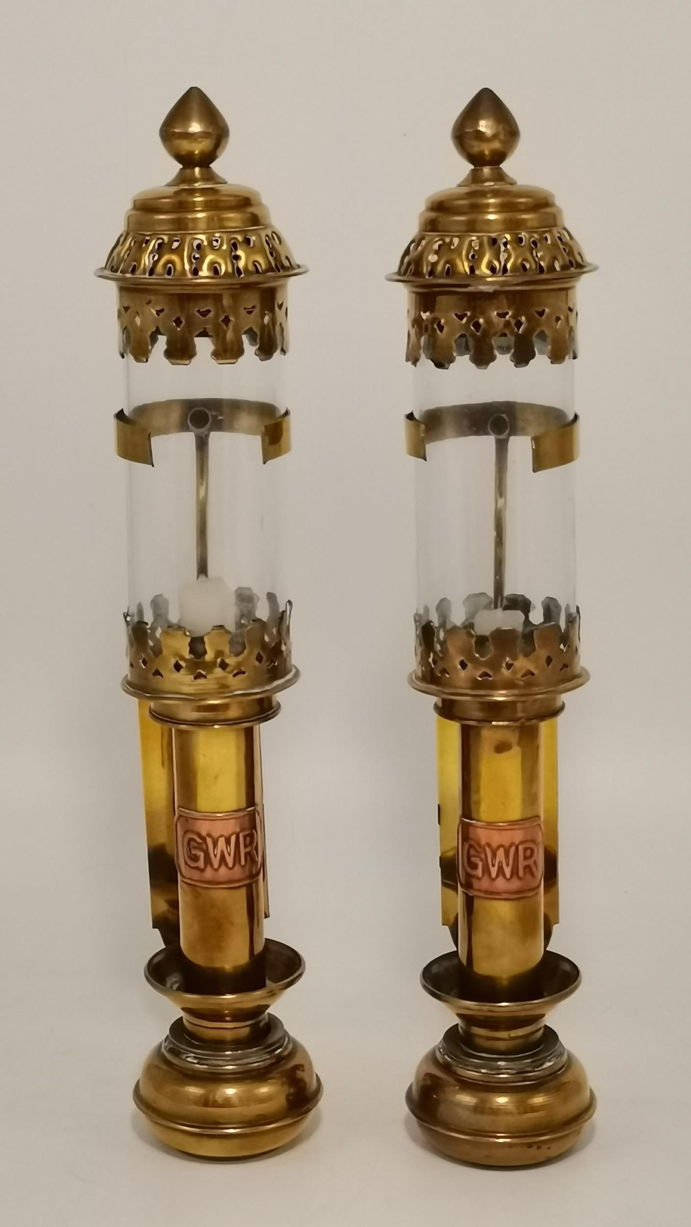 A Pair of Brass railway carriage lamps with copper GWR plaques and glass shades with pierced brass vents H37cm