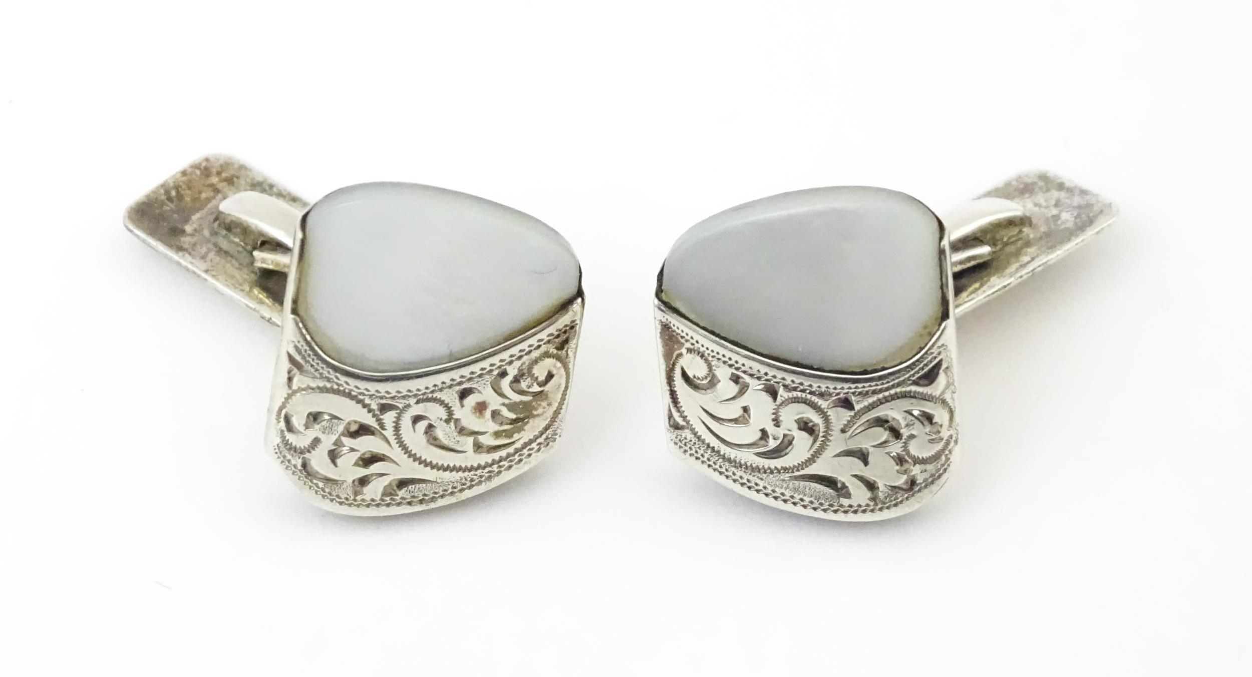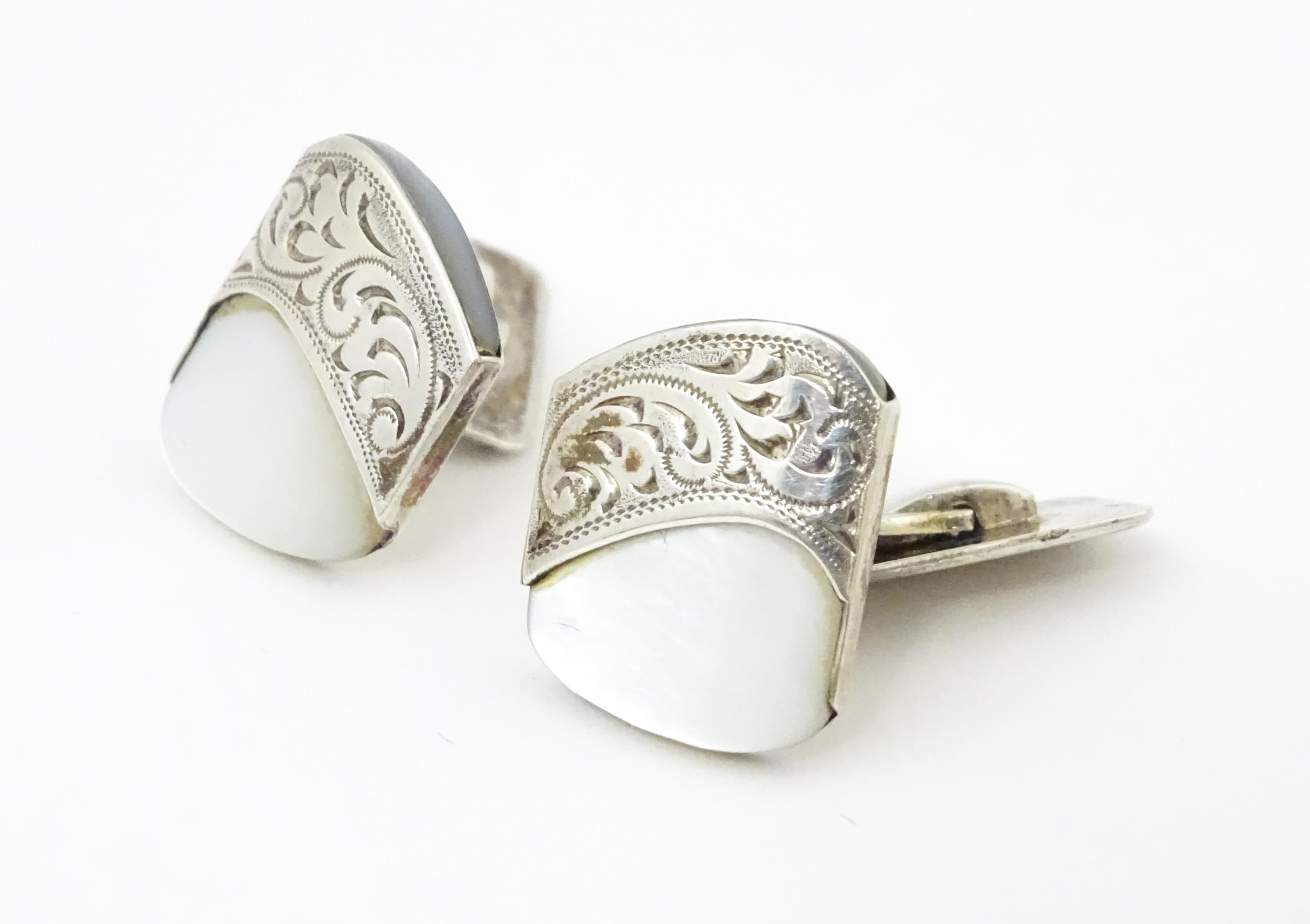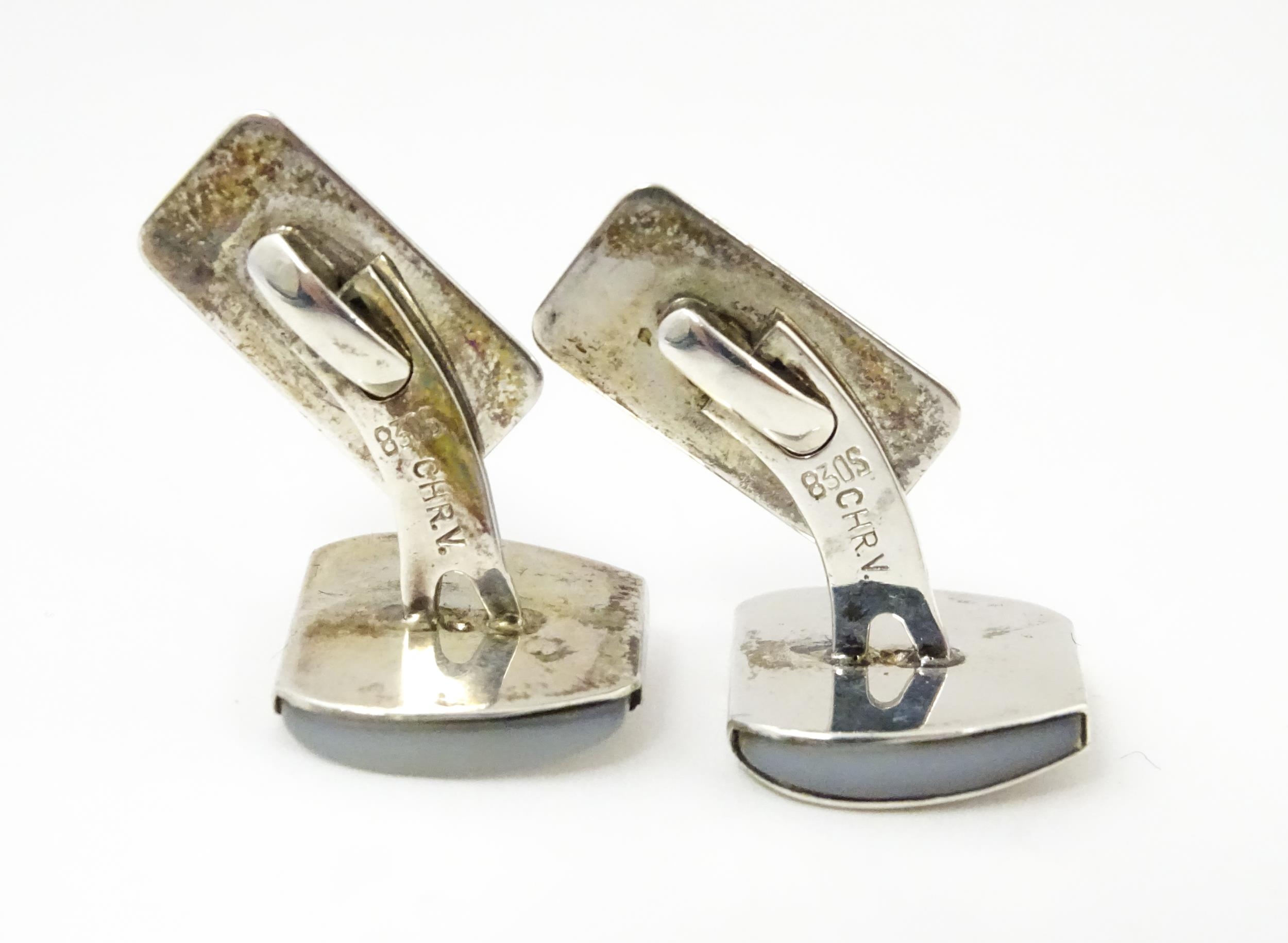 Scandinavian silver: A pair of Danish .830 silver cufflinks with mother of pearl detail, maker Christian Veilskov