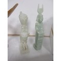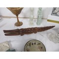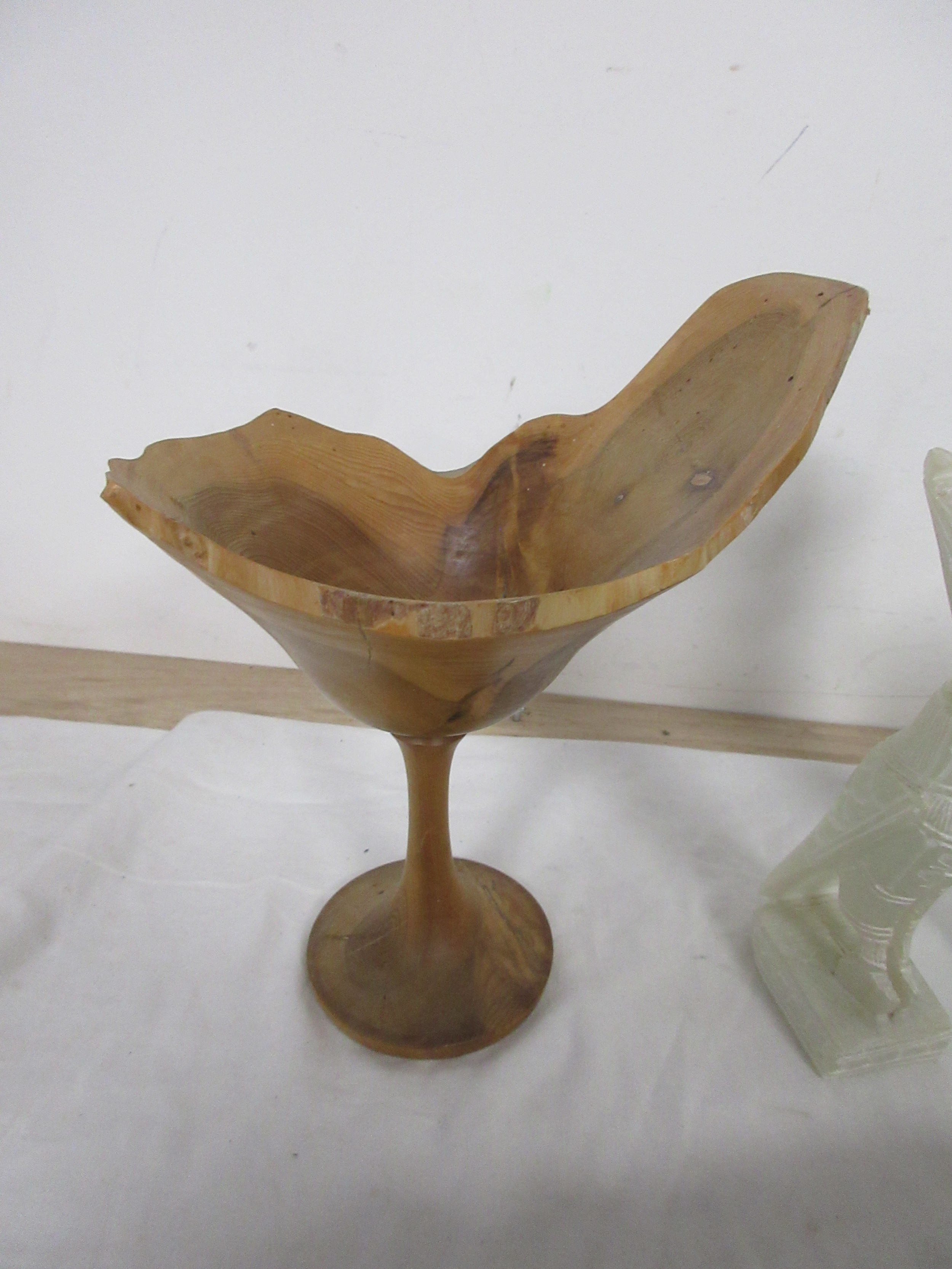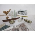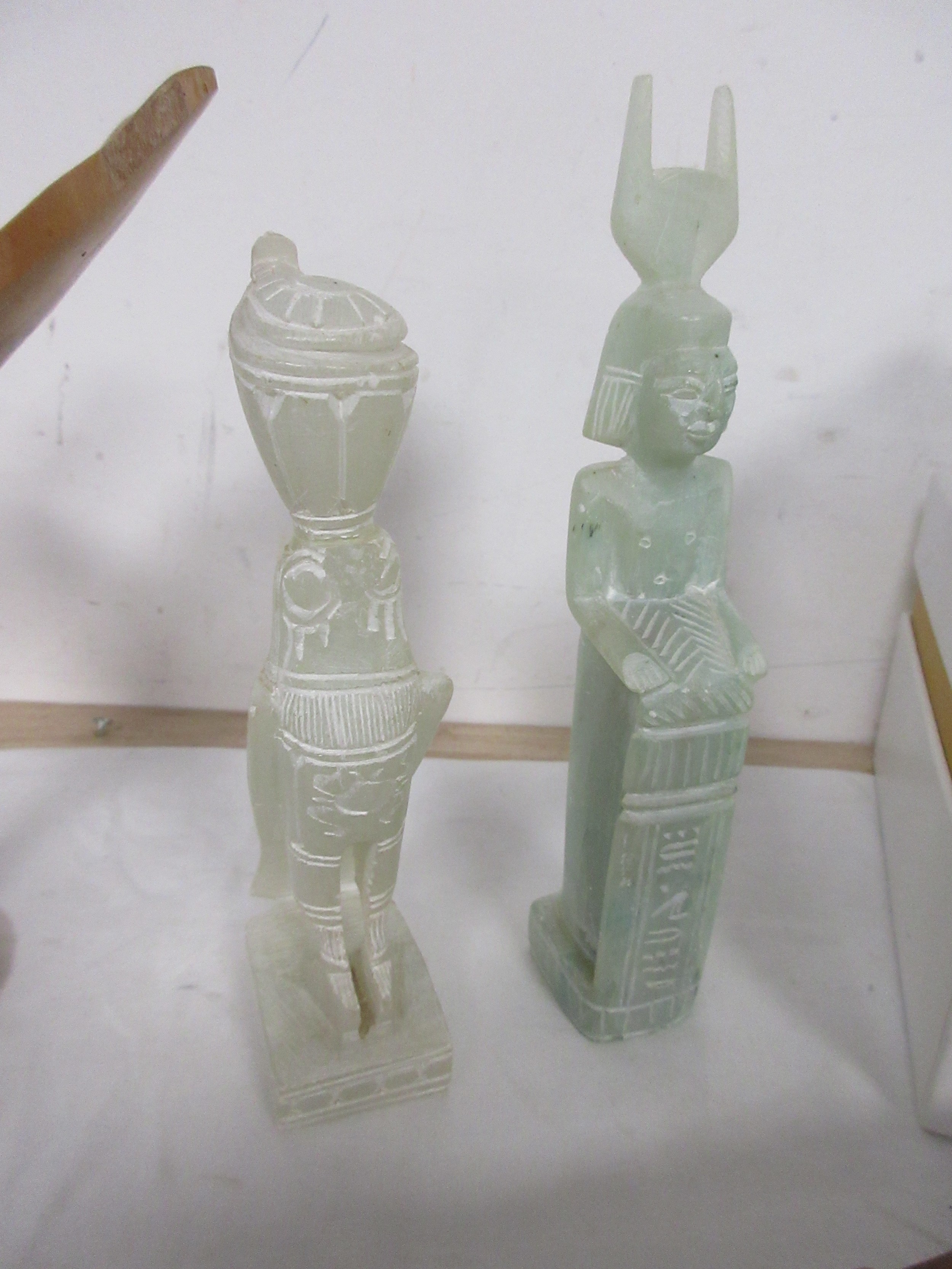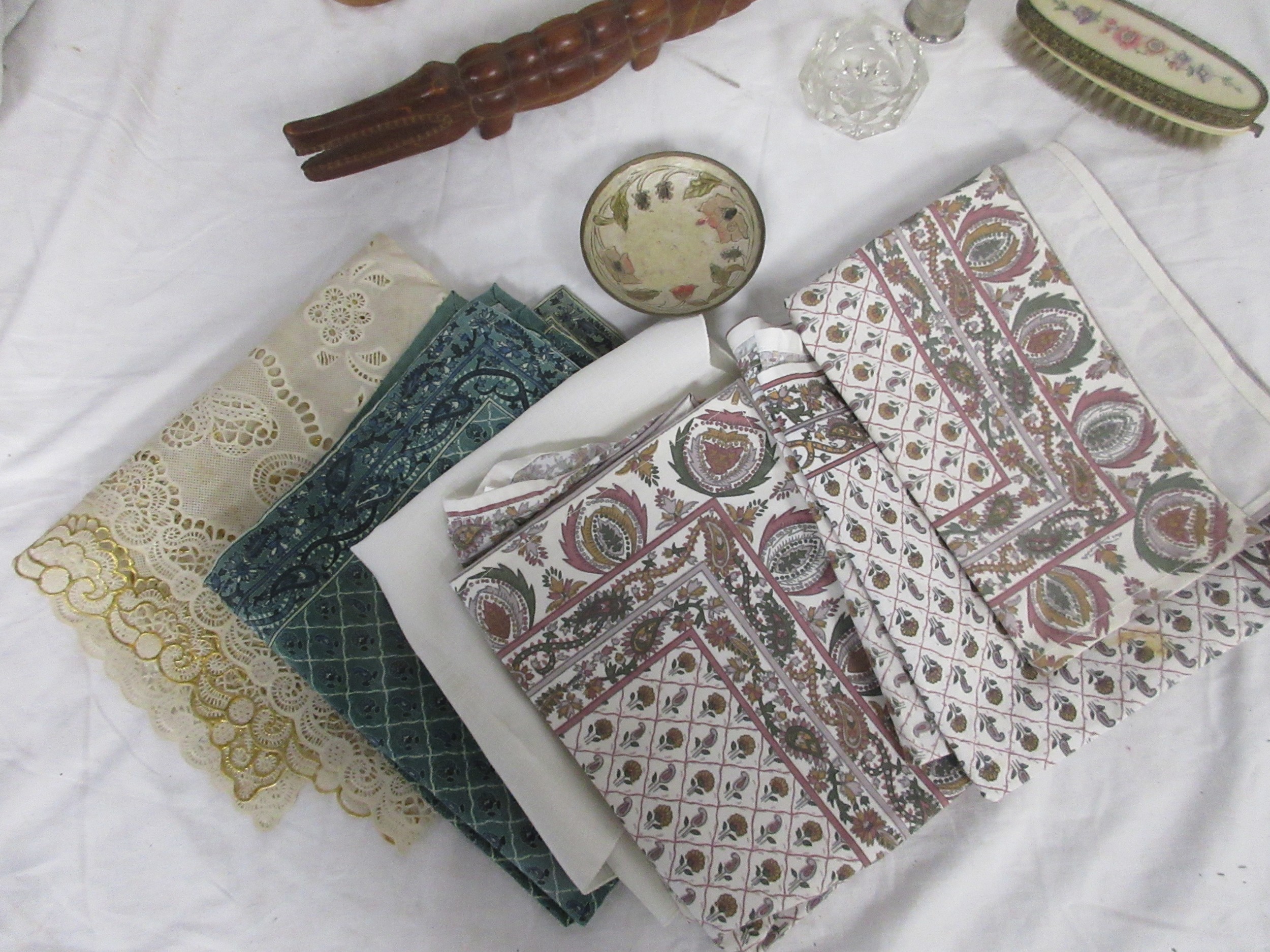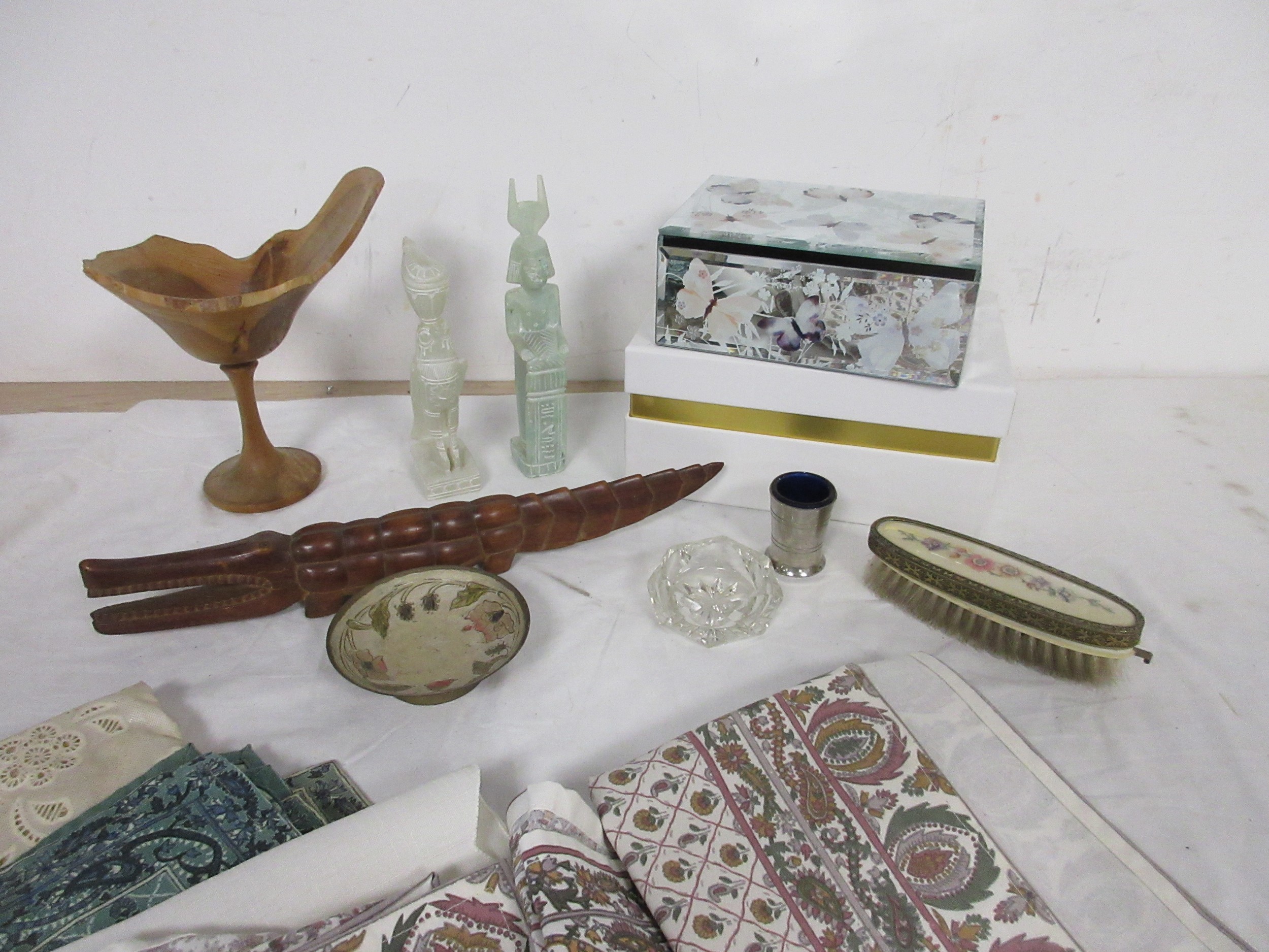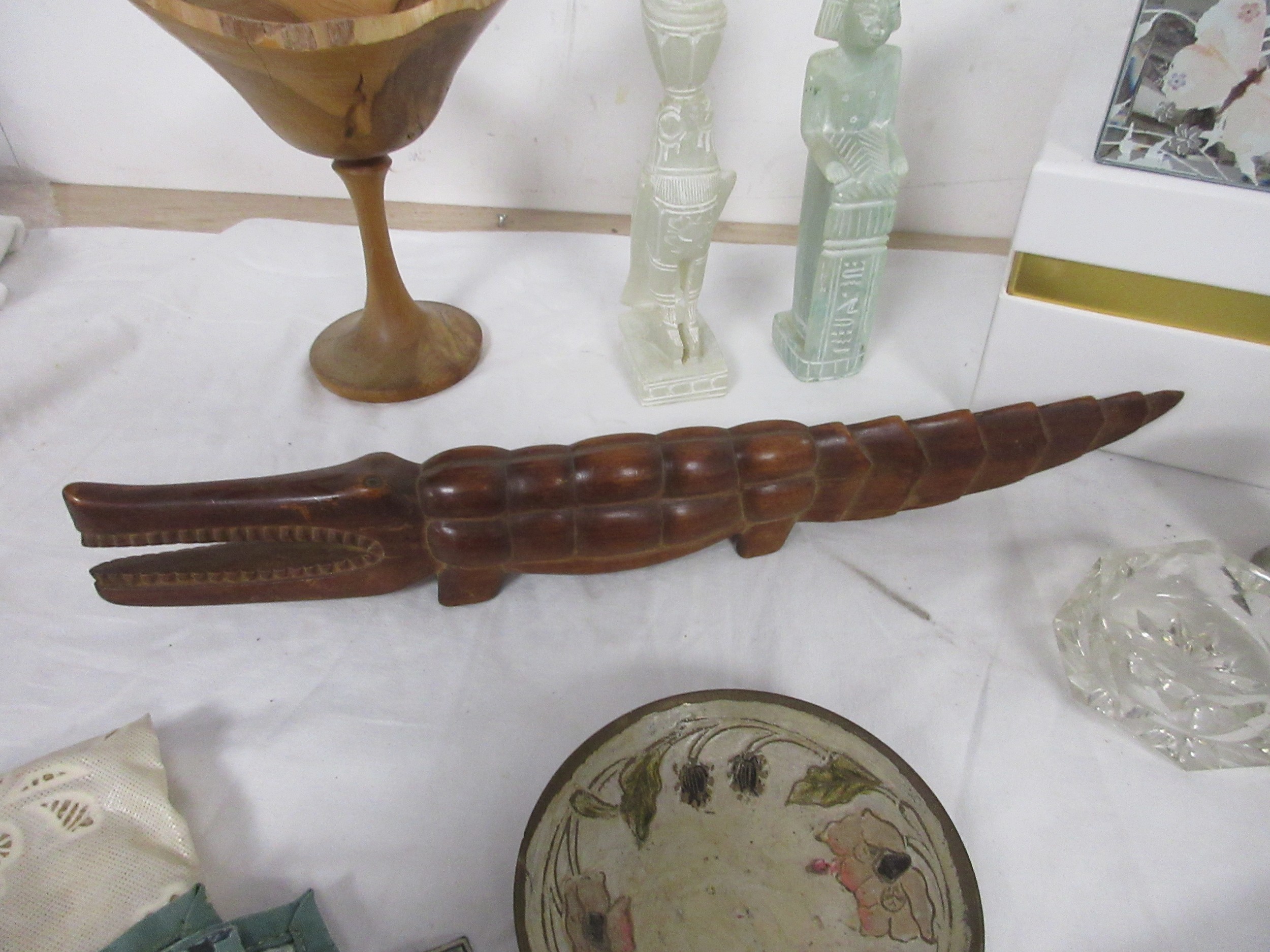 Mixed decorative and household items - a turned yew wood bowl on foot signed Alan Long, two carved stone Egyptian figures, a carved wooden crocodile, textile placemats and napkins, a glazed trinket box, etc