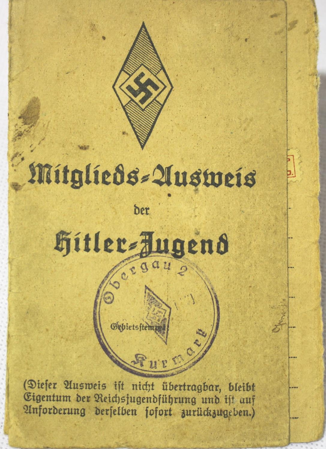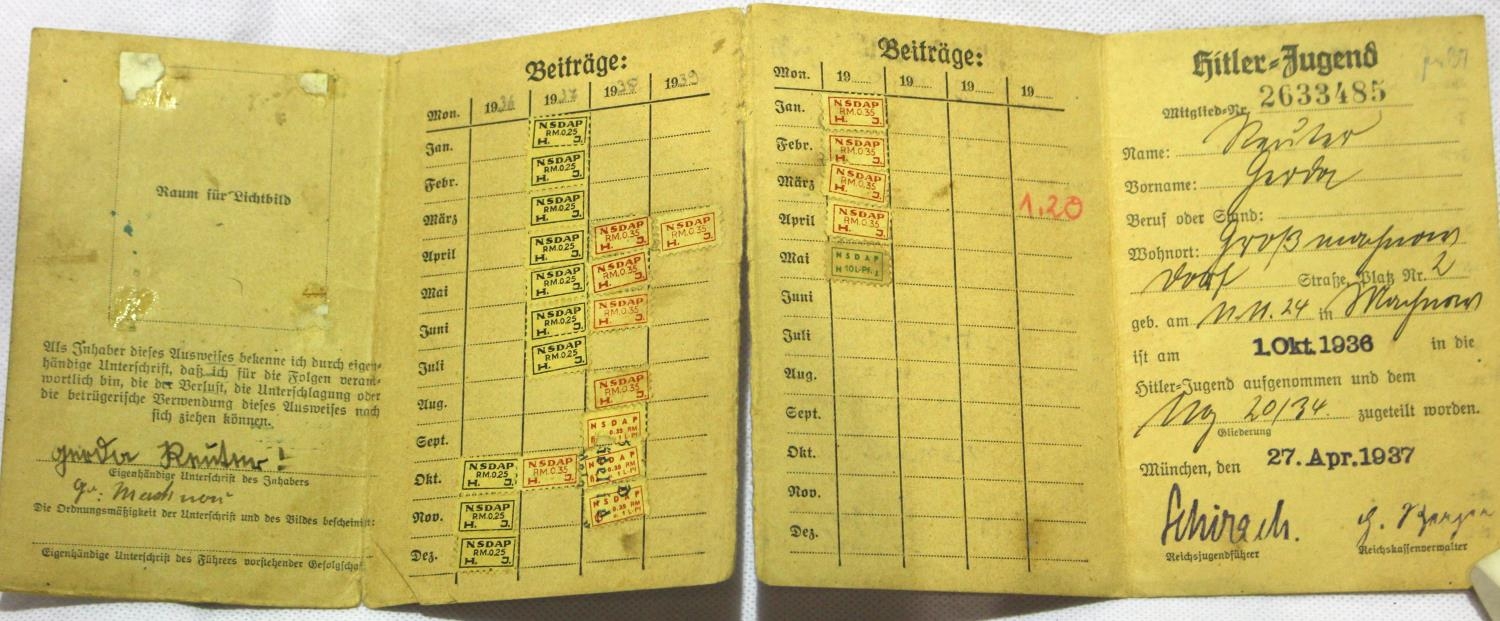 German Third Reich period Hitler Youth ID card containing various stamps and inscribed, dated 1937. P&P Group 1 (£14+VAT for the first lot and £1+VAT for subsequent lots)