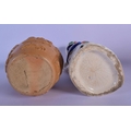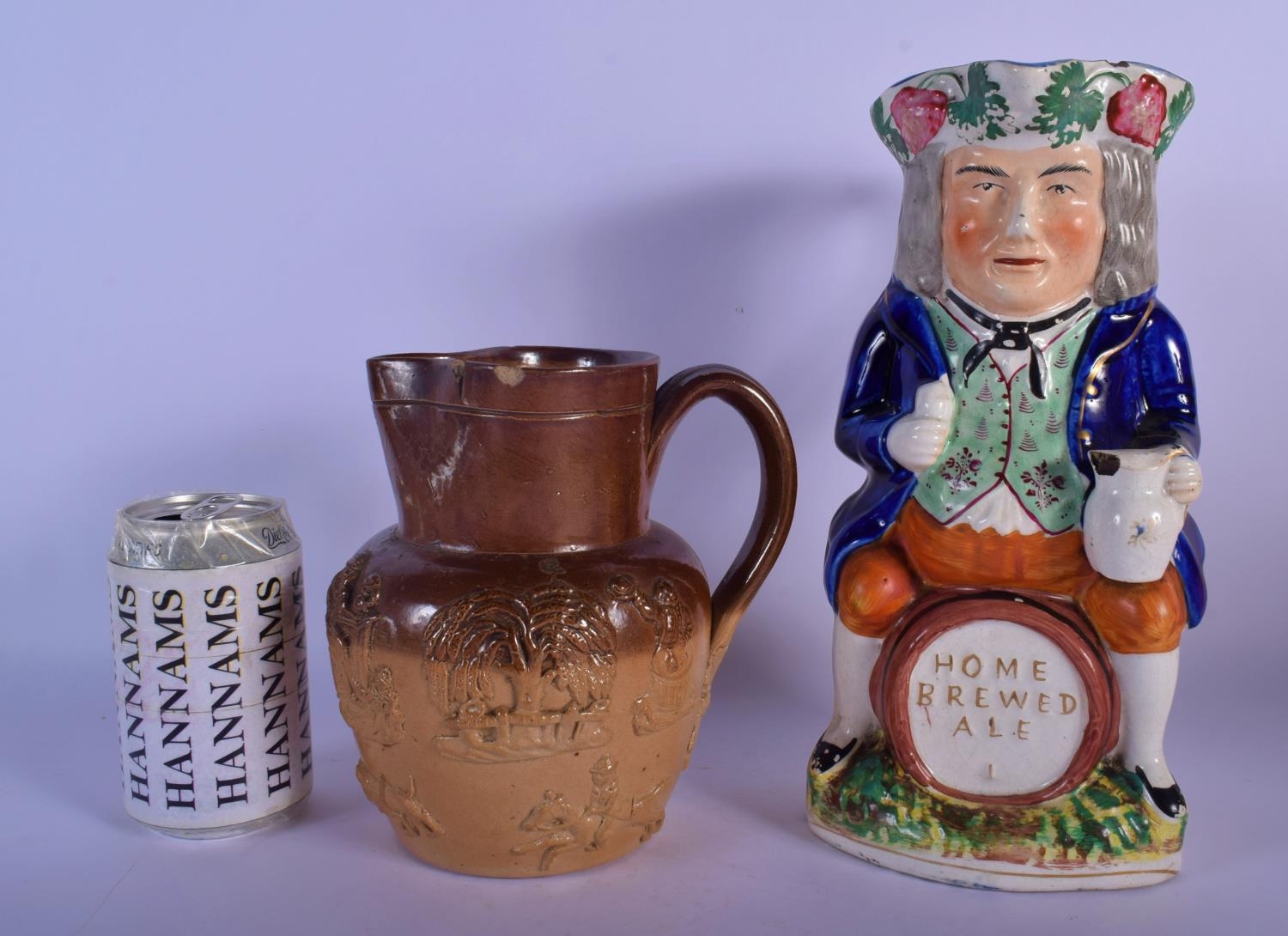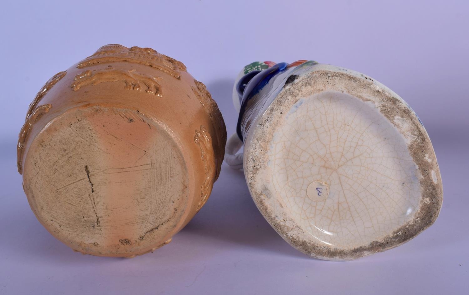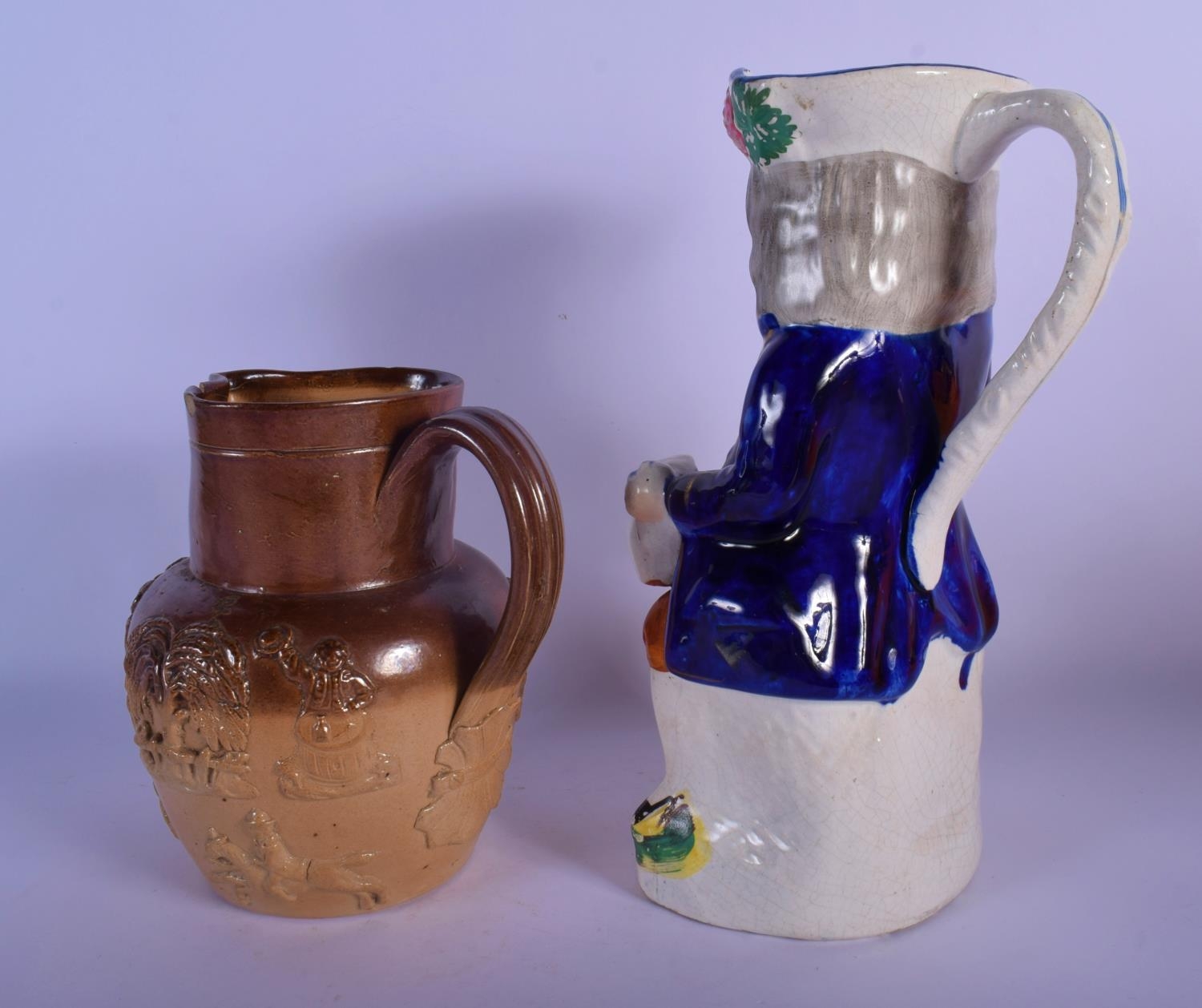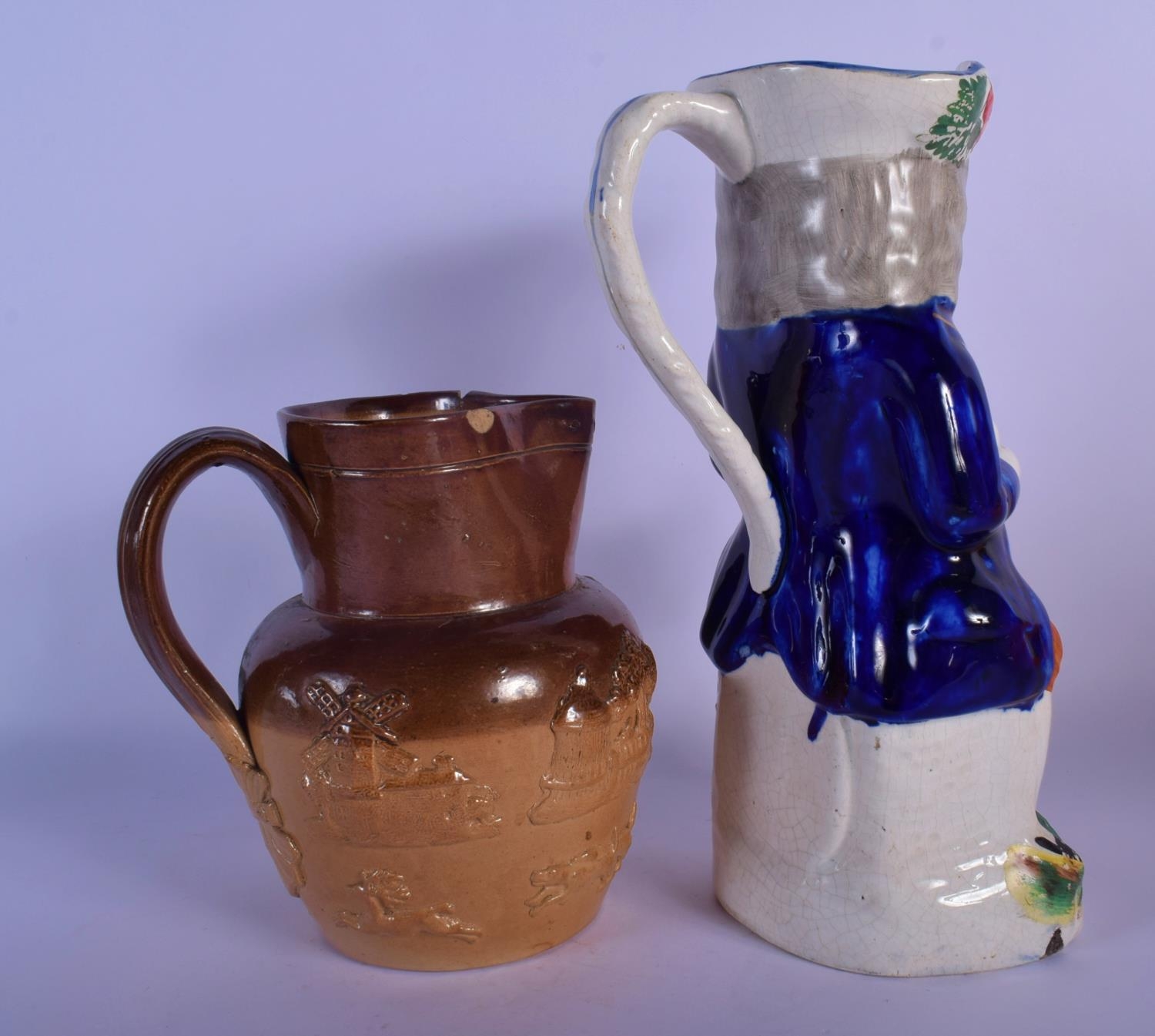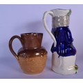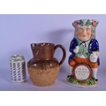 A RARE LARGE 19TH CENTURY ENGLISH HOME BREWED ALE CHARACTER JUG together with a stoneware jug. Largest 29 cm high. (2)
