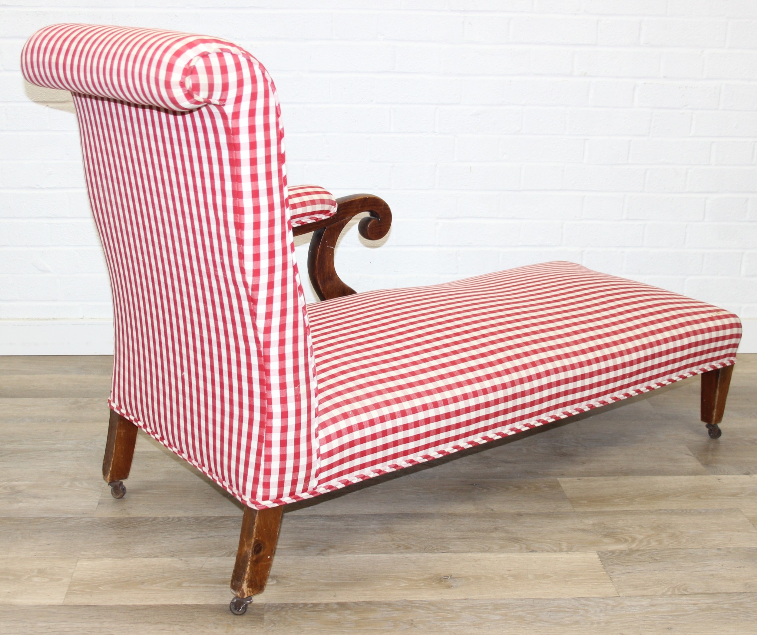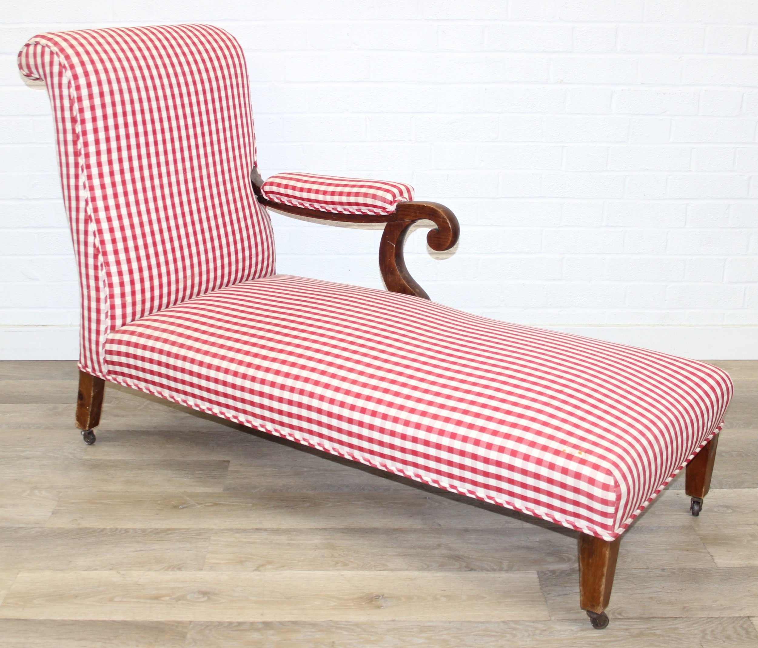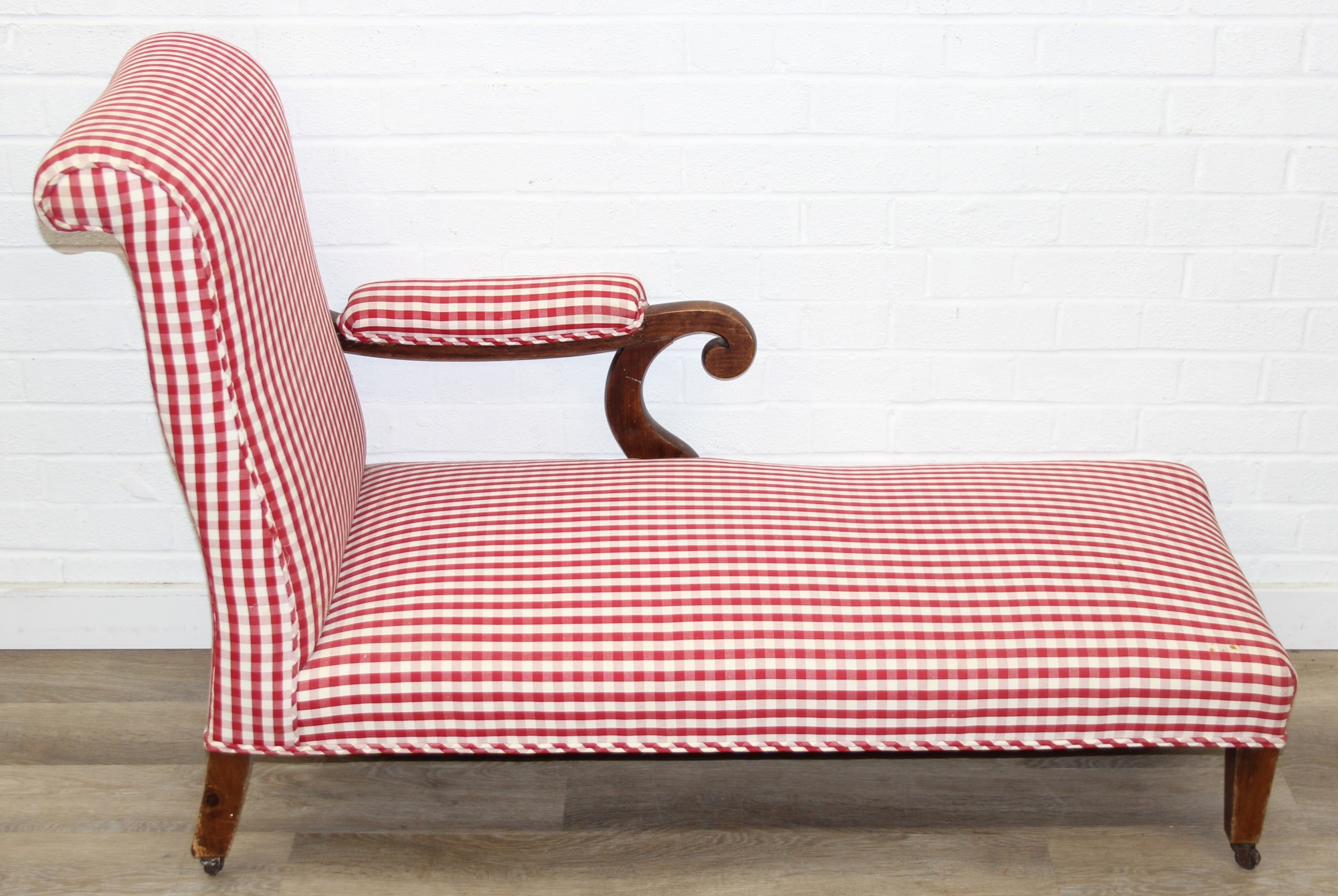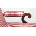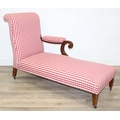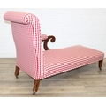 An antique mahogany chaises longue with exposed frame and red gingham upholstery, 130cm x 60cm x 90cm
