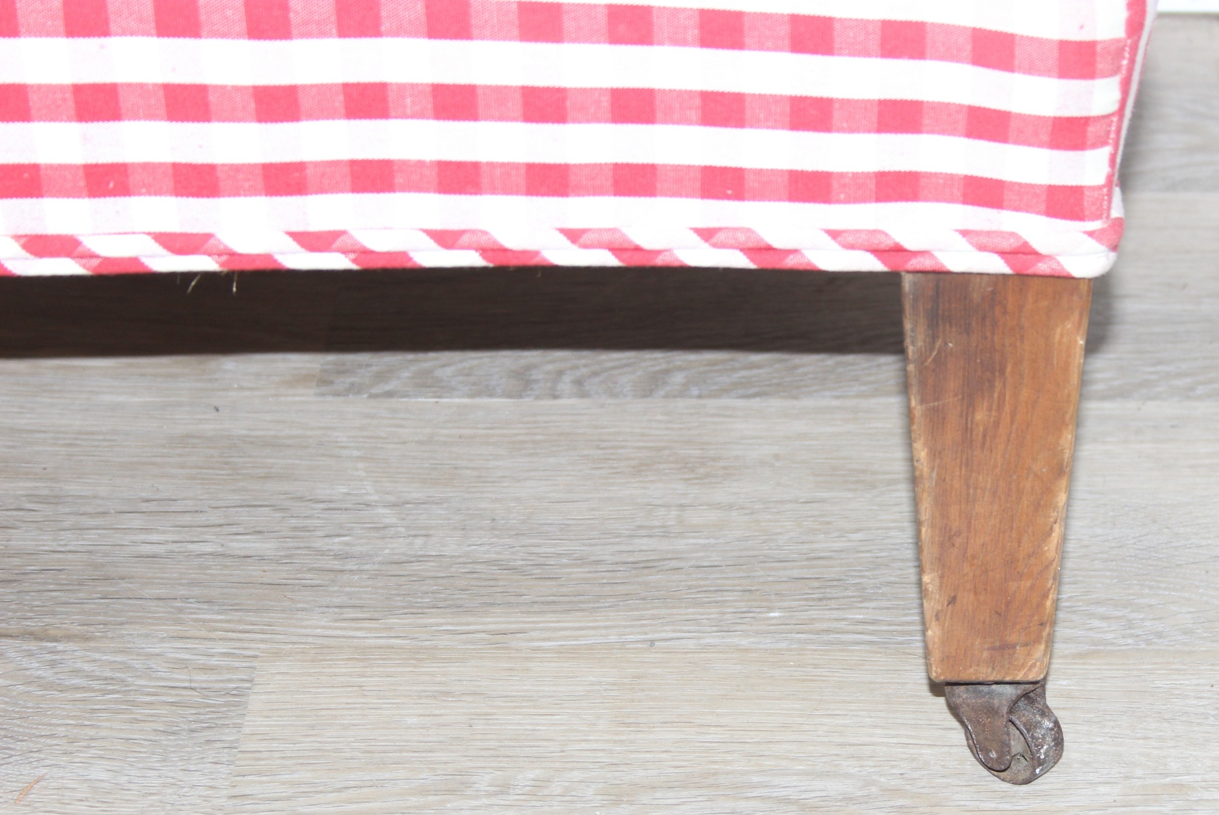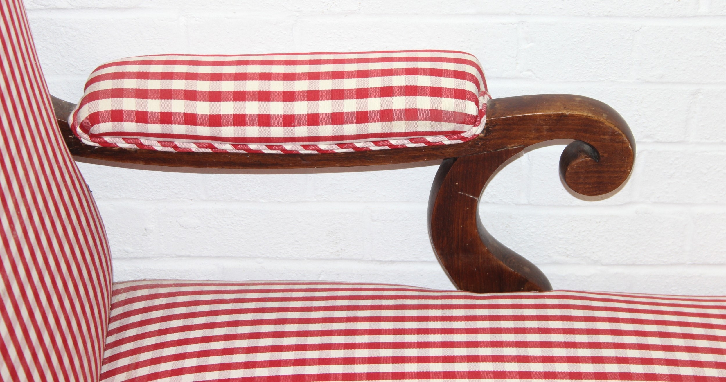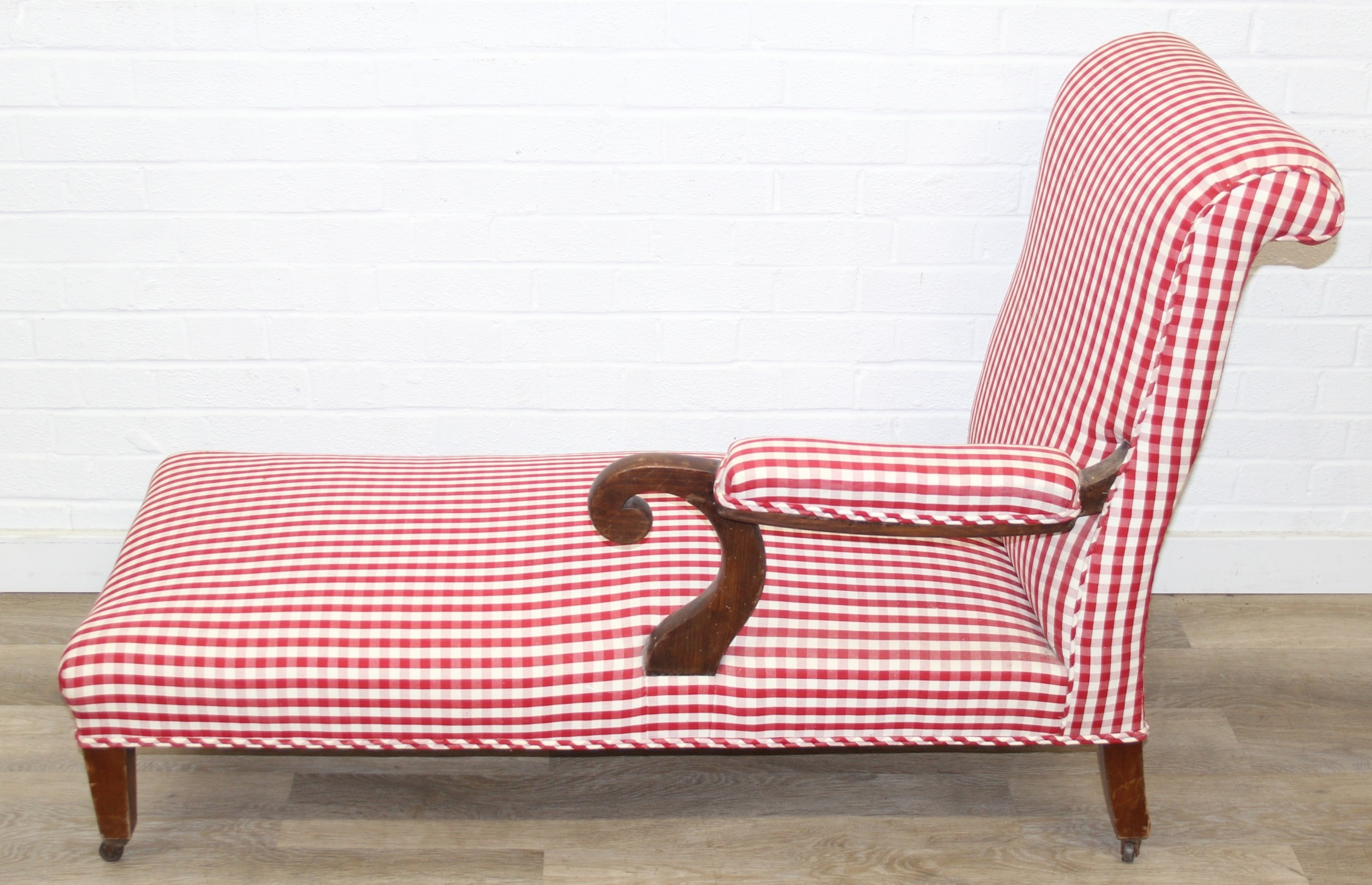 An antique mahogany chaises longue with exposed frame and red gingham upholstery, 130cm x 60cm x 90cm