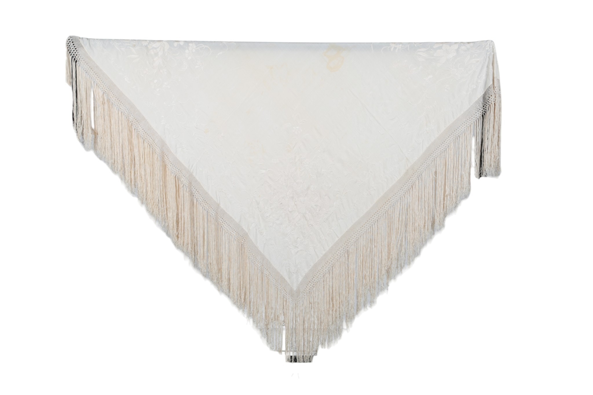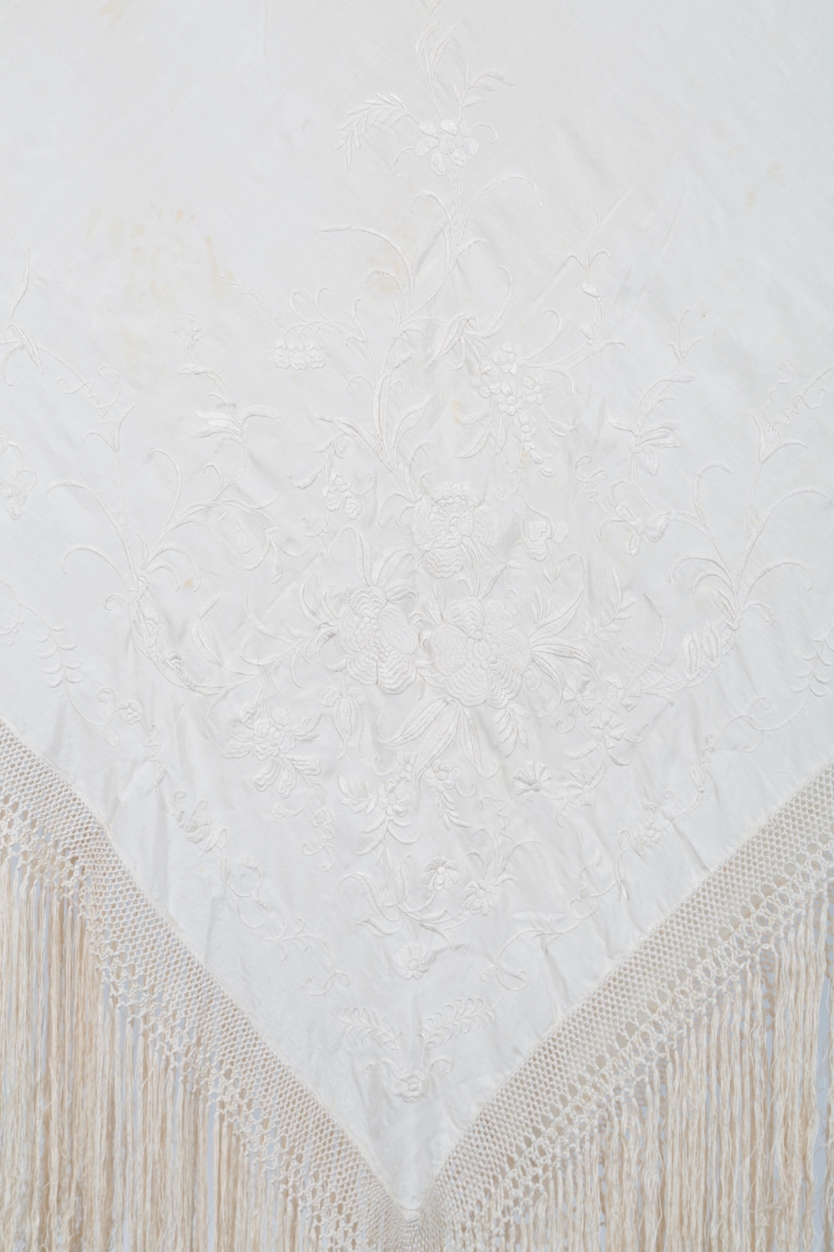 A late 19th / early 20th century large Chinese cream silk floral embroidered shawl with silk fringing, 158cm x 152cm.