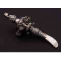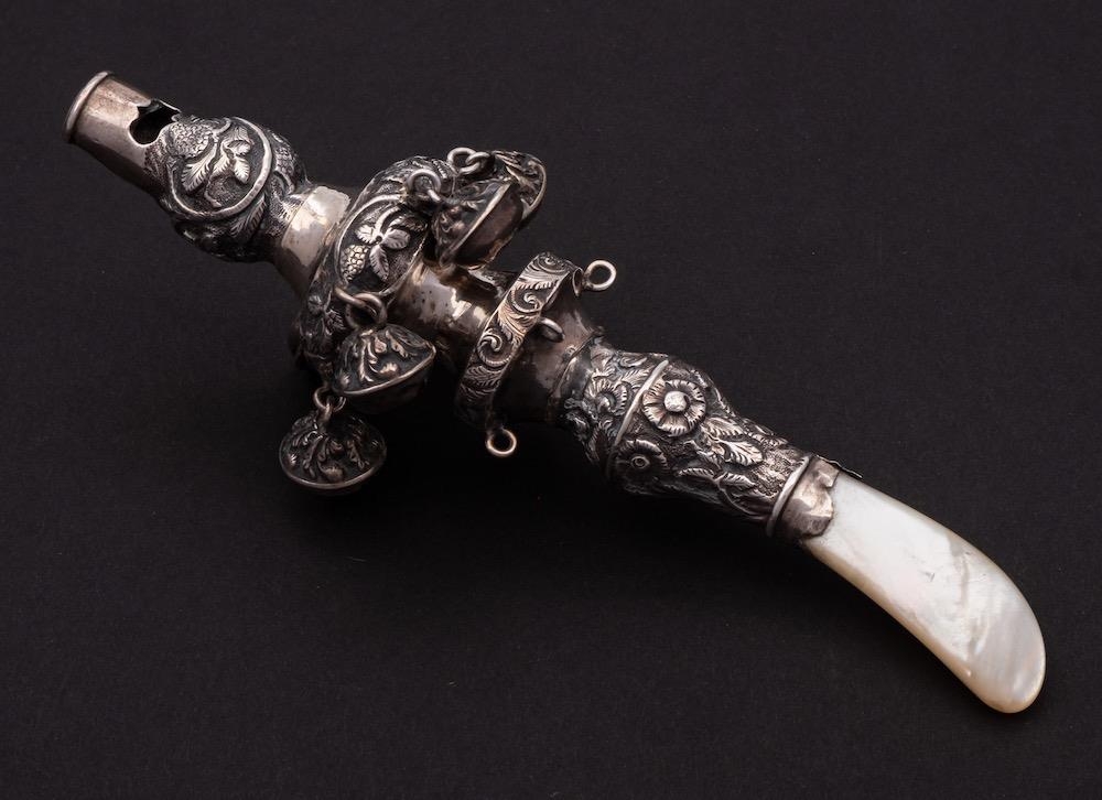 A William IV silver child's rattle, maker Francis Clark, Birmingham, 1835: with whistle , knopped cylindrical body with embossed foliate decoration, six bell suspensions to one knop and four missing bells to the other knop, having a mother-of-pearl teether, 15cm. long