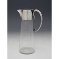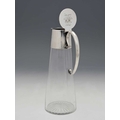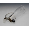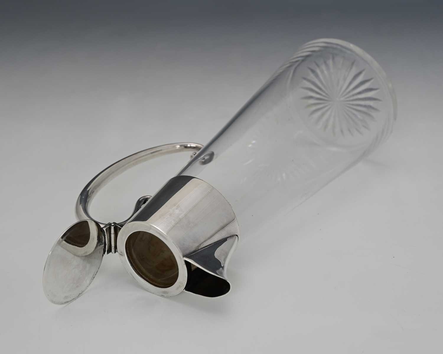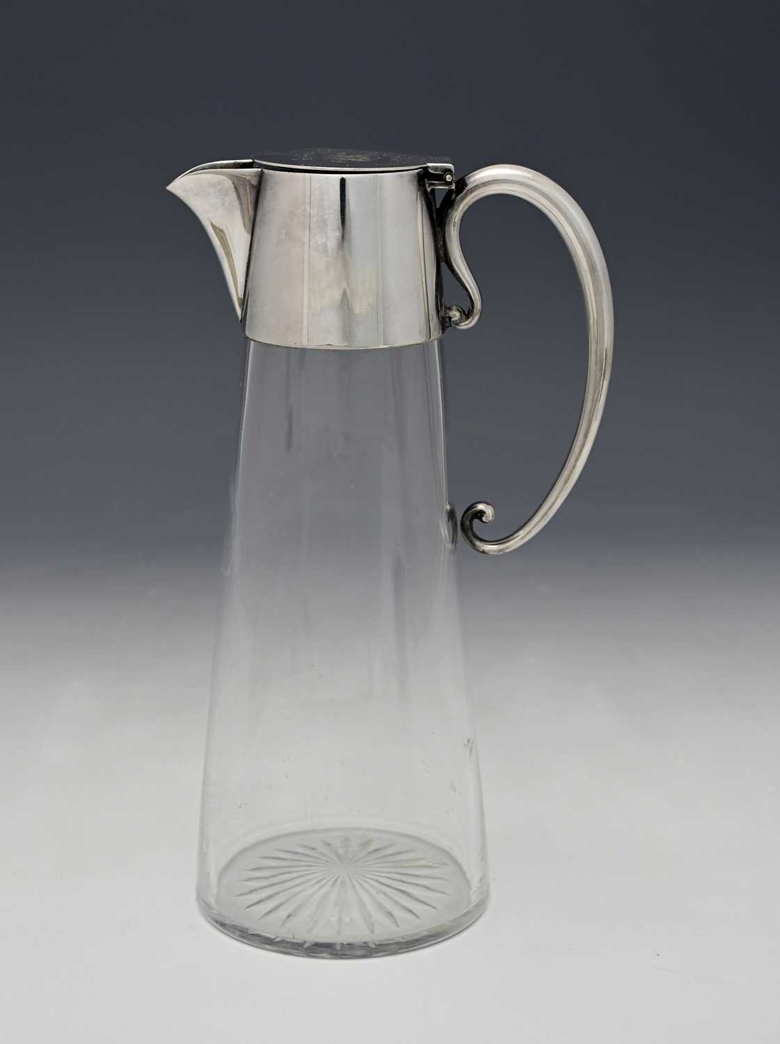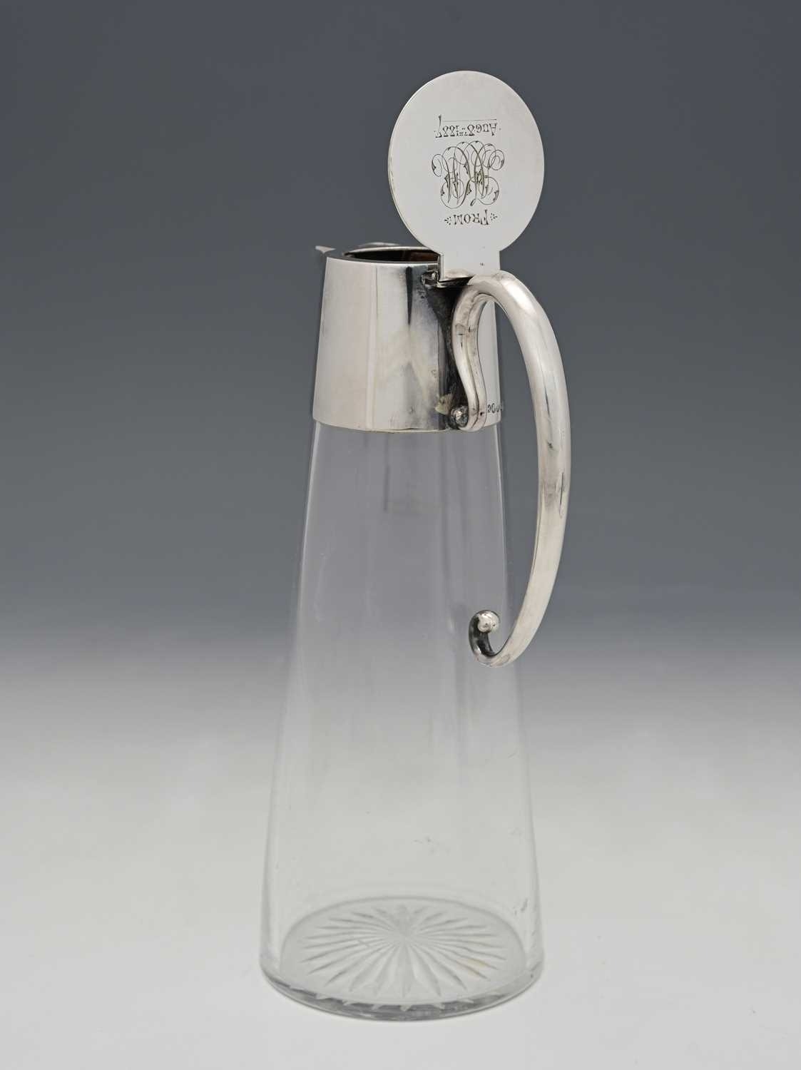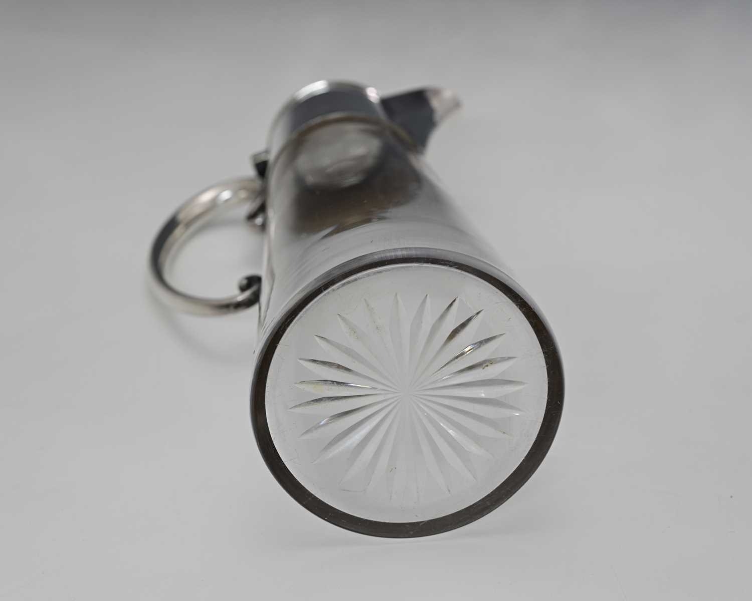 Christopher Dresser for Hukin and Heath, an Aesthetic Movement silver plate mounted glass claret jug, model 2475, circa 1885, the conical body with plain collar and coiled tendril C scroll handle, flat lid, engraved date 1887, 24.5cm high