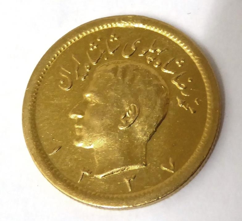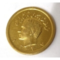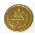 Iranian Gold Coin with Arabic script, reverse with lion holding sword under crown with wreath, approx. 21mm dia.