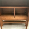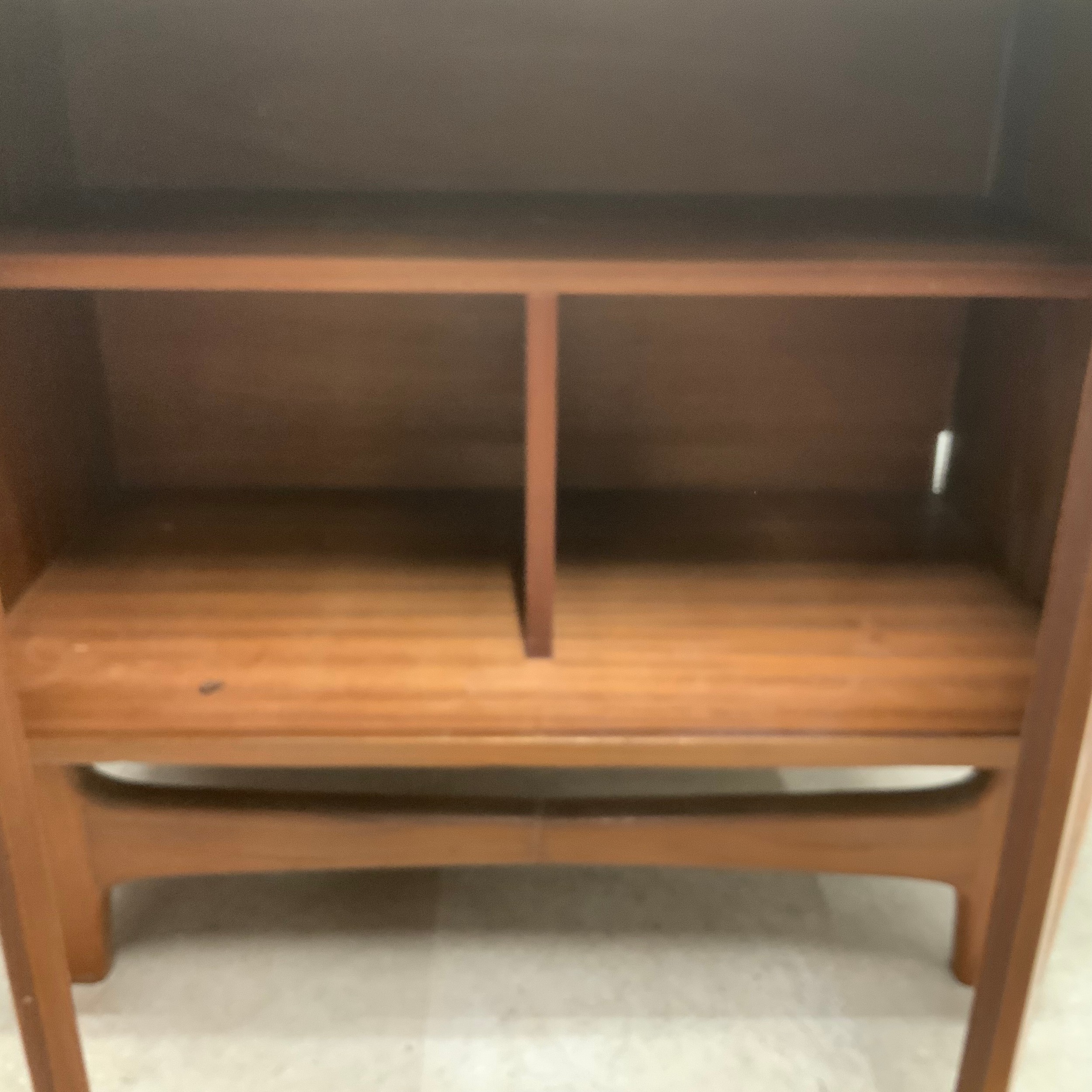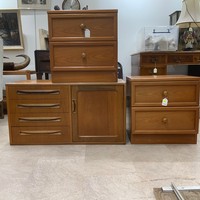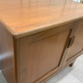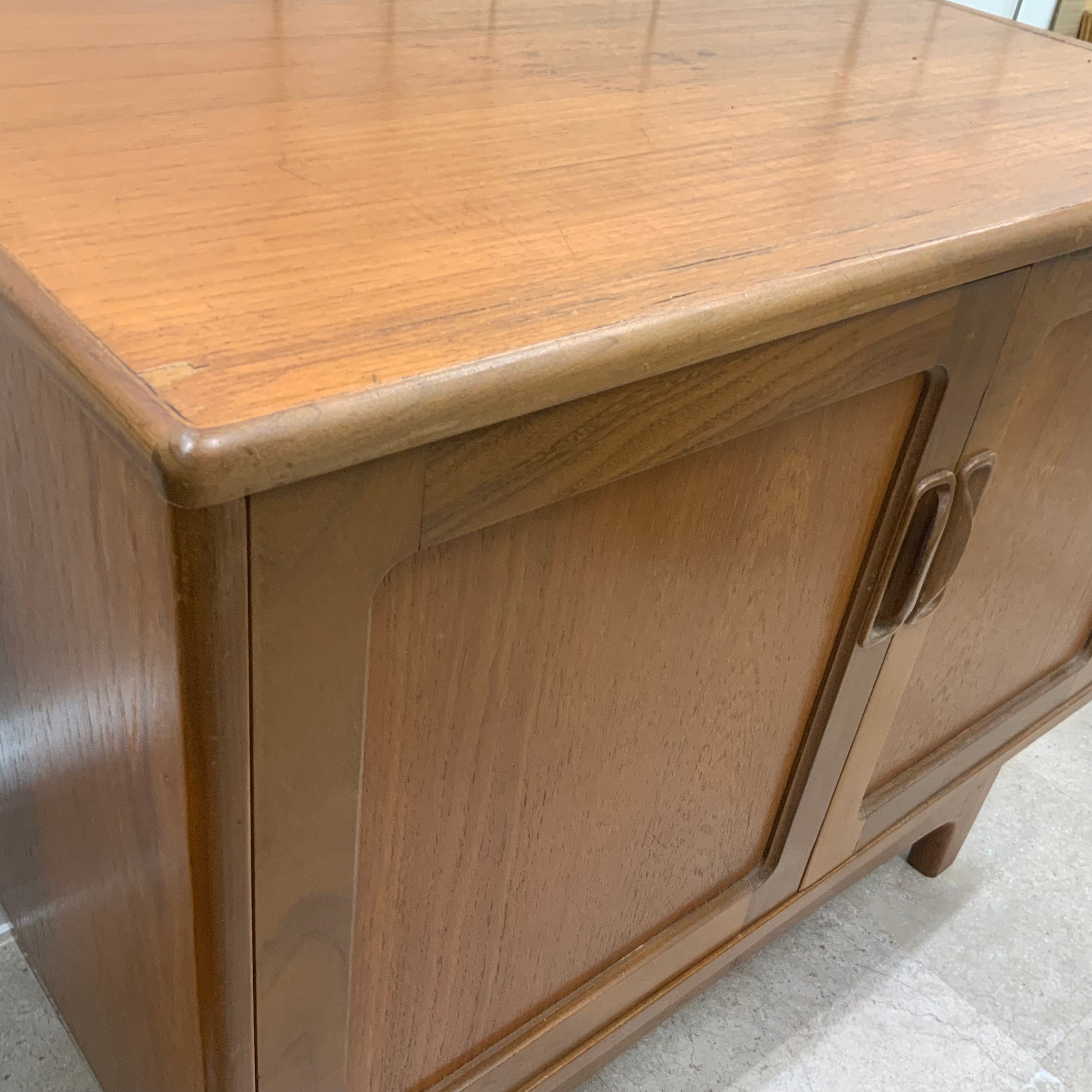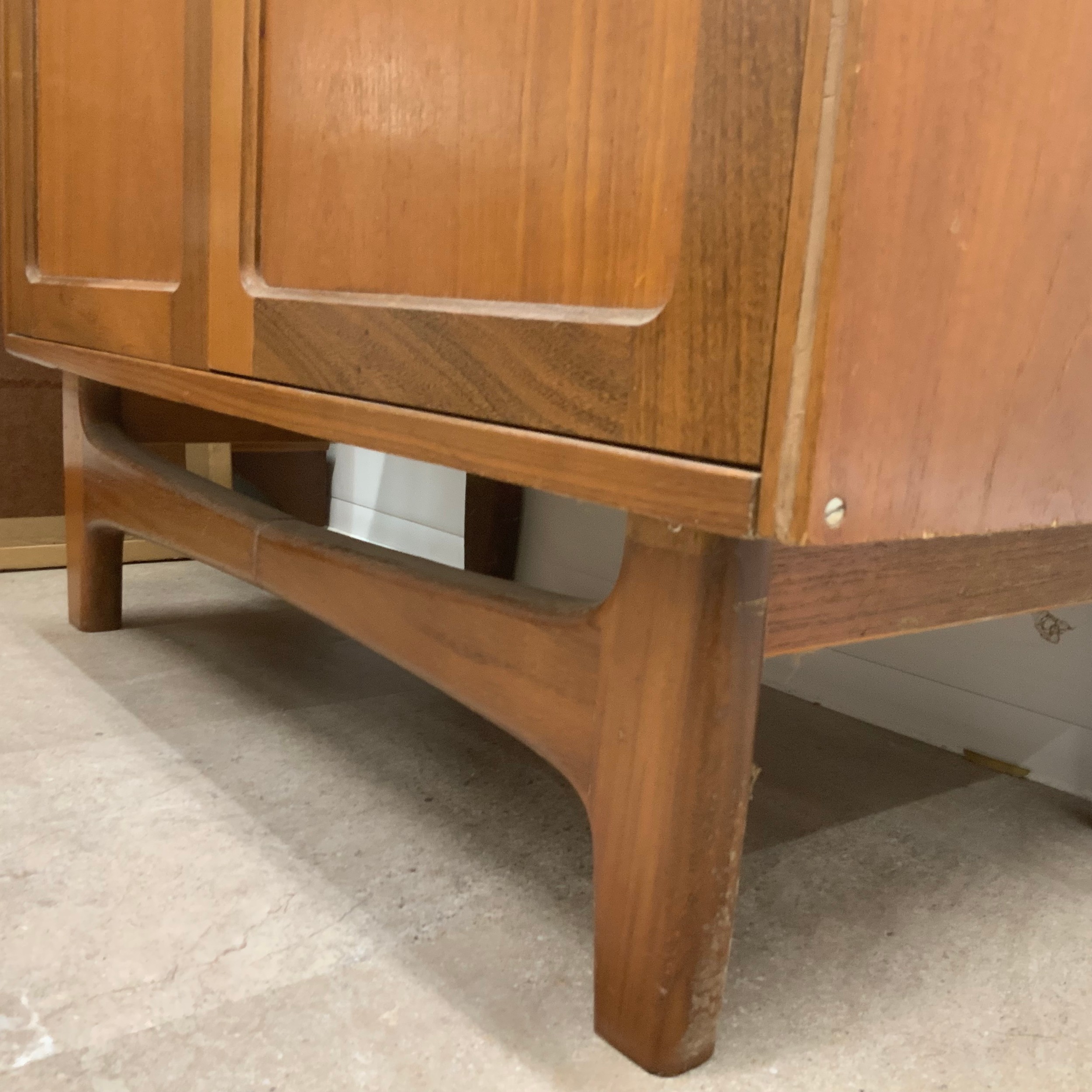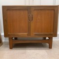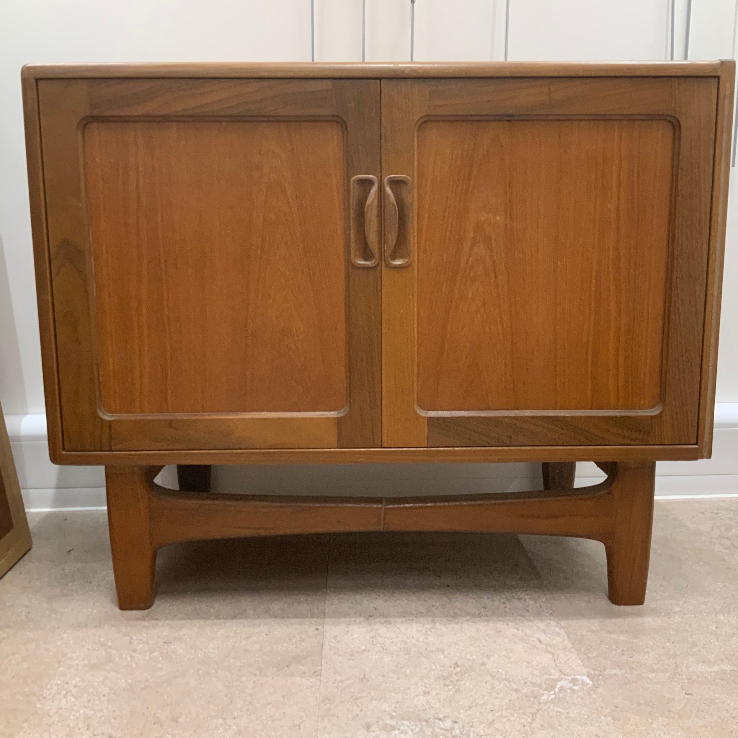G Plan two-door sideboard of small proportion, the doors enclosing a single shelf, raised on short tapering supports united by a front and rear stretcher, H69cm x W83.5cm x D45.5cm