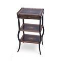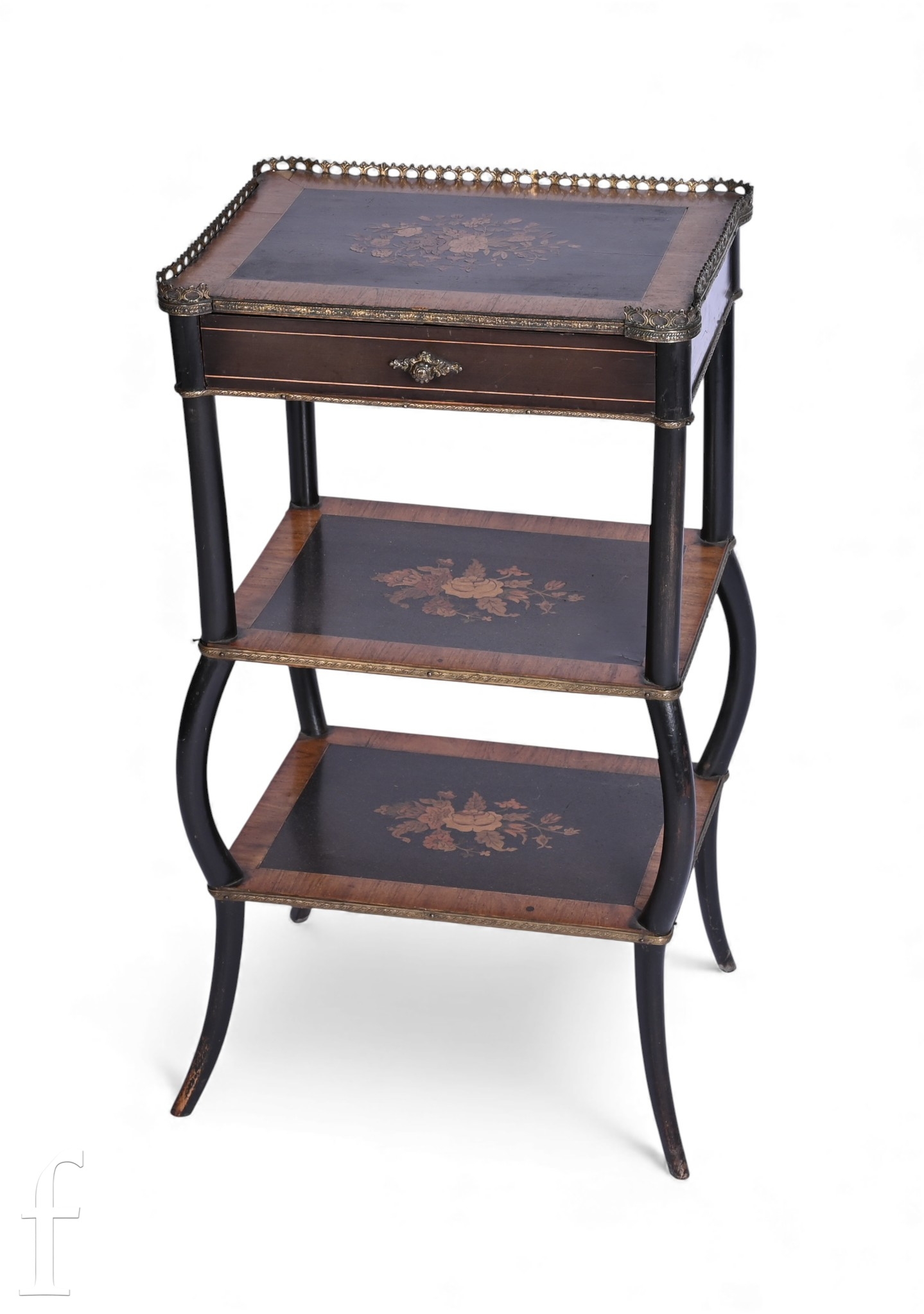 A late 19th Century marquetry inlaid three tier etagere, the brass gallery top over a single drawer on shaped slender legs united by two undertiers, height 72cm x depth 29cm x width 39cm.