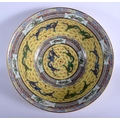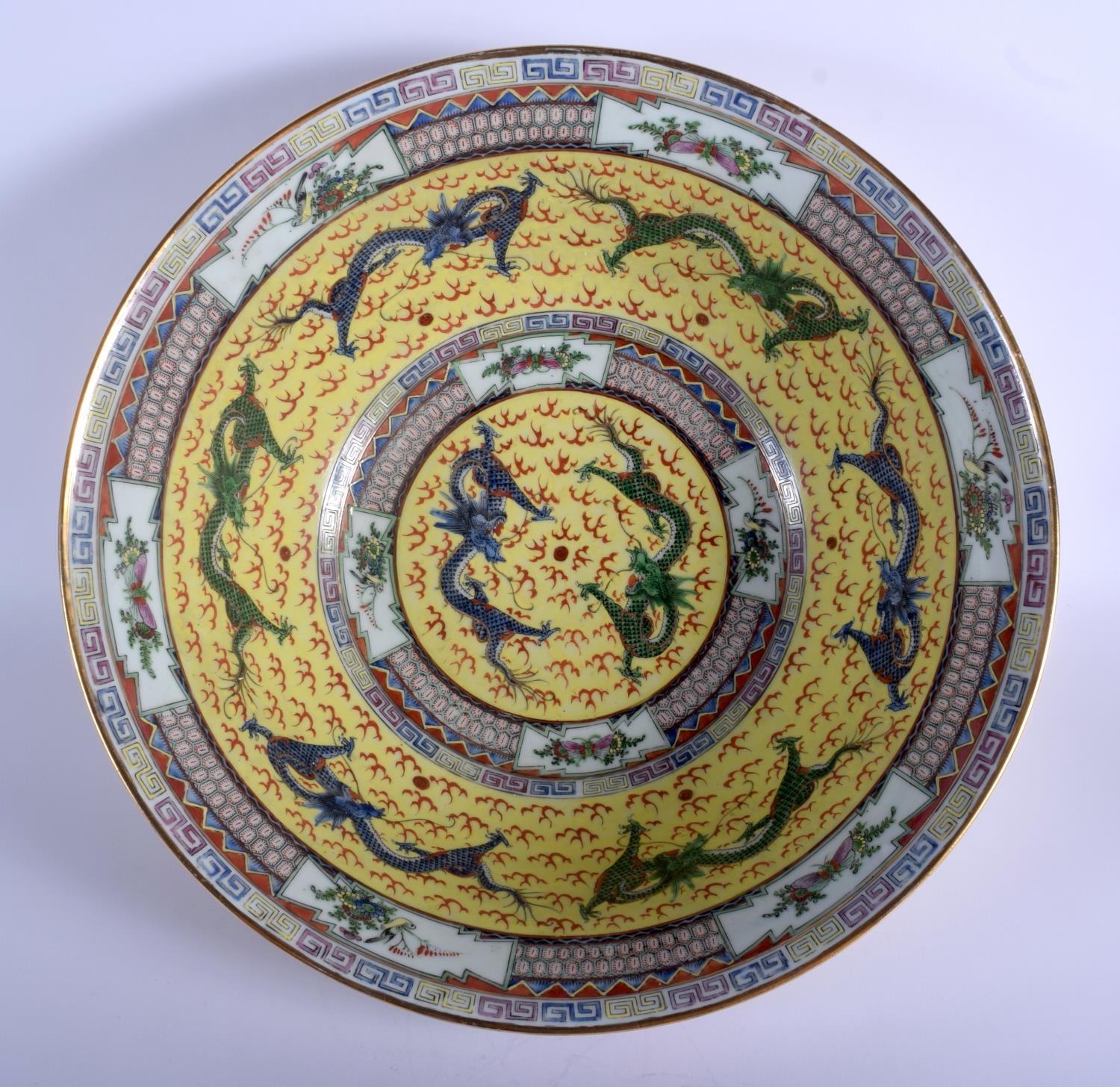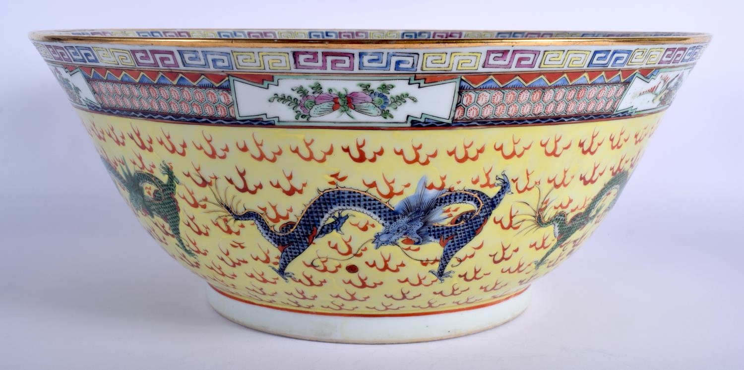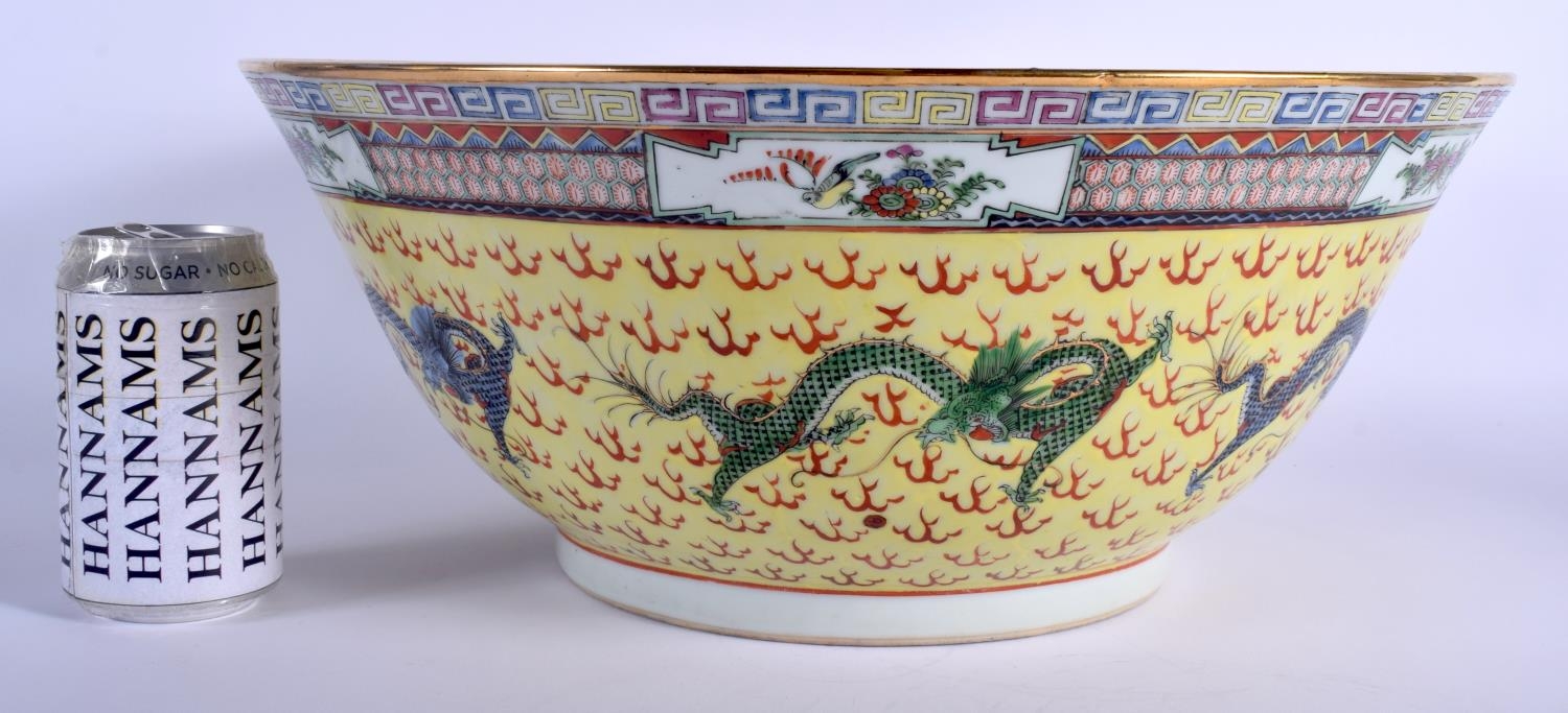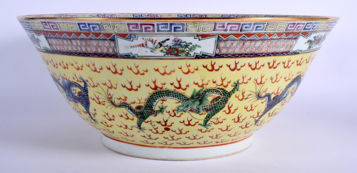 A LARGE EARLY 20TH CENTURY CHINESE FAMILLE JAUNE BOWL Qing/Republic, painted with dragons amongst clouds. 37 cm x 17 cm.