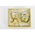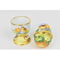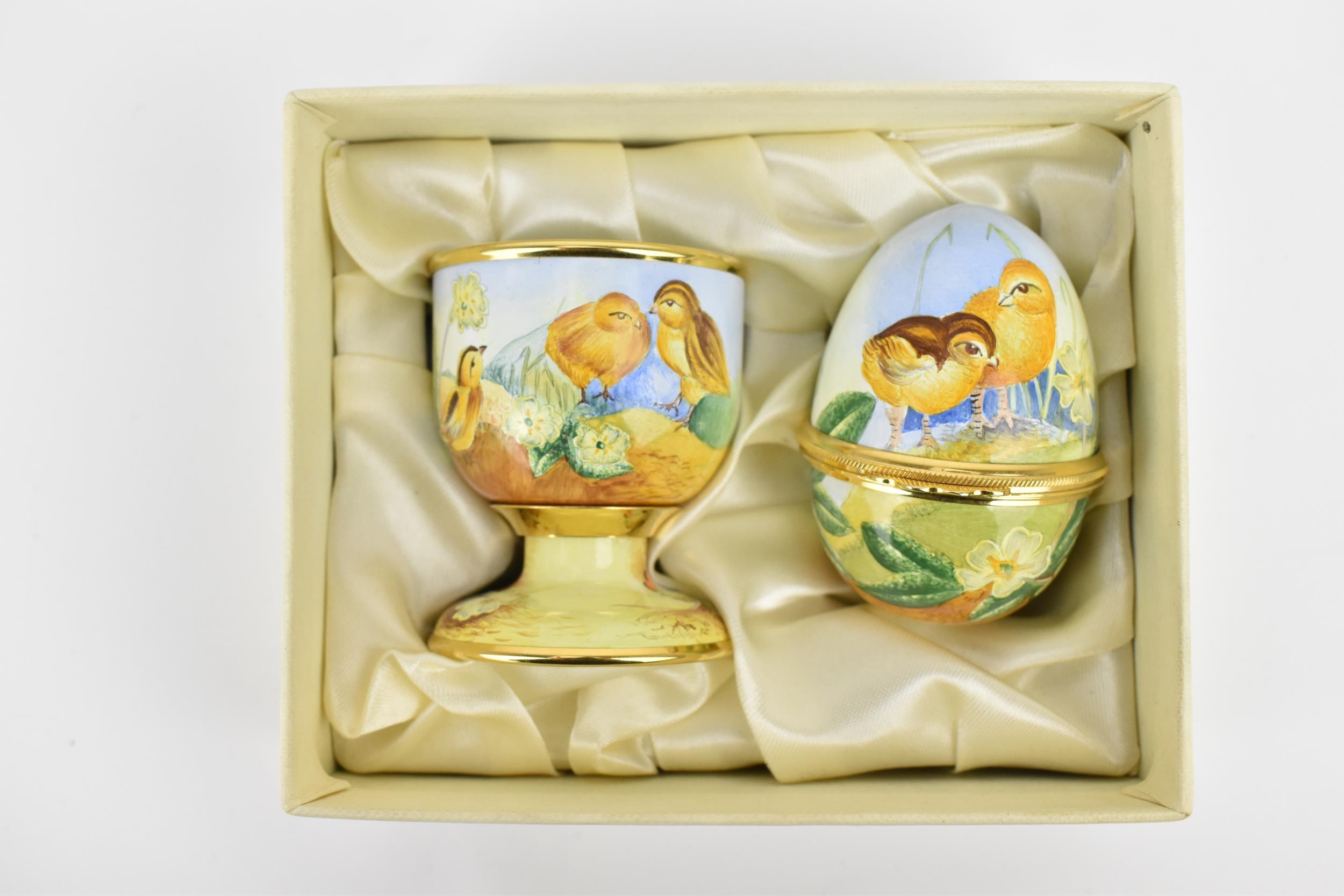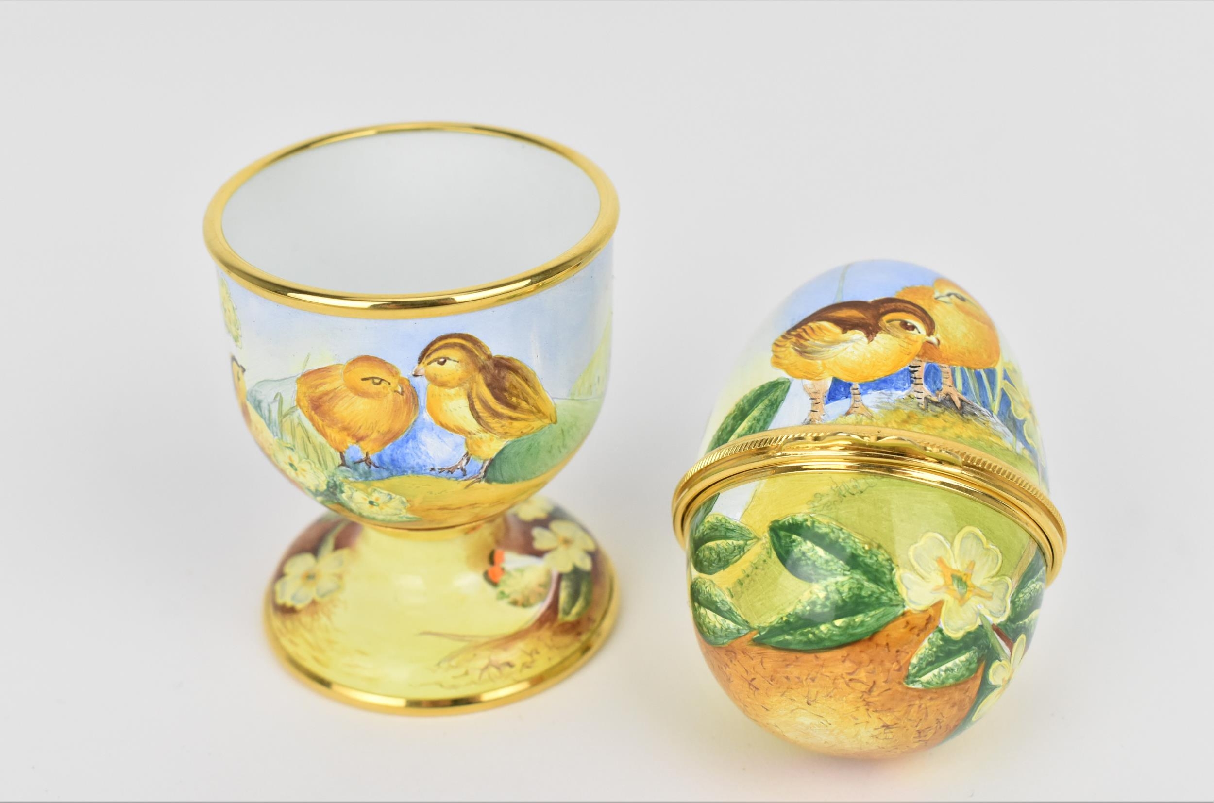 A limited edition Moorcroft Enamels Ltd 'First Steps' egg cup and hinged egg painted by Marie Graves depicting chicks in a garden, in original box, no. 21/50, with certificate