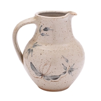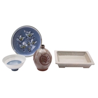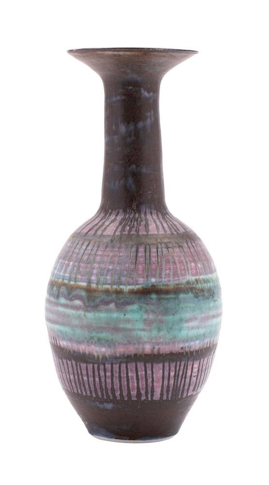 *Marianne de Trey [1913-2016] a porcelain vase, of oviform with raised and flaring neck with 'knitted' decoration on a lilac and turquoise banded ground, incised dTe, 20cm high.