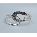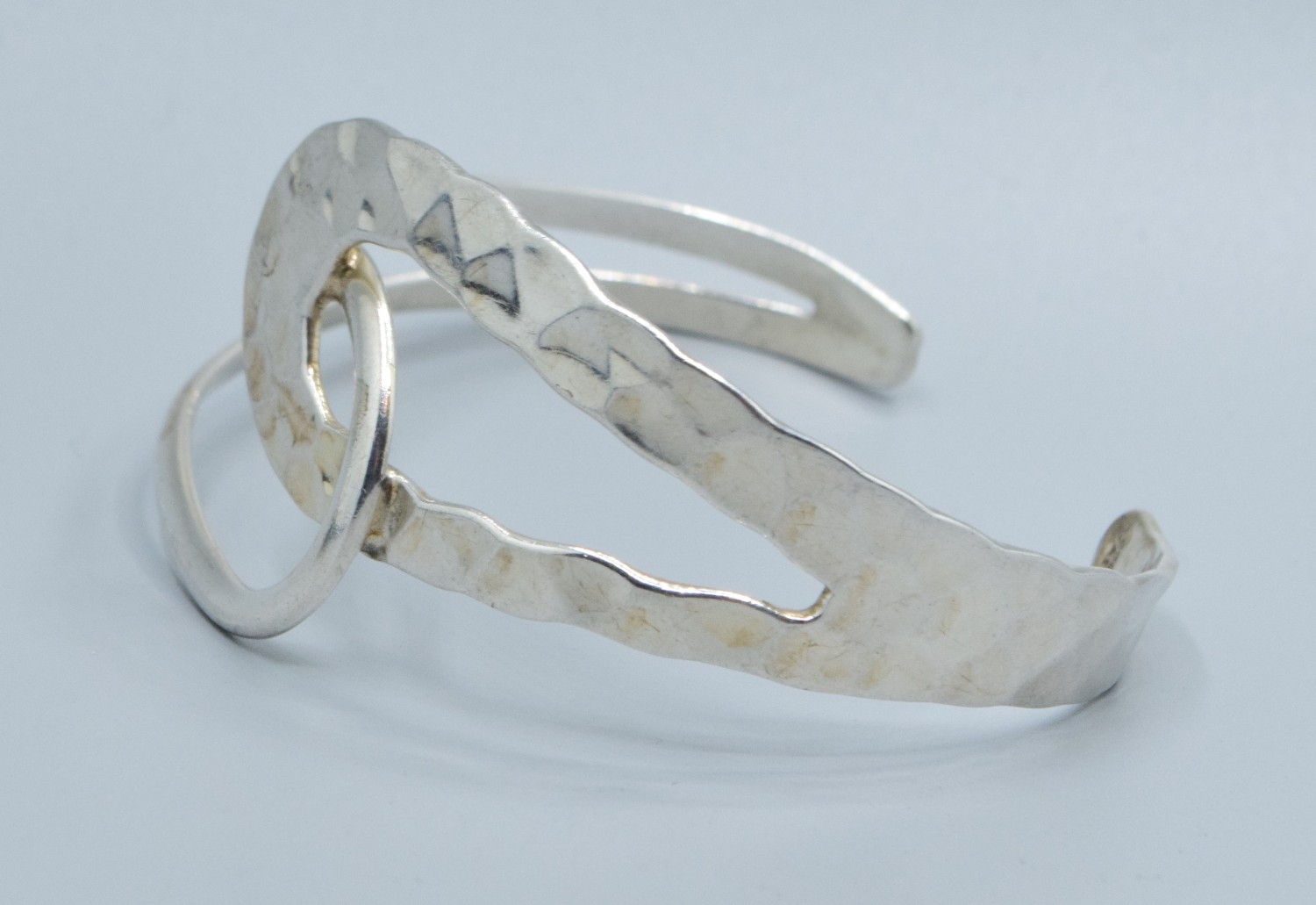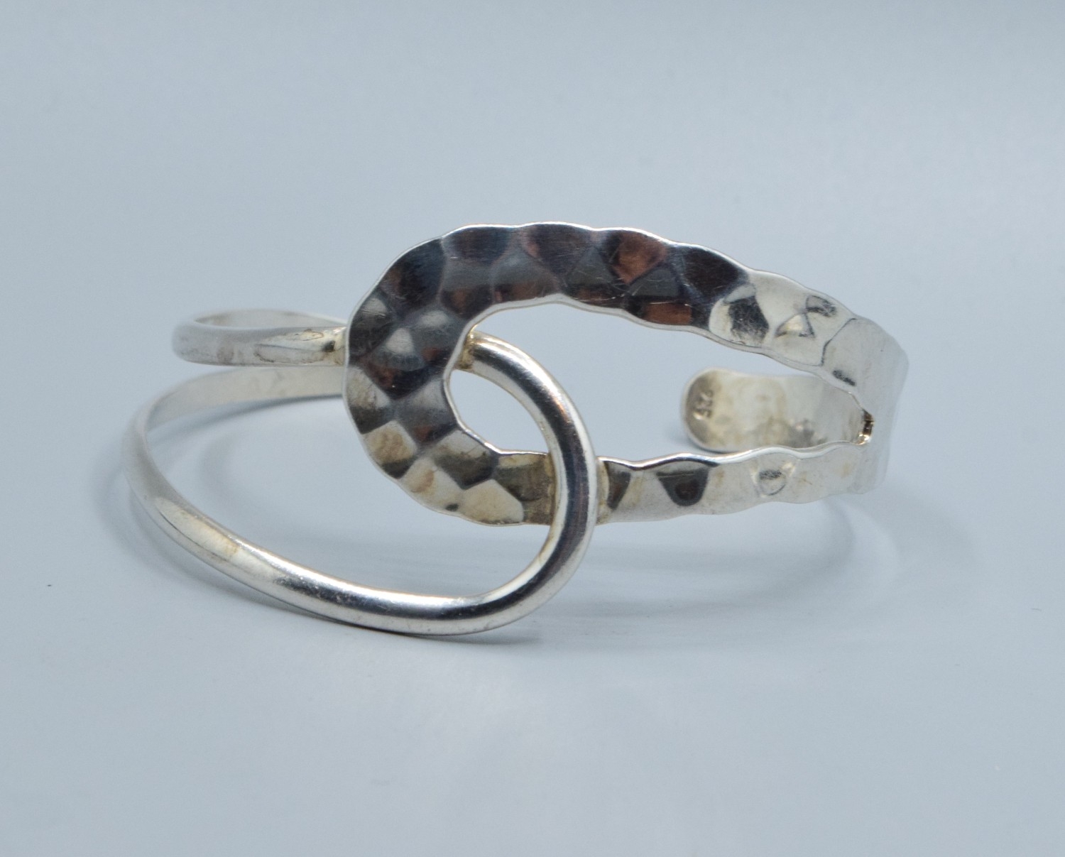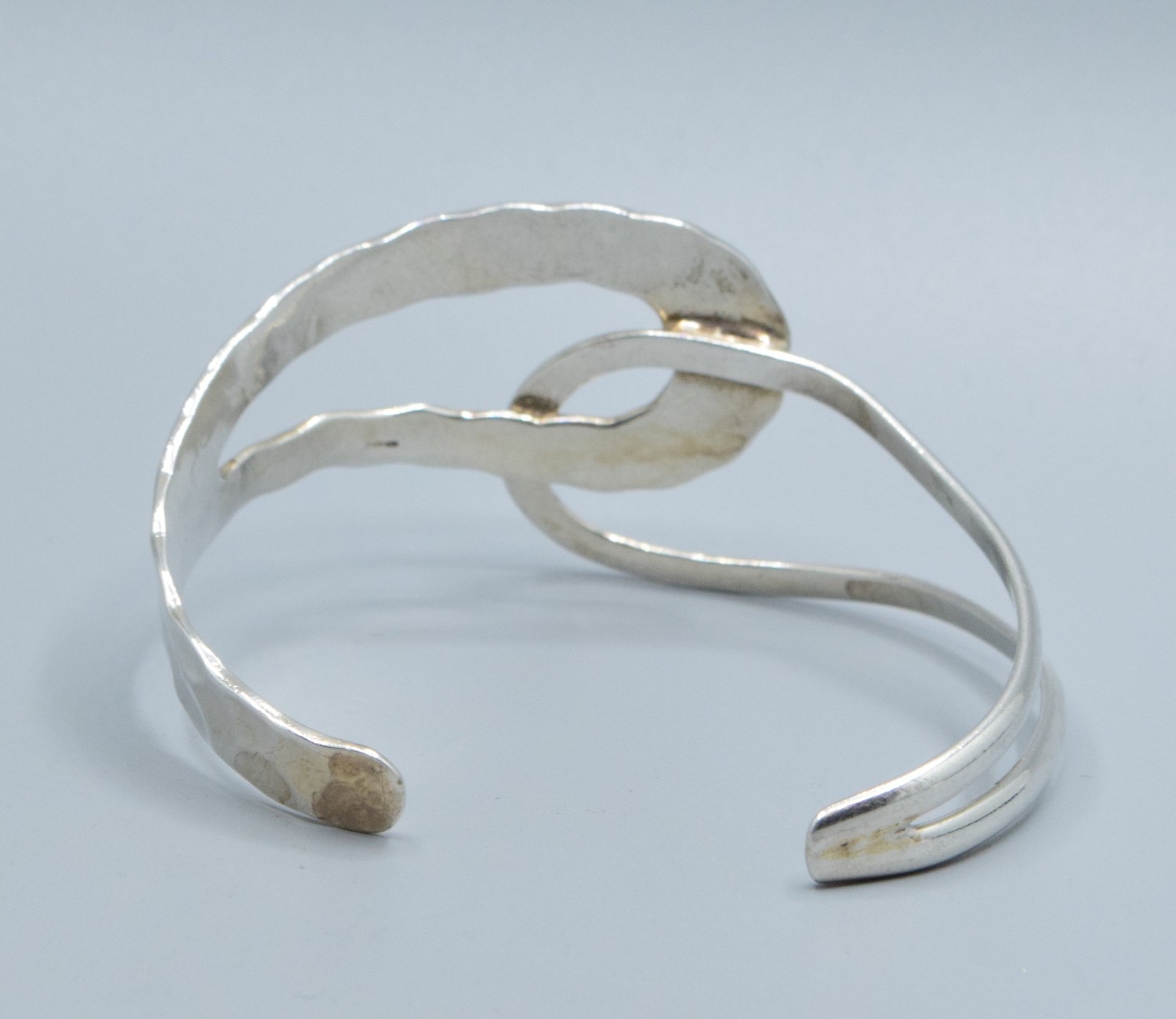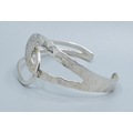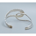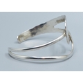925 silver open double twist bangle with one side planished the other plain, 6cm internal diameter 3.5cm at widest point
