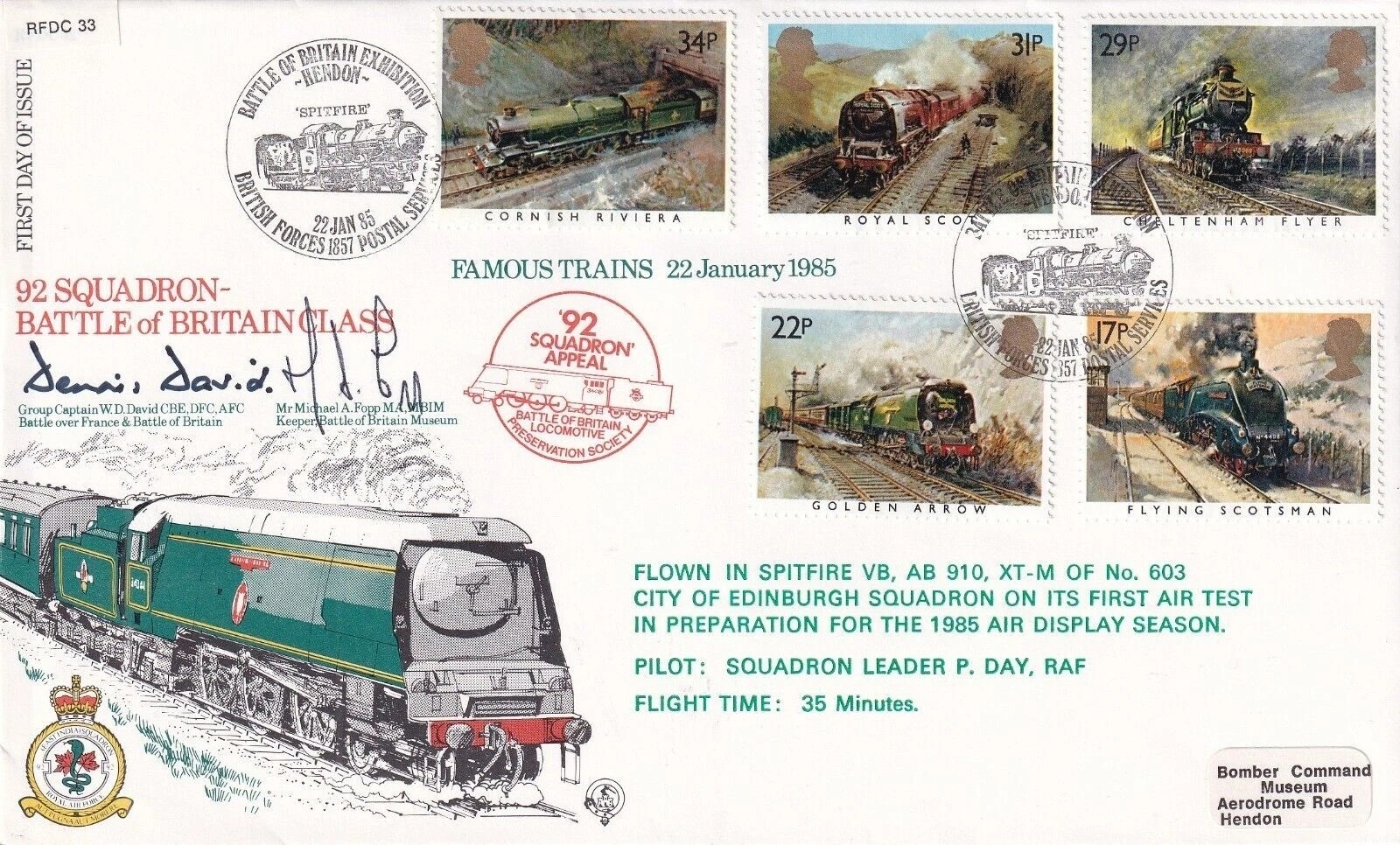 RFDC33 Famous Trains Signed by Gp Capt Dennis David Battle of Britain Pilot. 22 Jan 85 BFPS 1857 - Famous Trains flown in Spitfire with added Red Cachet 92 Squadron appeal Battle of Britain Locomotive Preservation Society. Personally Signed by Group Captain Dennis David Battle of Britain fighter pilot with 87 and 213 Sqds. WW11 Ace 15, and Mr Michael Fopp Keeper of Battle of Britain Museum. Single Vendor RAF cover collection. Good condition. All autographs come with a Certificate of Authenticity. We combine postage on multiple winning lots and can ship worldwide. UK postage from £5.99, EU from £7.99, Rest of World from £9.99