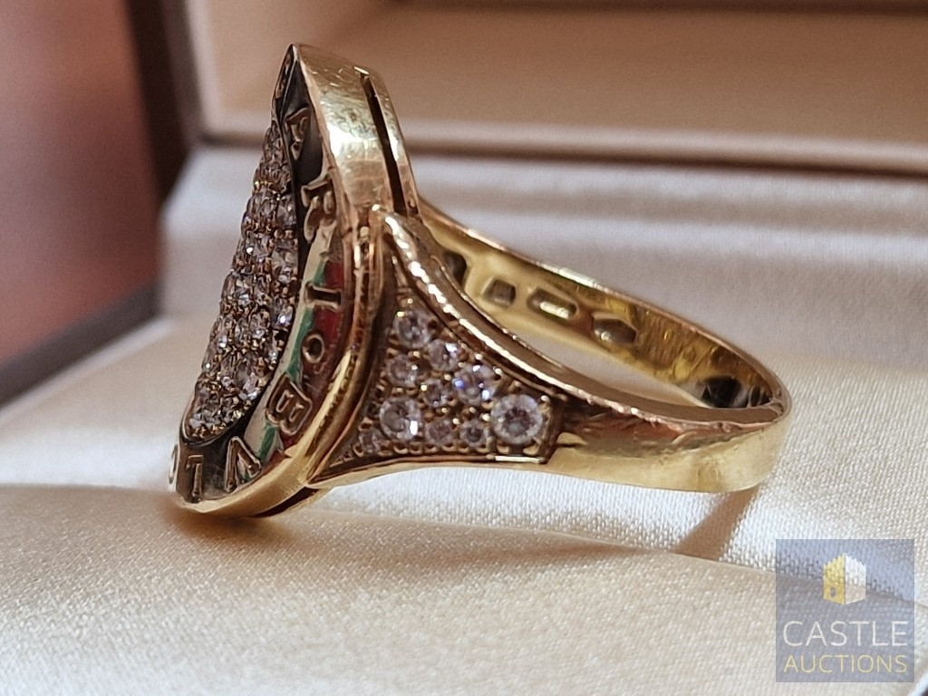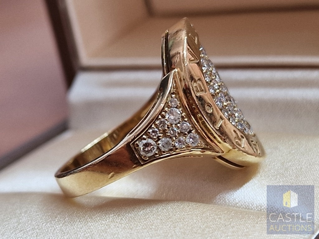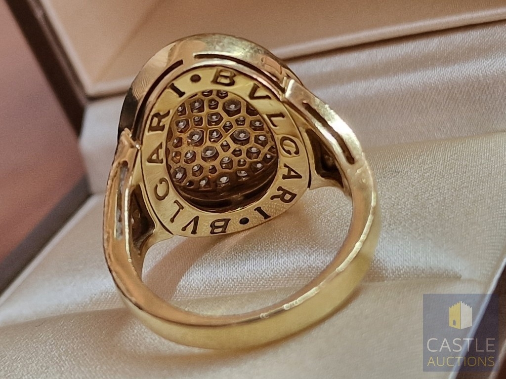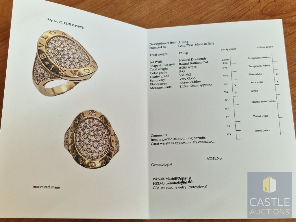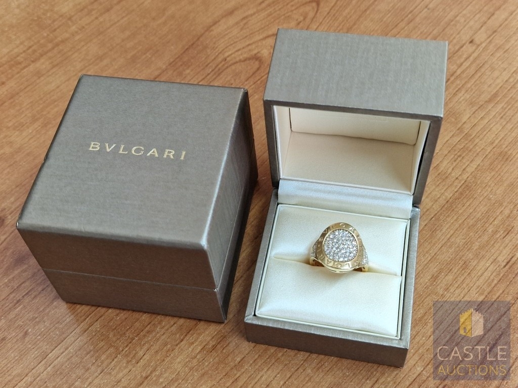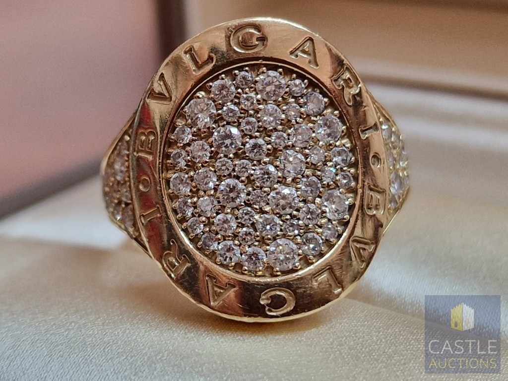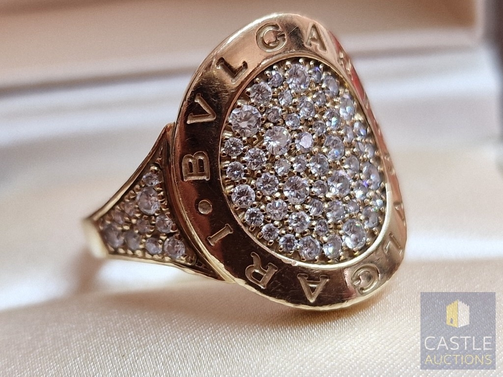 Stunning BVLGARI 18ct Gold & Pave Set Diamond Ring; The Central Curved Oval Shape Motif is Pave Set with Diamonds and Bordered by 'BVLGARI • BVLGARI' Designer Brand Name, with Further Diamond Set Shoulders, Made in Italy, (Approx. Size: P, Total Weight: 12g, 69 x Round Brilliant Cut Diamonds Circa 0.95tcw, VS1/VS2, Colour F-G), Together with Gemologists Appraisal