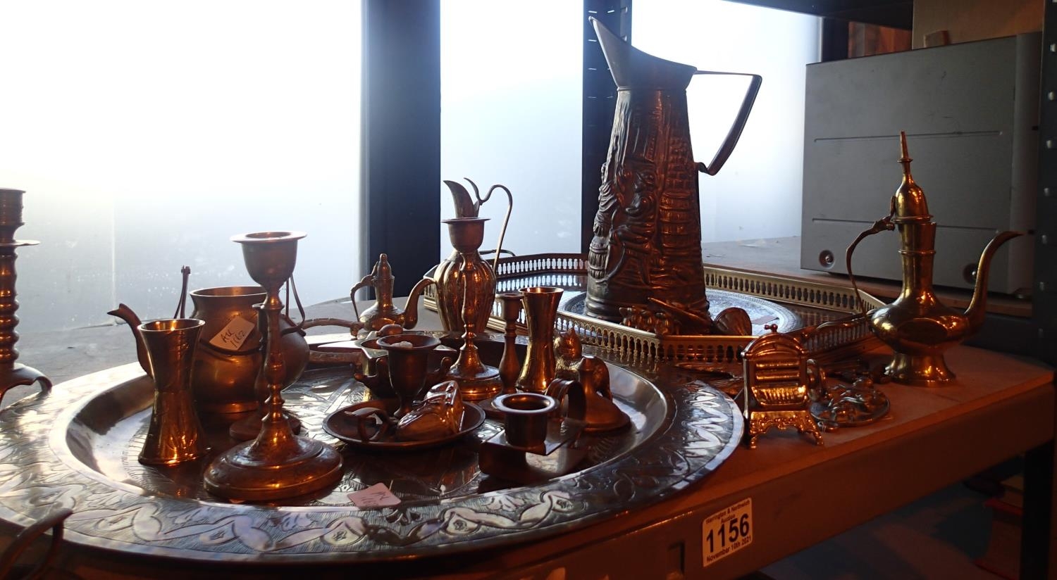 Collection of mixed brassware to include a large embossed jug. Not available for in-house P&P, contact Paul O'Hea at Mailboxes on 01925 659133