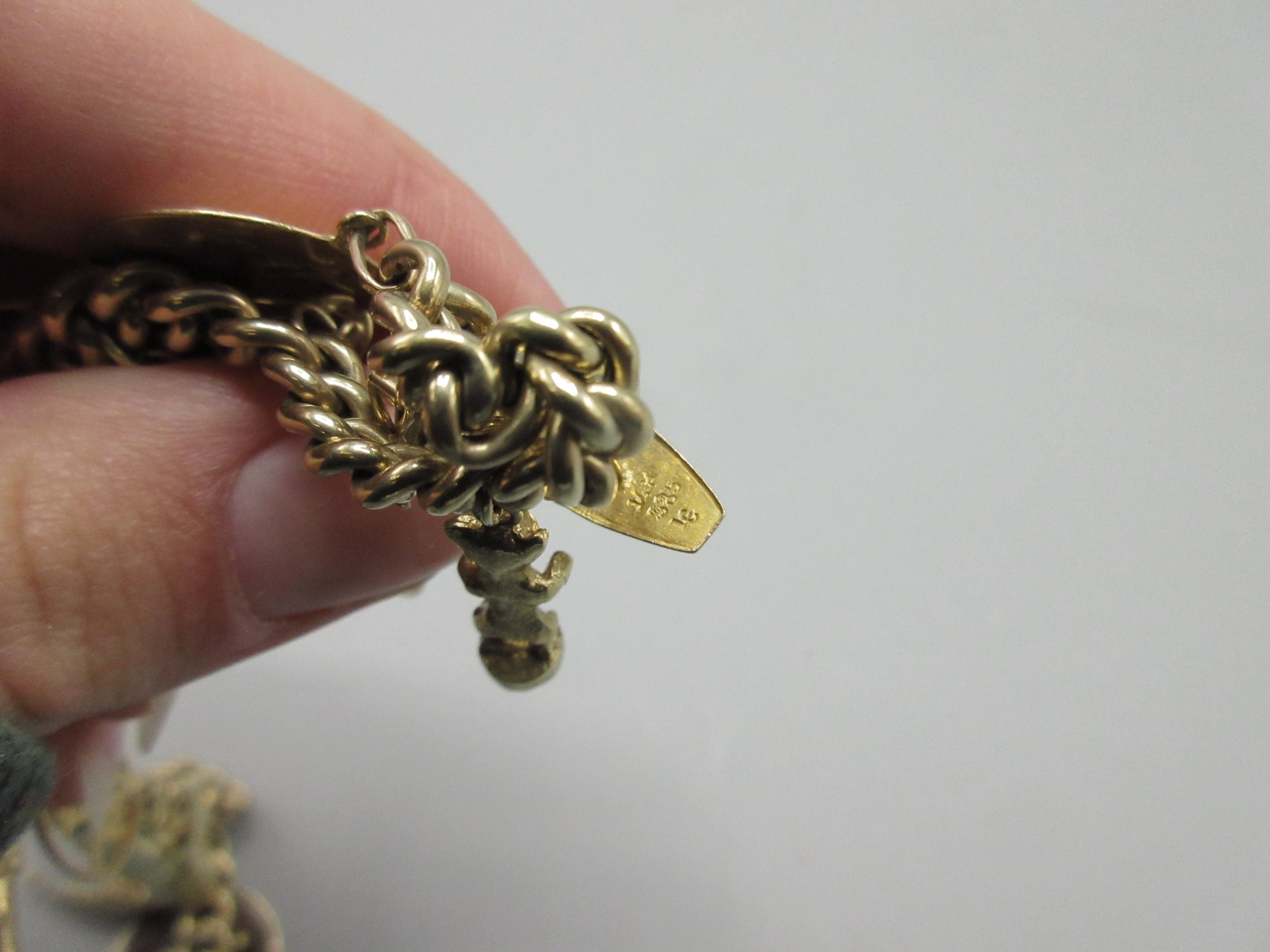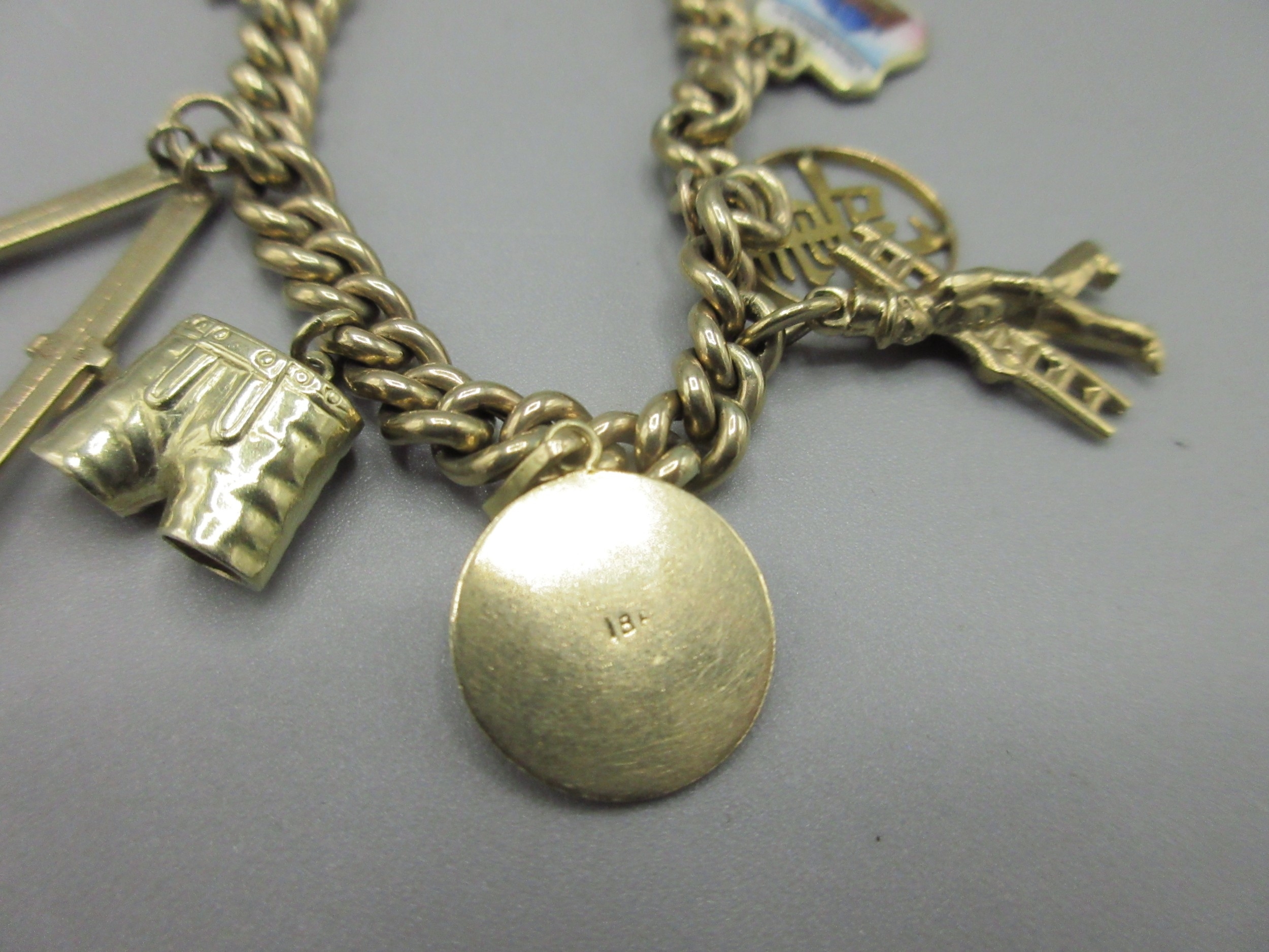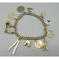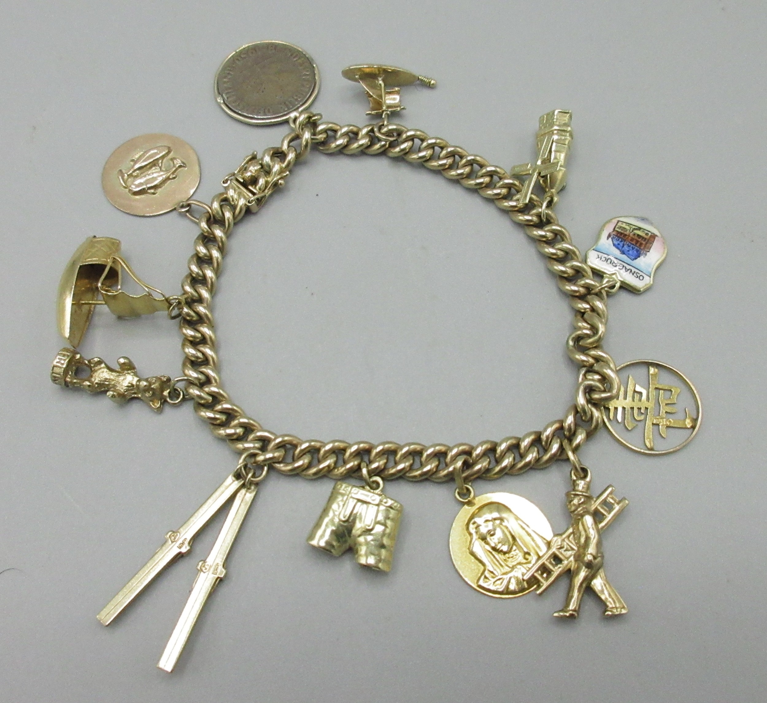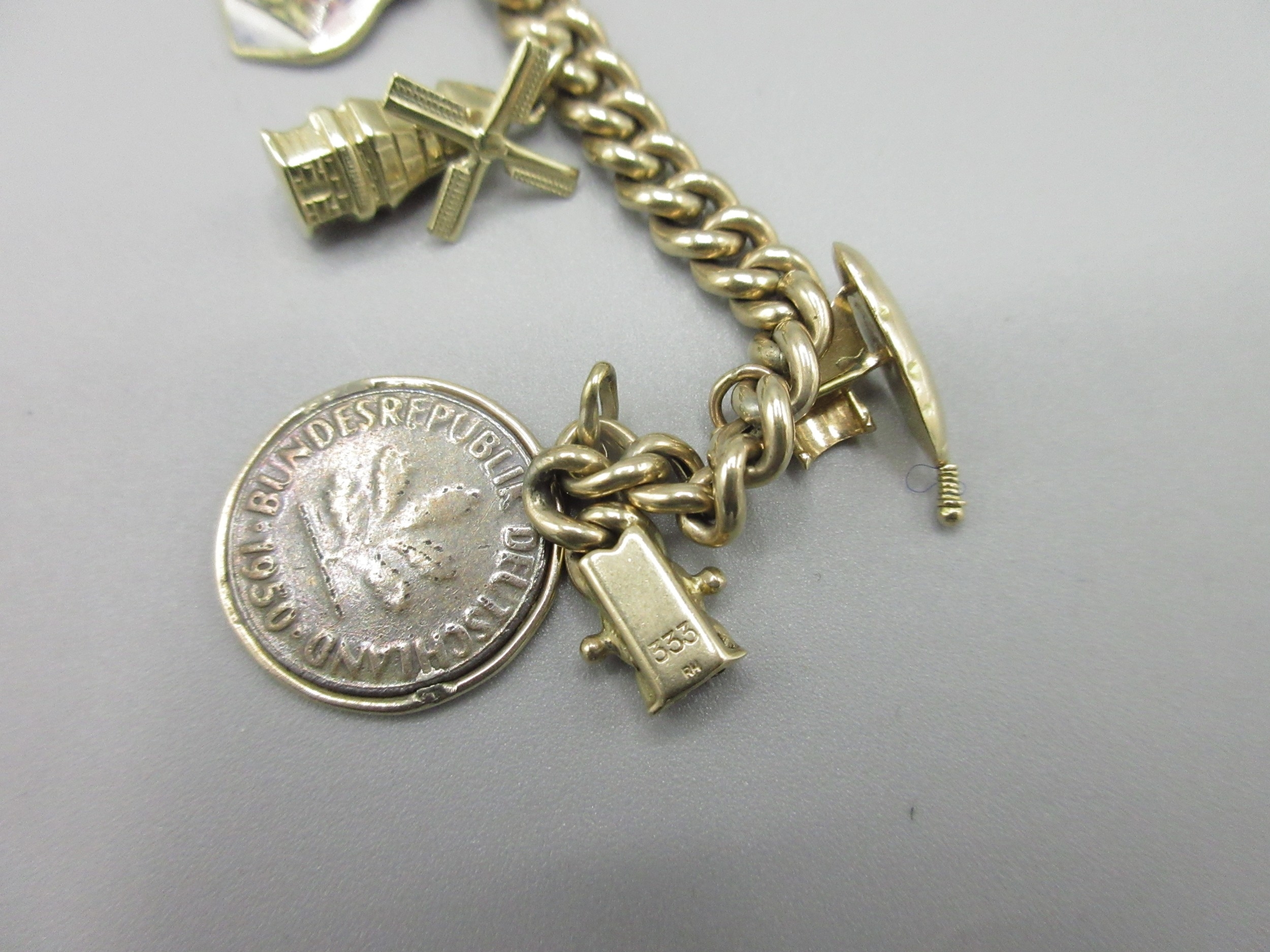 8ct yellow gold charm bracelet, stamped 333, with a selection of charms stamped at 14ct, 18ct or unmarked, gross 21.4g