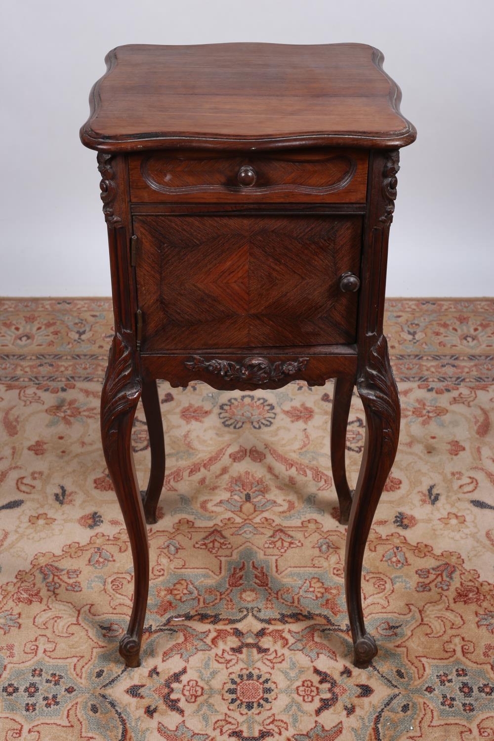 A CONTINENTAL KINGWOOD PEDESTAL of serpentine outline with frieze drawer and cupboard on carved cabriole legs with scroll toes 82cm (h) x 38cm (w) x 38cm (d)