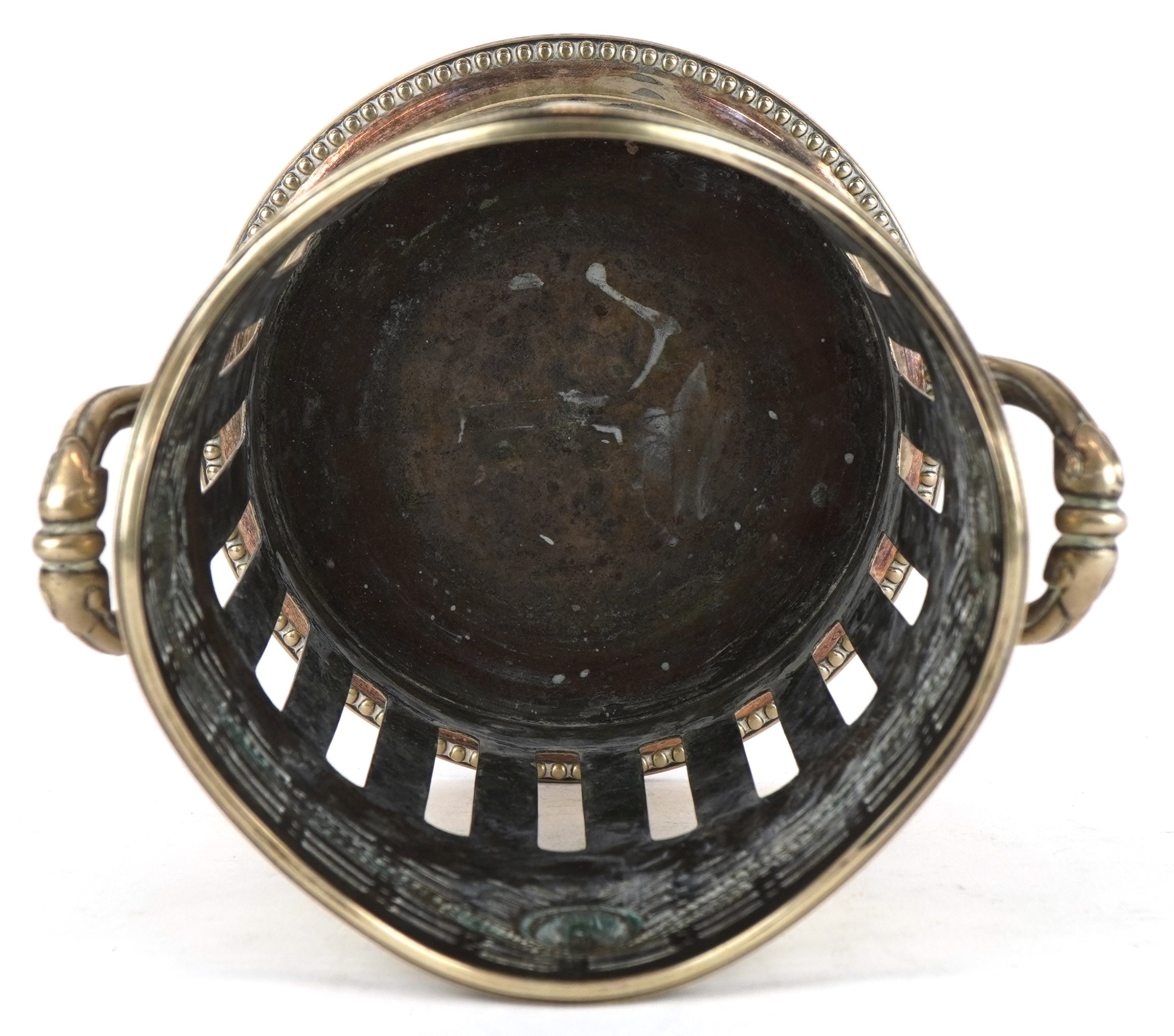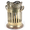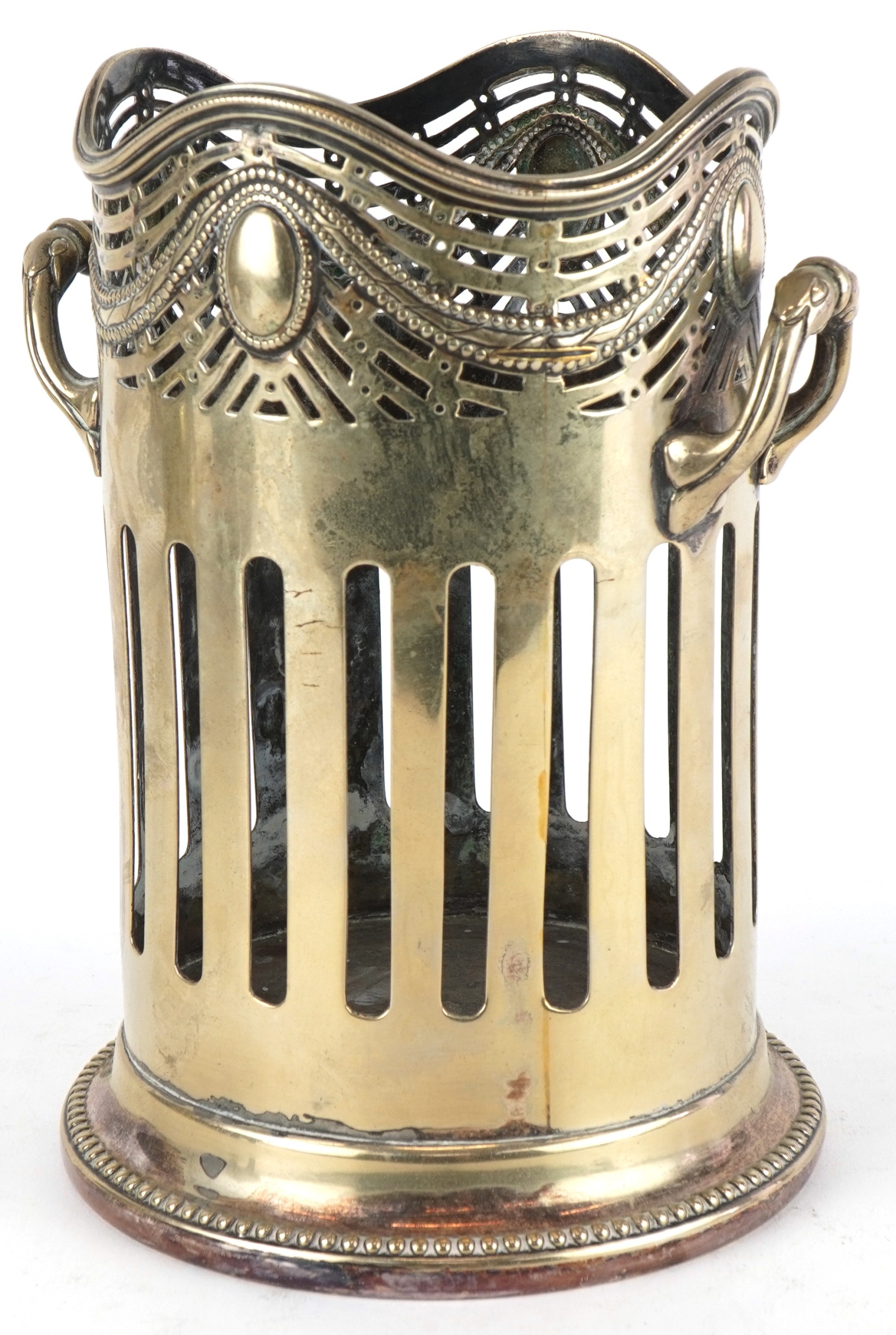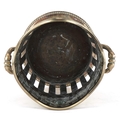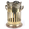 A 20th century silver plated twin handled wine bottle holder with pierced frieze, 20cm high.