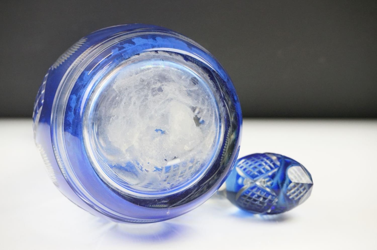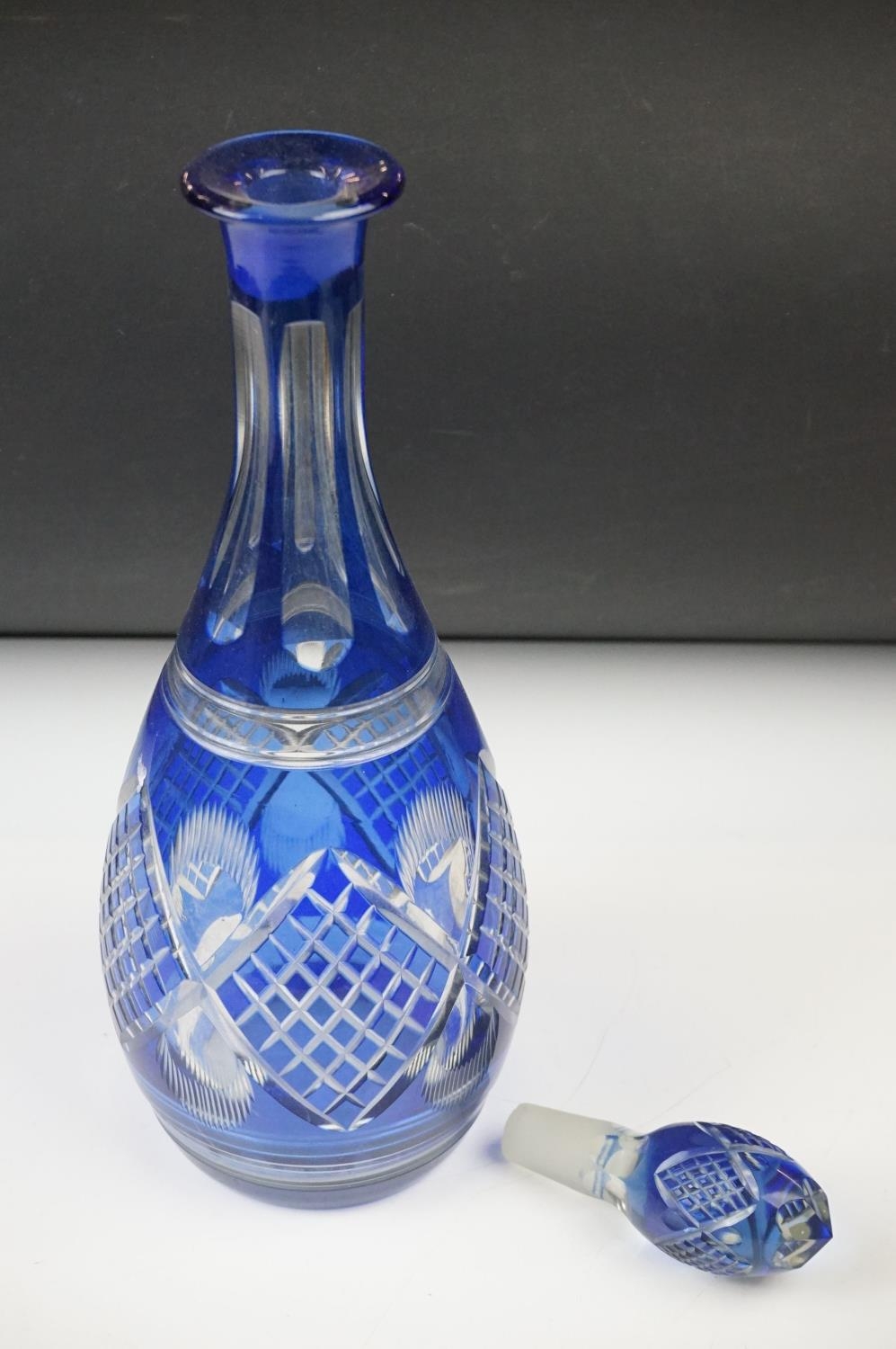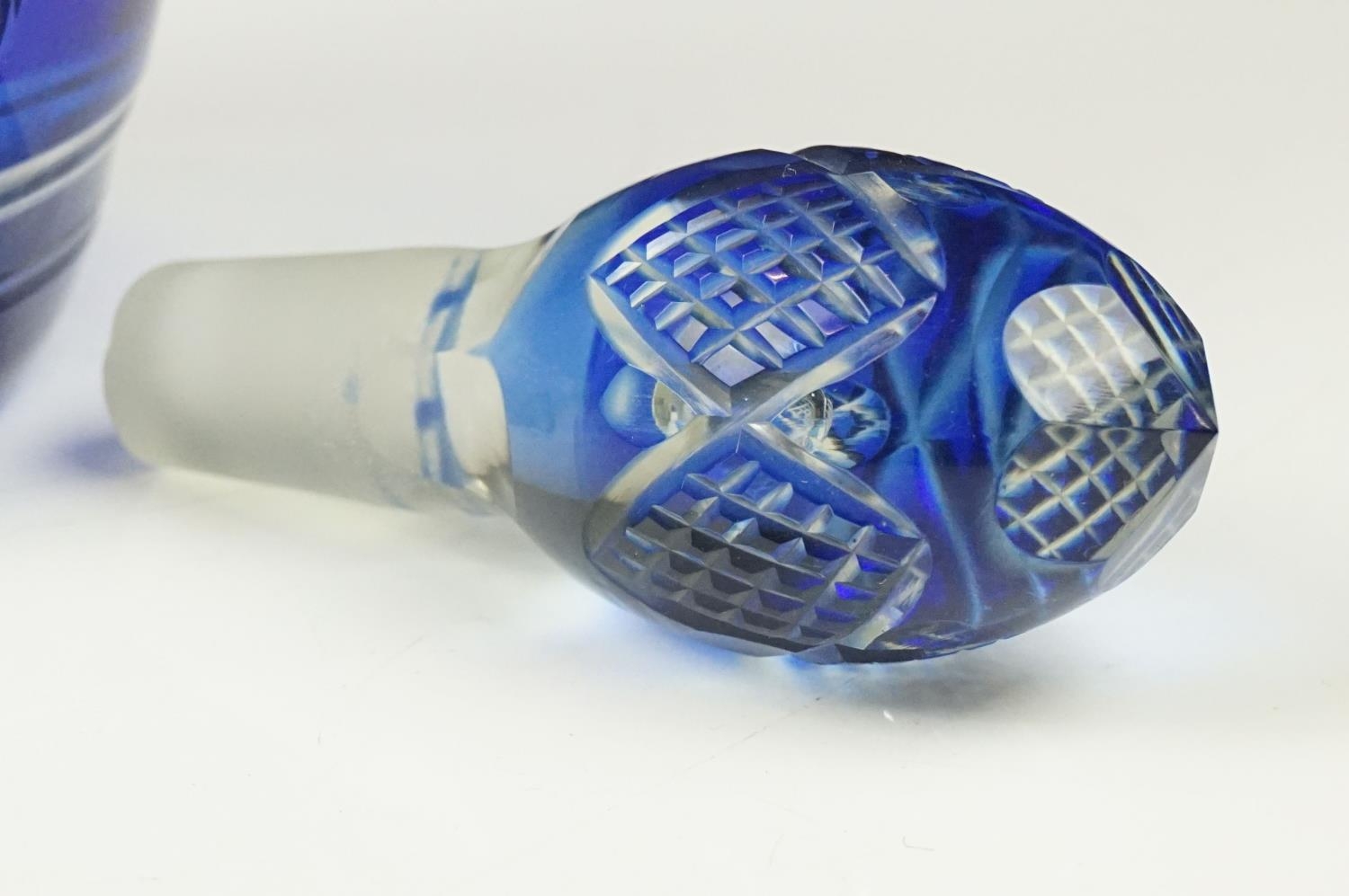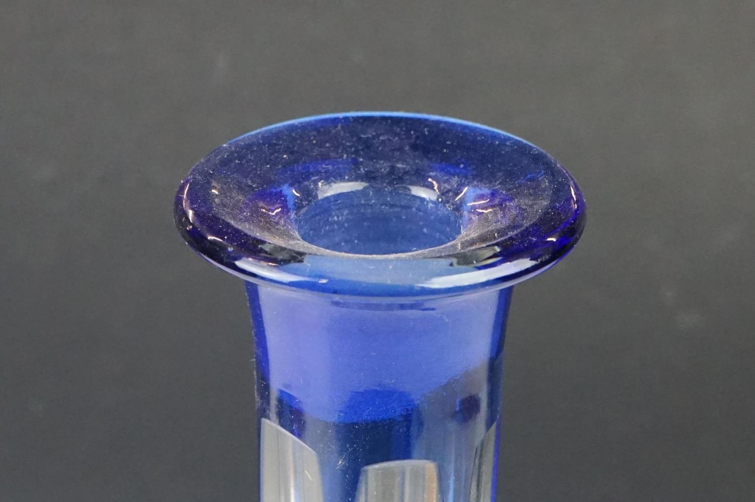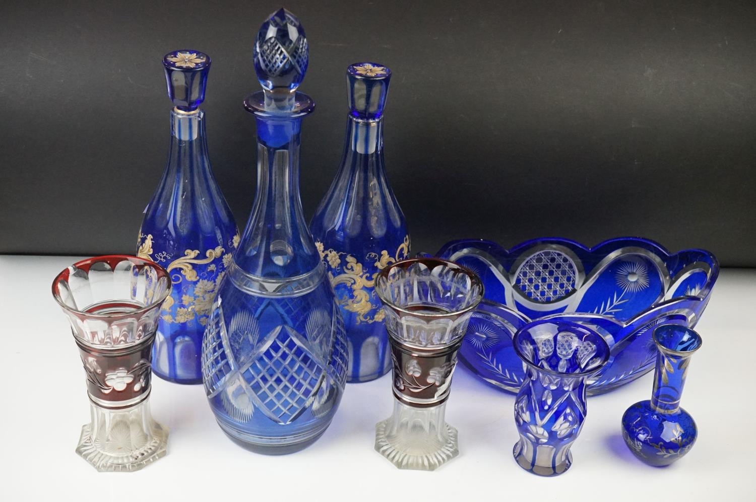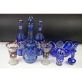 Glass Blue Flash Cut Decanter and Stopper, 37cm high together with a Pair of Blue Flash Cut Decanters with overlaid scrolling foliage decoration (a/f), Two further Blue Flash Cut Items, Pair of Red and Clear Flash Cut Vases and a small Venetian Blue Glass Vase