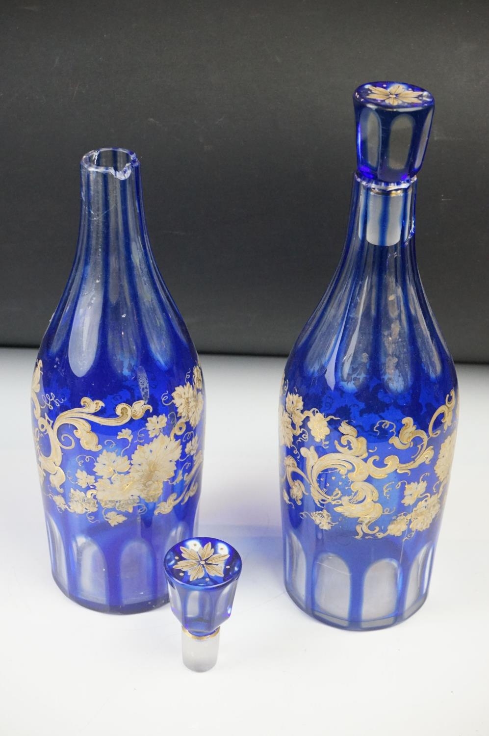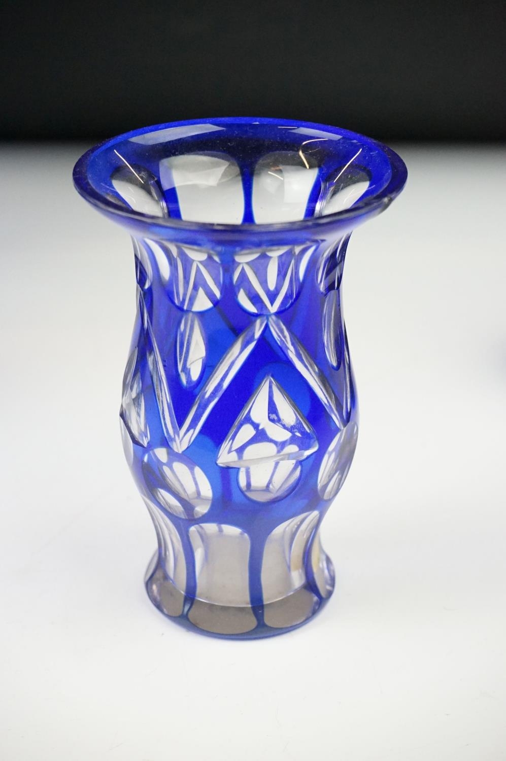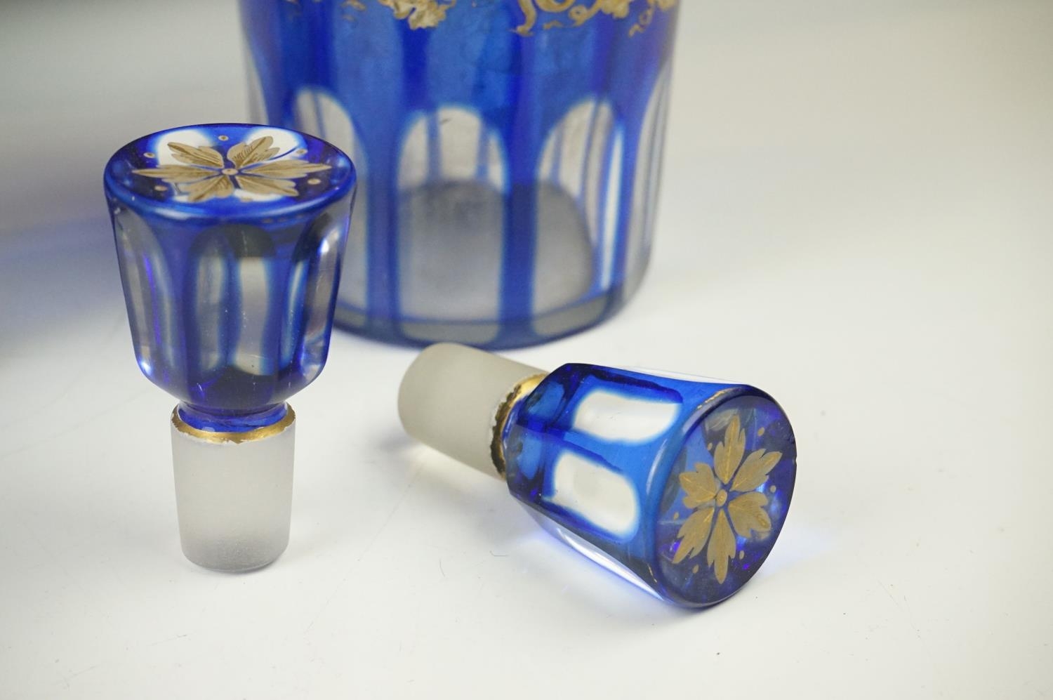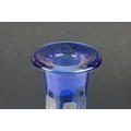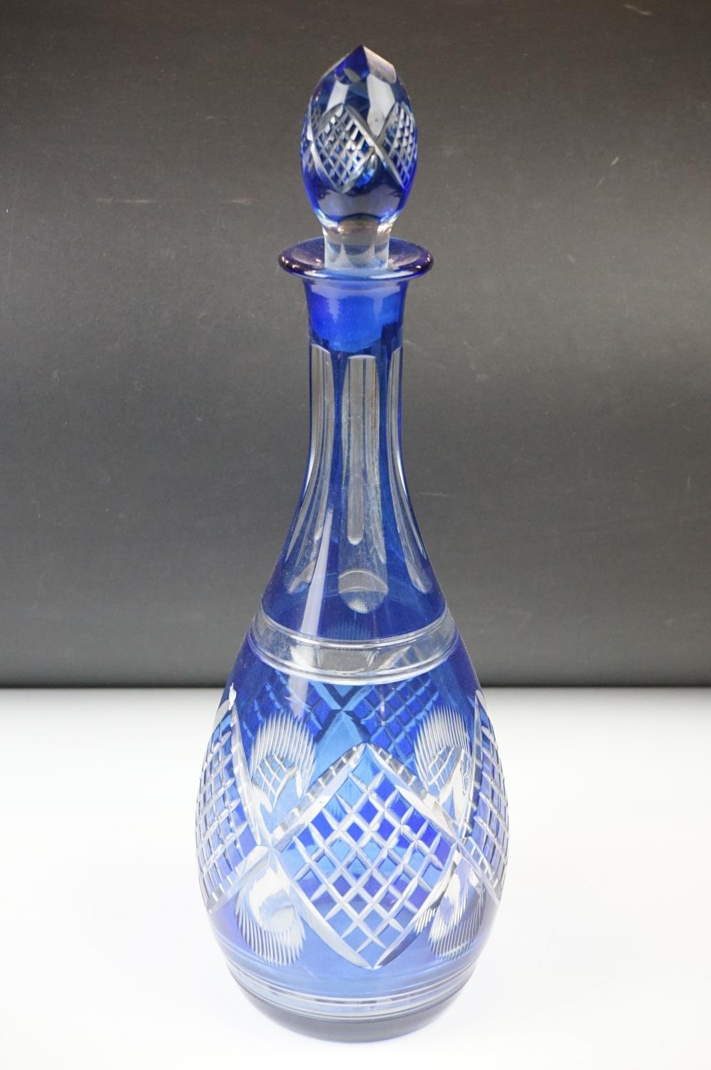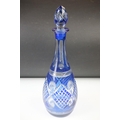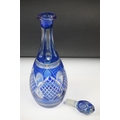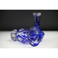 Glass Blue Flash Cut Decanter and Stopper, 37cm high together with a Pair of Blue Flash Cut Decanters with overlaid scrolling foliage decoration (a/f), Two further Blue Flash Cut Items, Pair of Red and Clear Flash Cut Vases and a small Venetian Blue Glass Vase