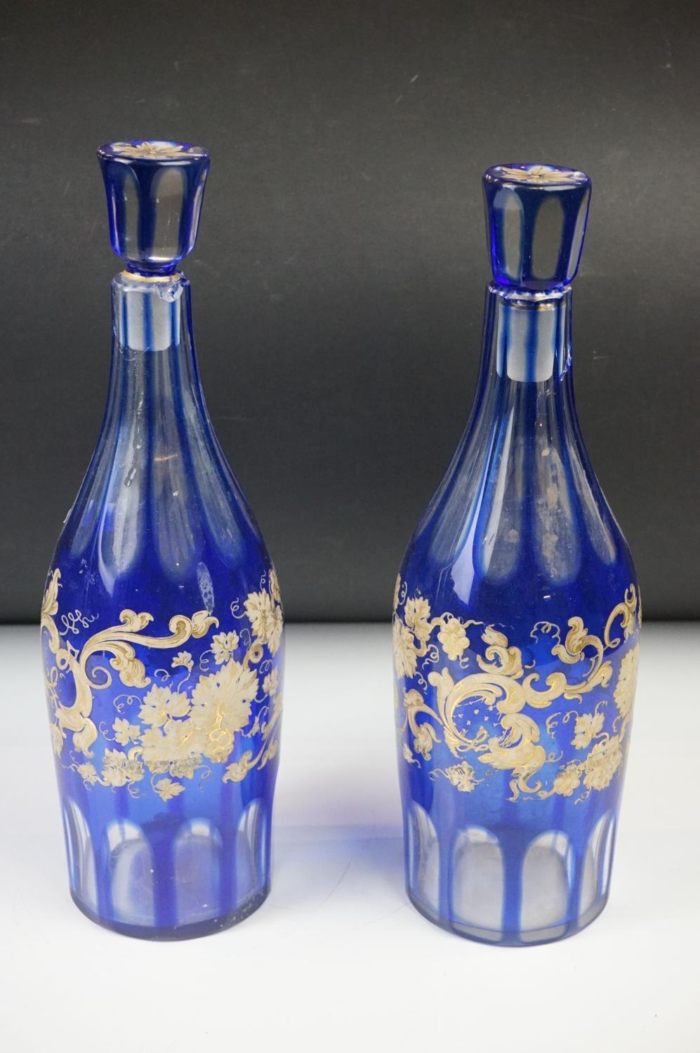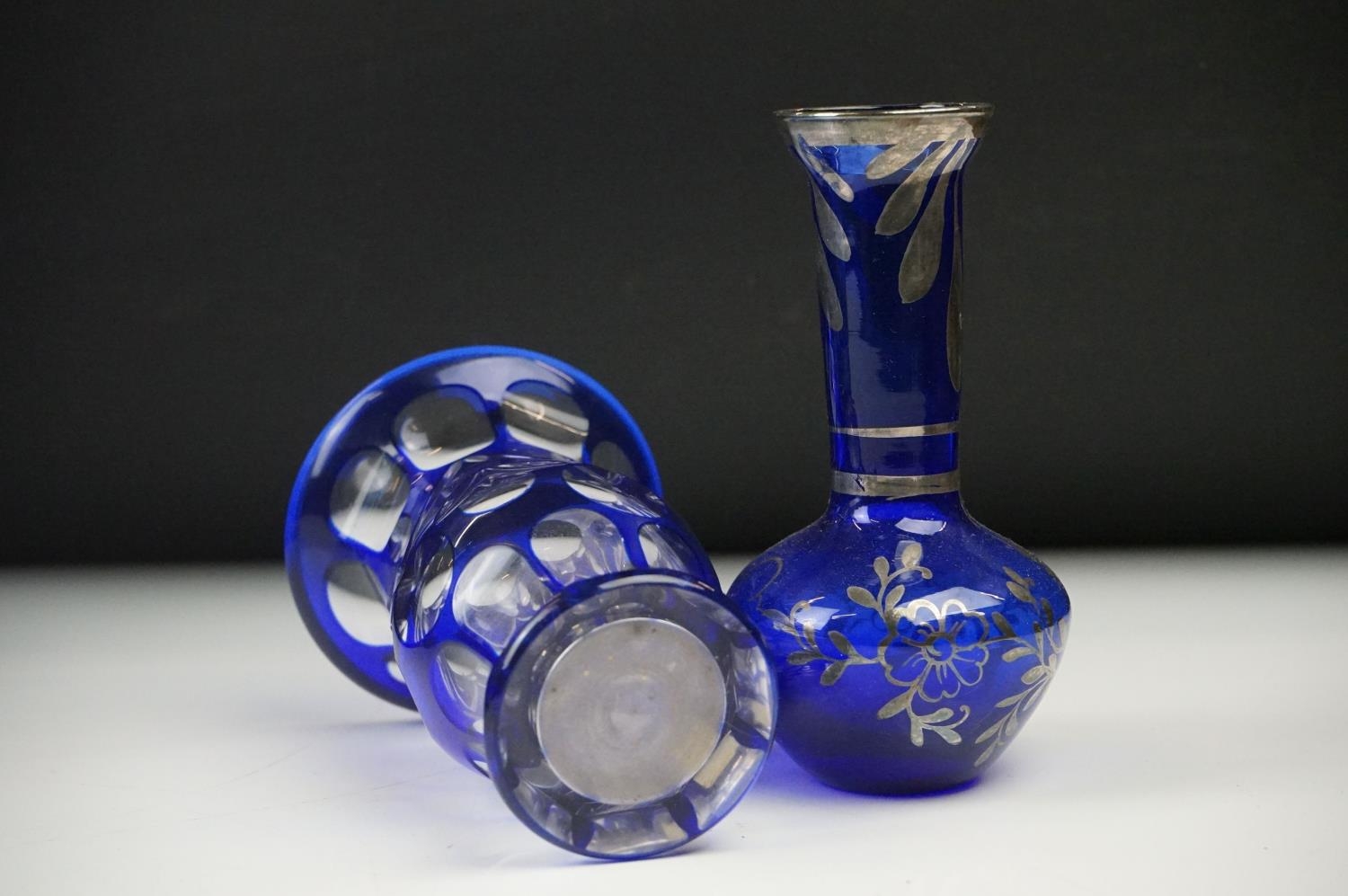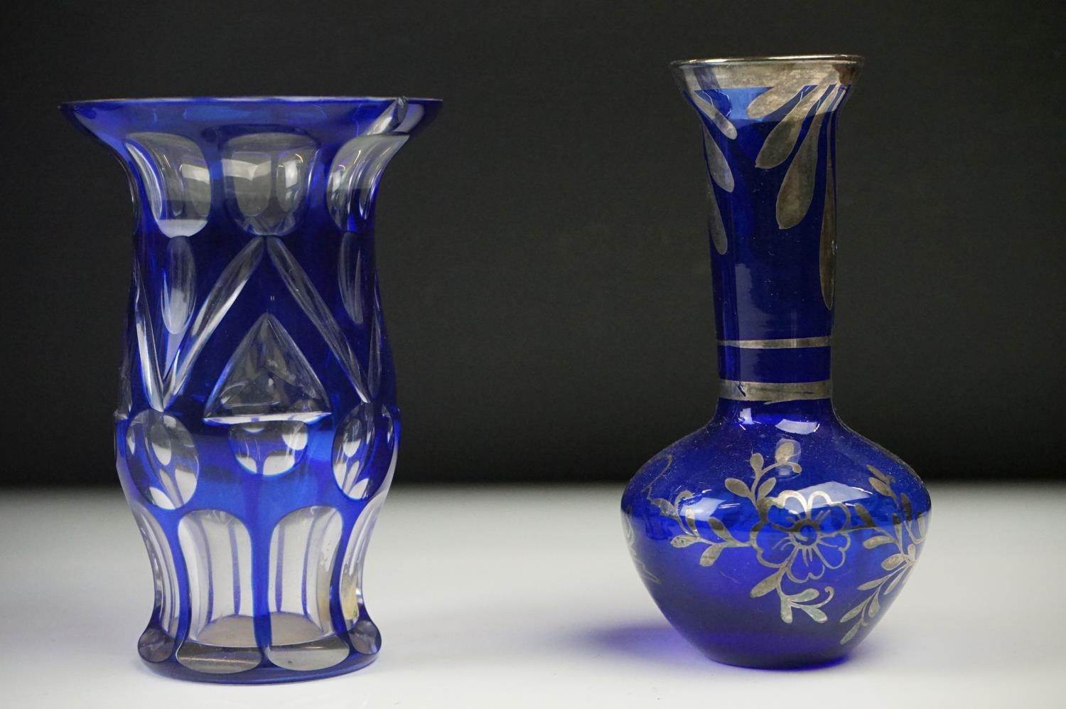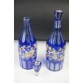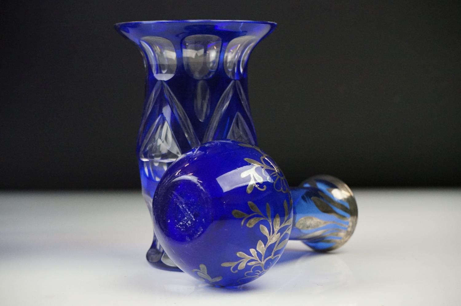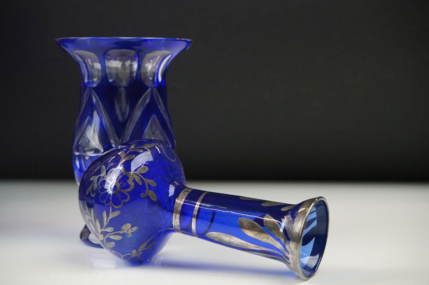 Glass Blue Flash Cut Decanter and Stopper, 37cm high together with a Pair of Blue Flash Cut Decanters with overlaid scrolling foliage decoration (a/f), Two further Blue Flash Cut Items, Pair of Red and Clear Flash Cut Vases and a small Venetian Blue Glass Vase