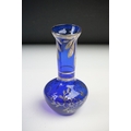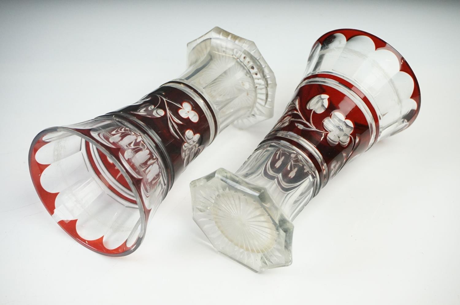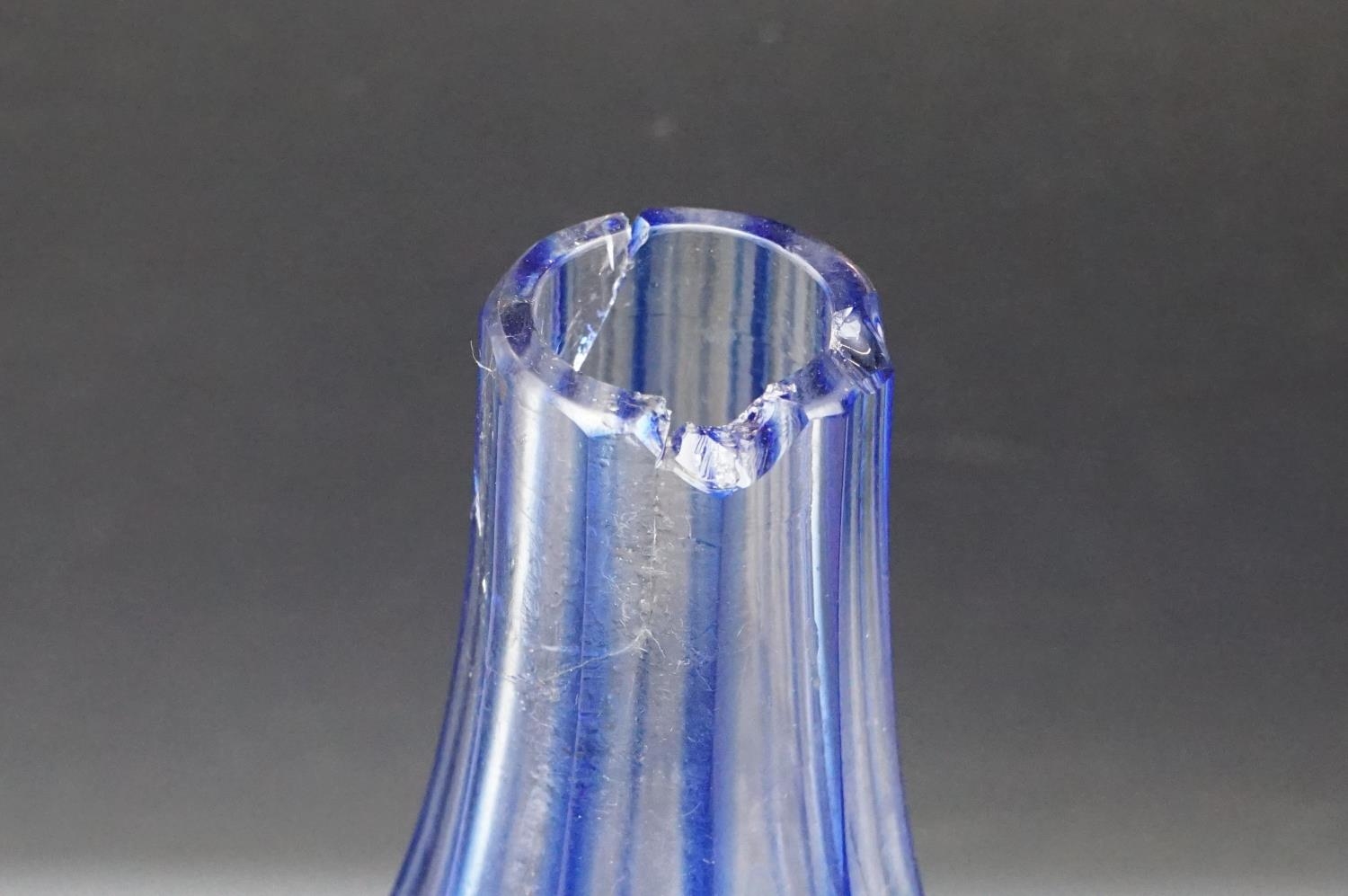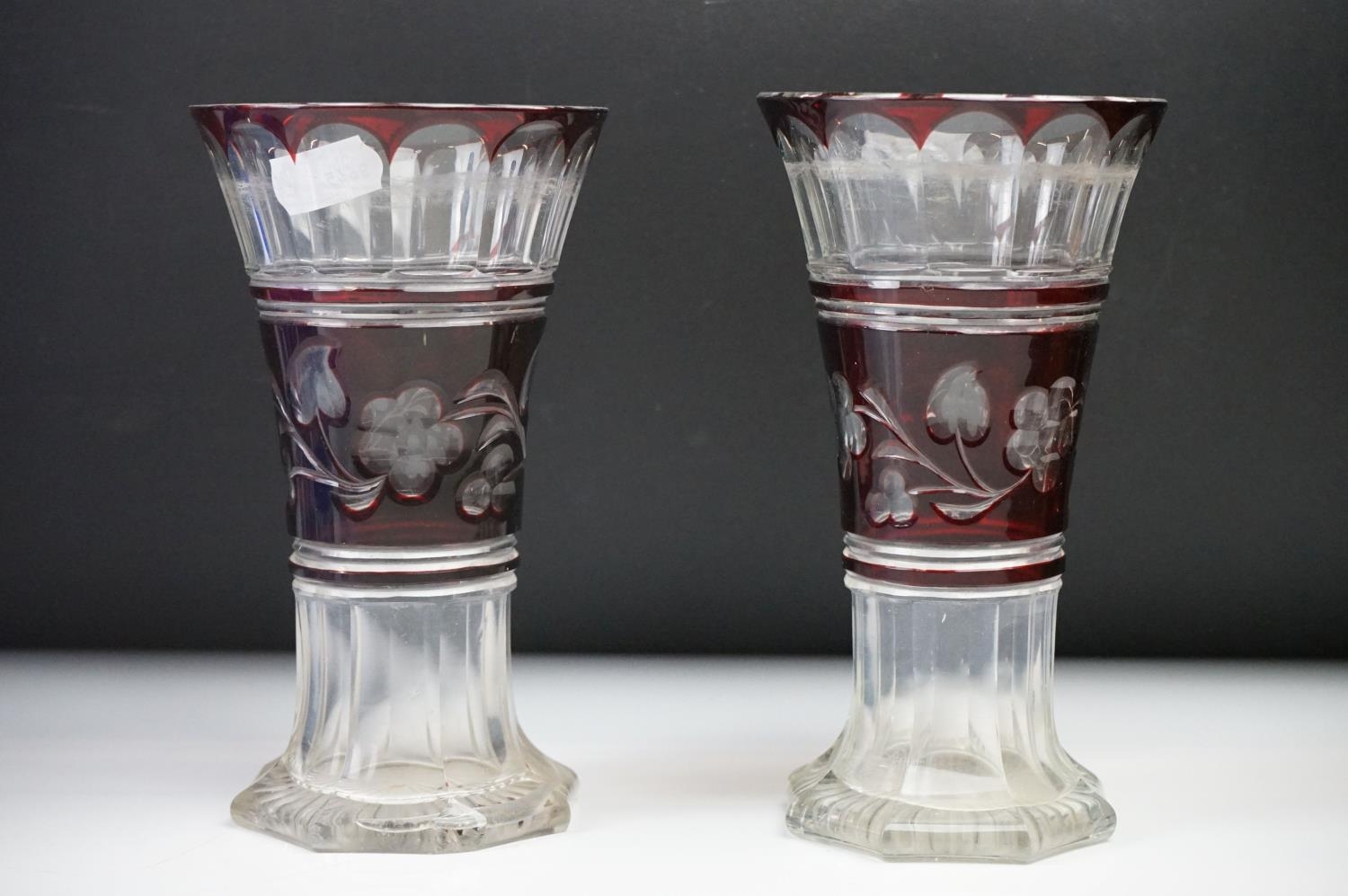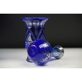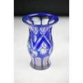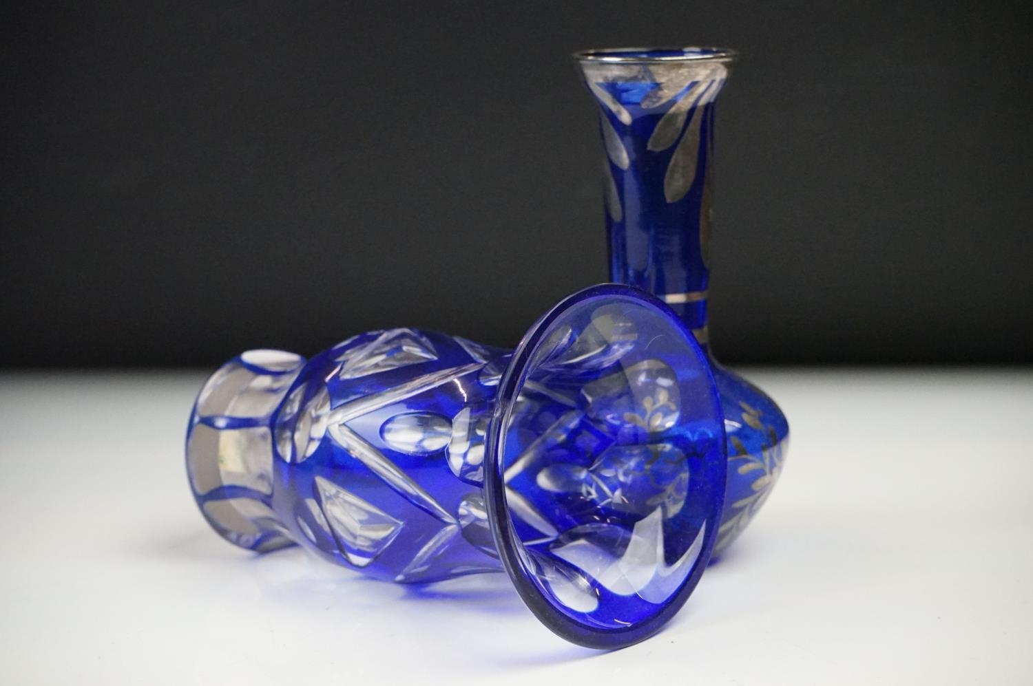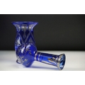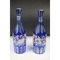 Glass Blue Flash Cut Decanter and Stopper, 37cm high together with a Pair of Blue Flash Cut Decanters with overlaid scrolling foliage decoration (a/f), Two further Blue Flash Cut Items, Pair of Red and Clear Flash Cut Vases and a small Venetian Blue Glass Vase