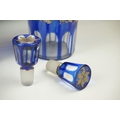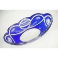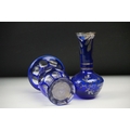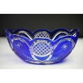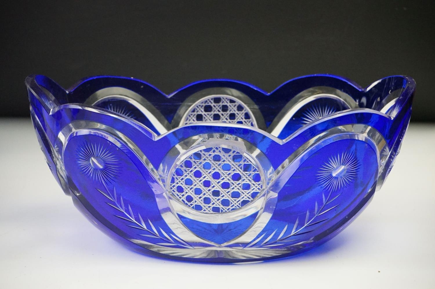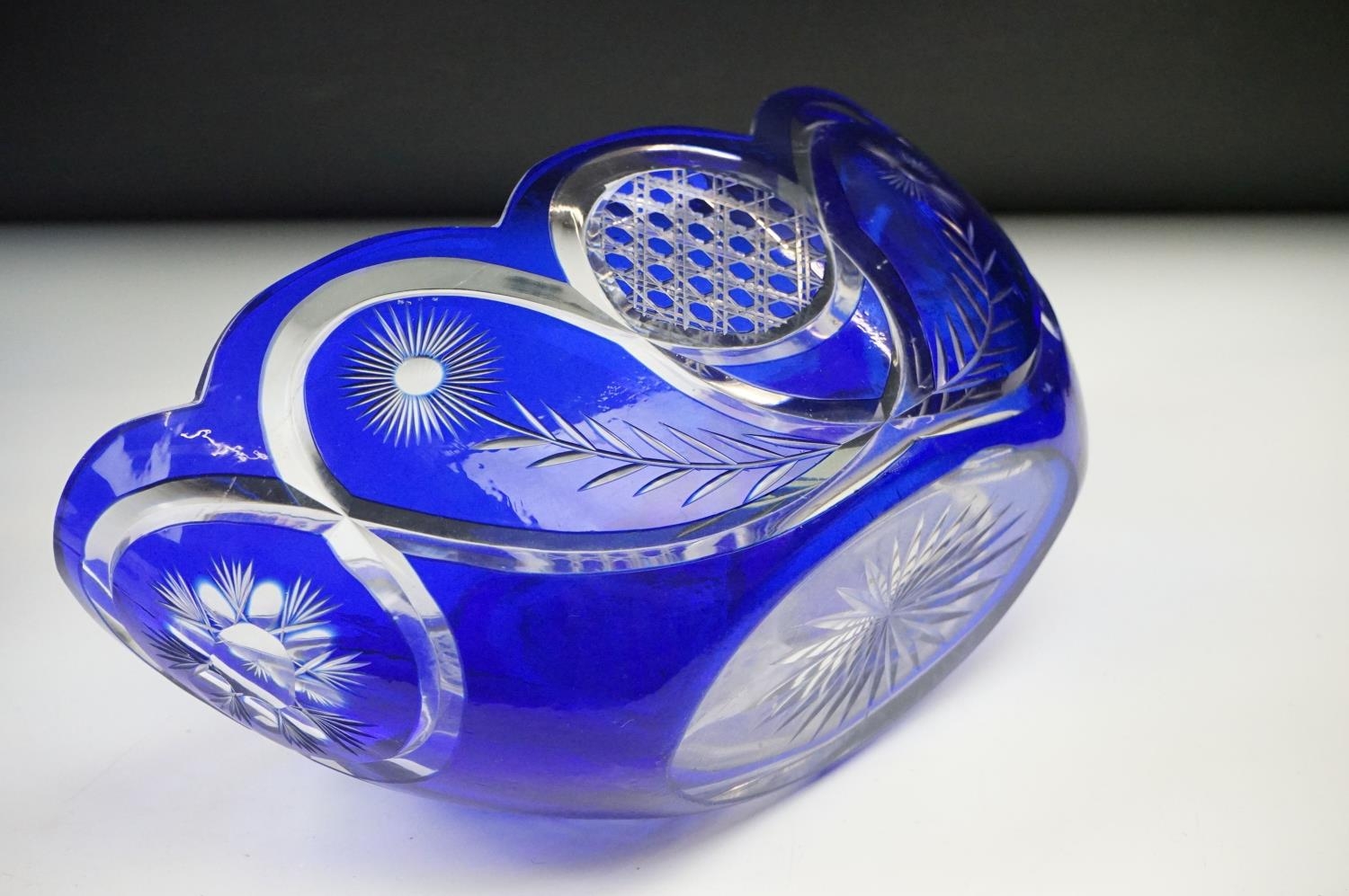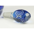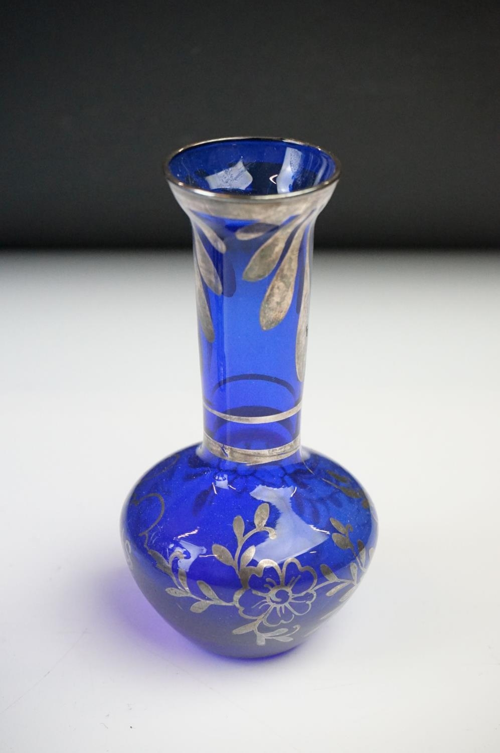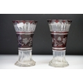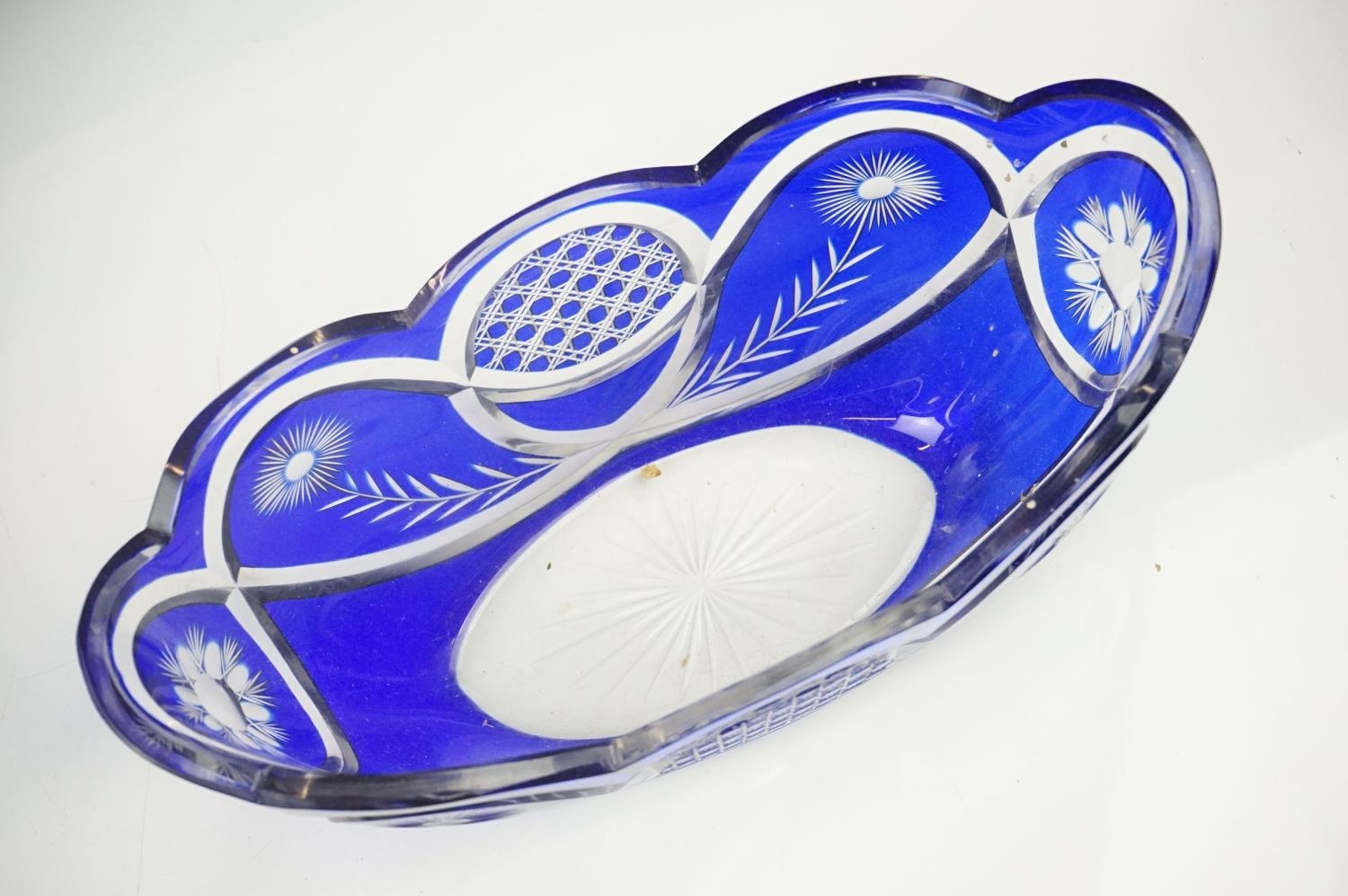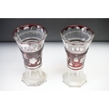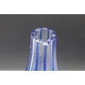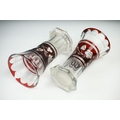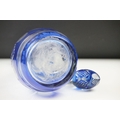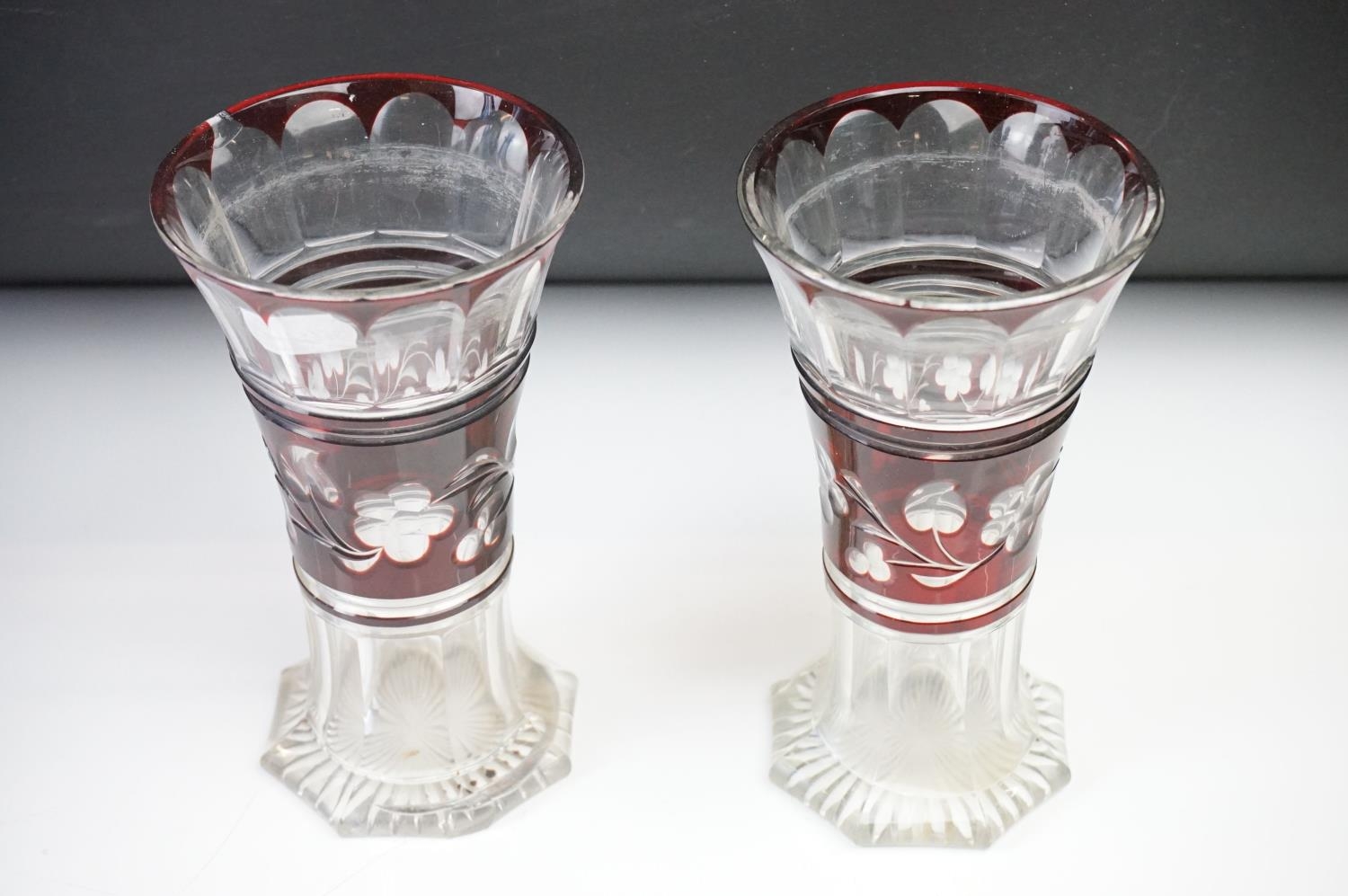 Glass Blue Flash Cut Decanter and Stopper, 37cm high together with a Pair of Blue Flash Cut Decanters with overlaid scrolling foliage decoration (a/f), Two further Blue Flash Cut Items, Pair of Red and Clear Flash Cut Vases and a small Venetian Blue Glass Vase