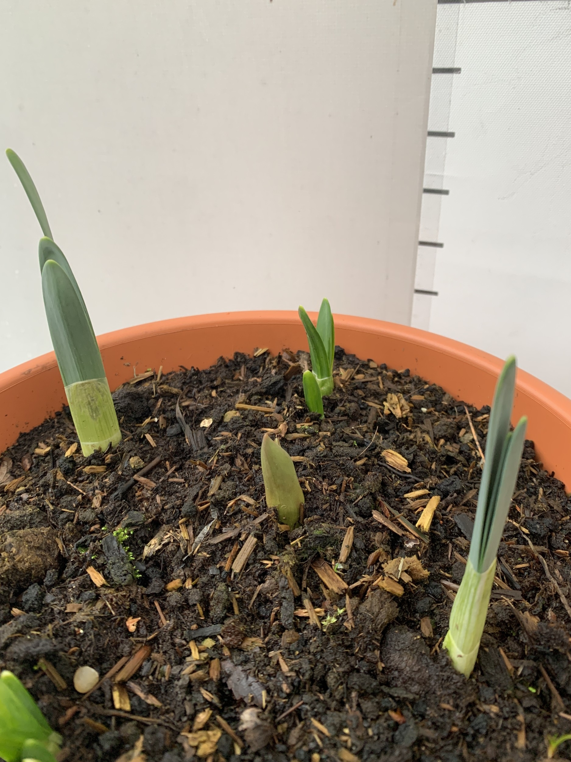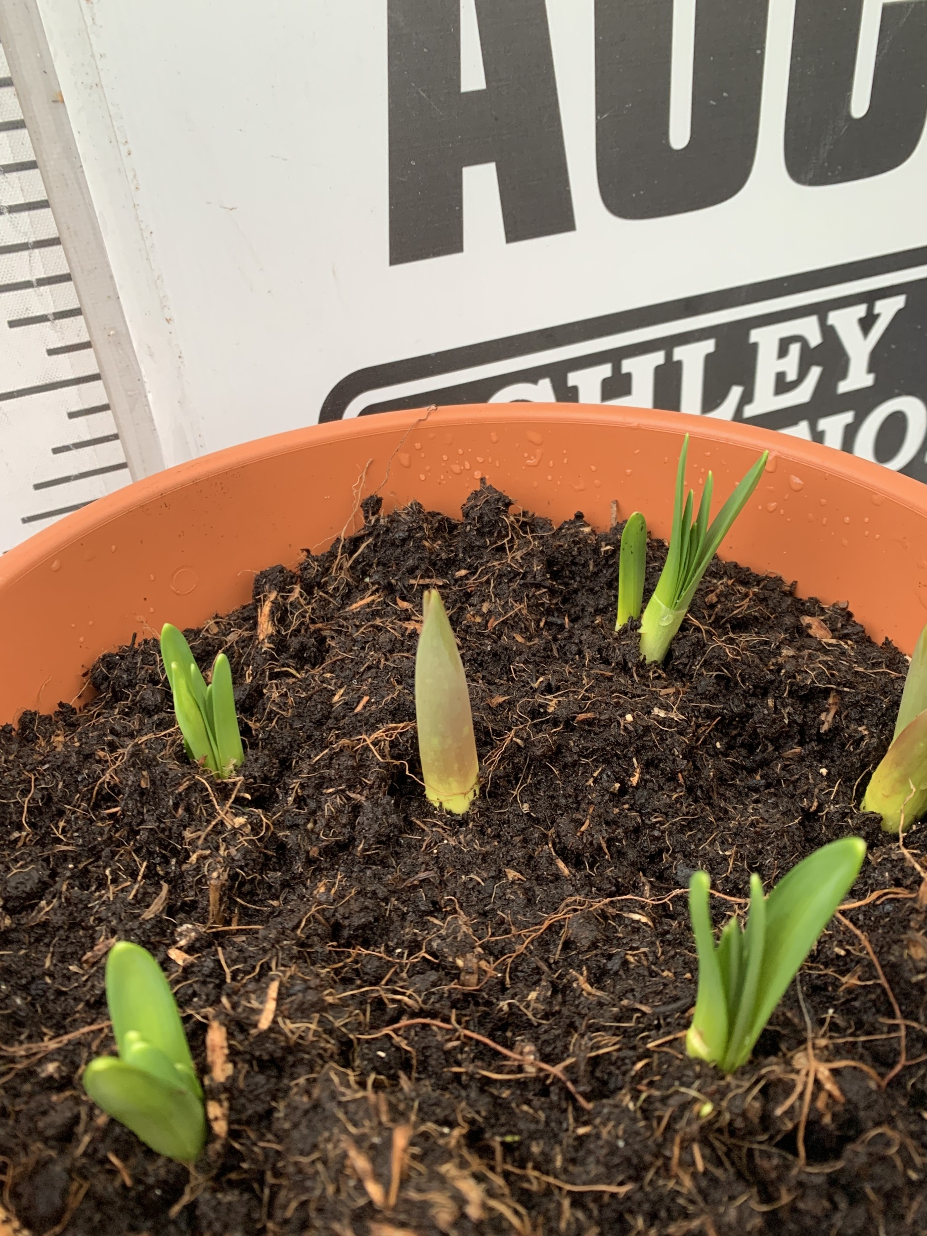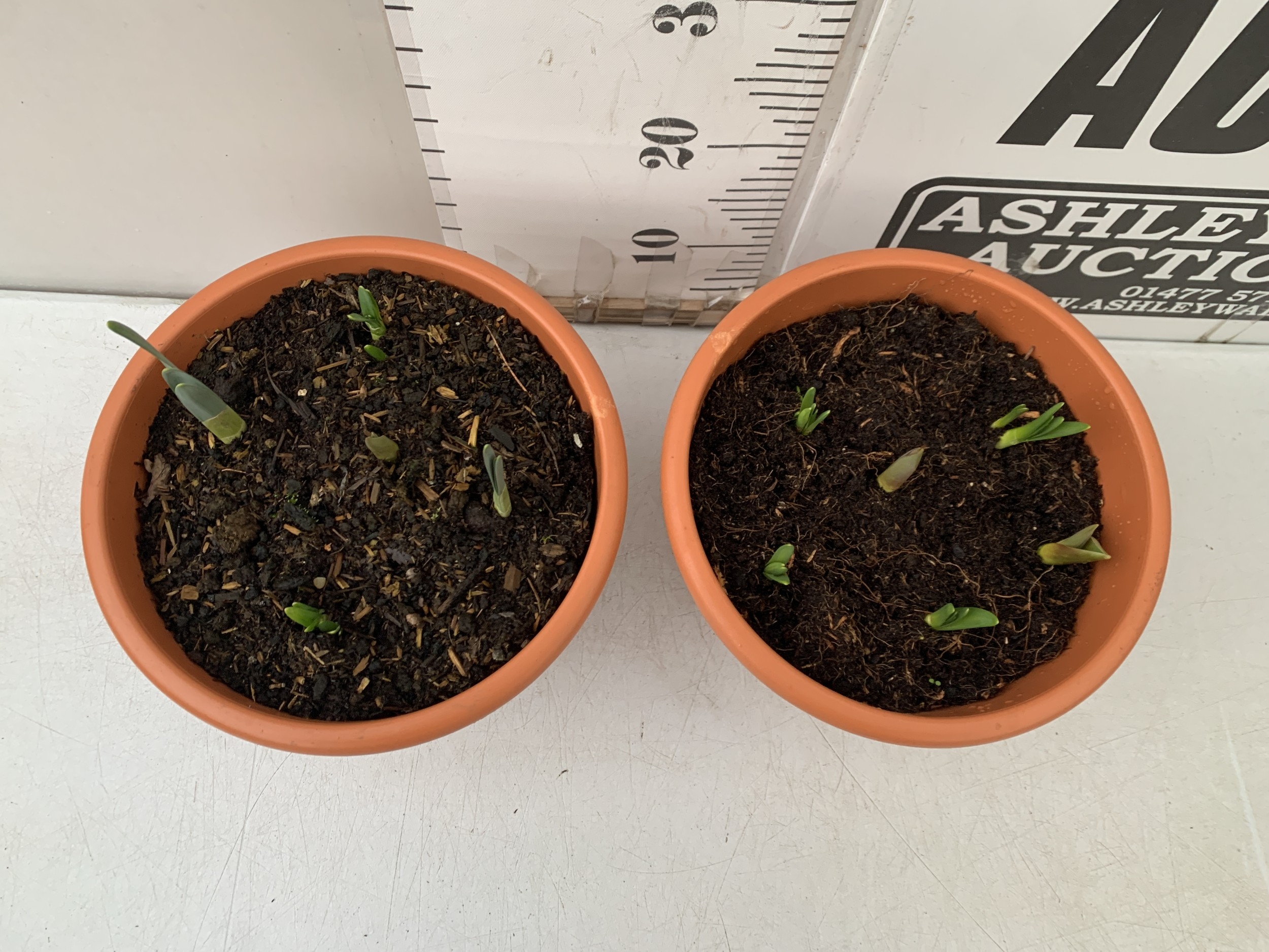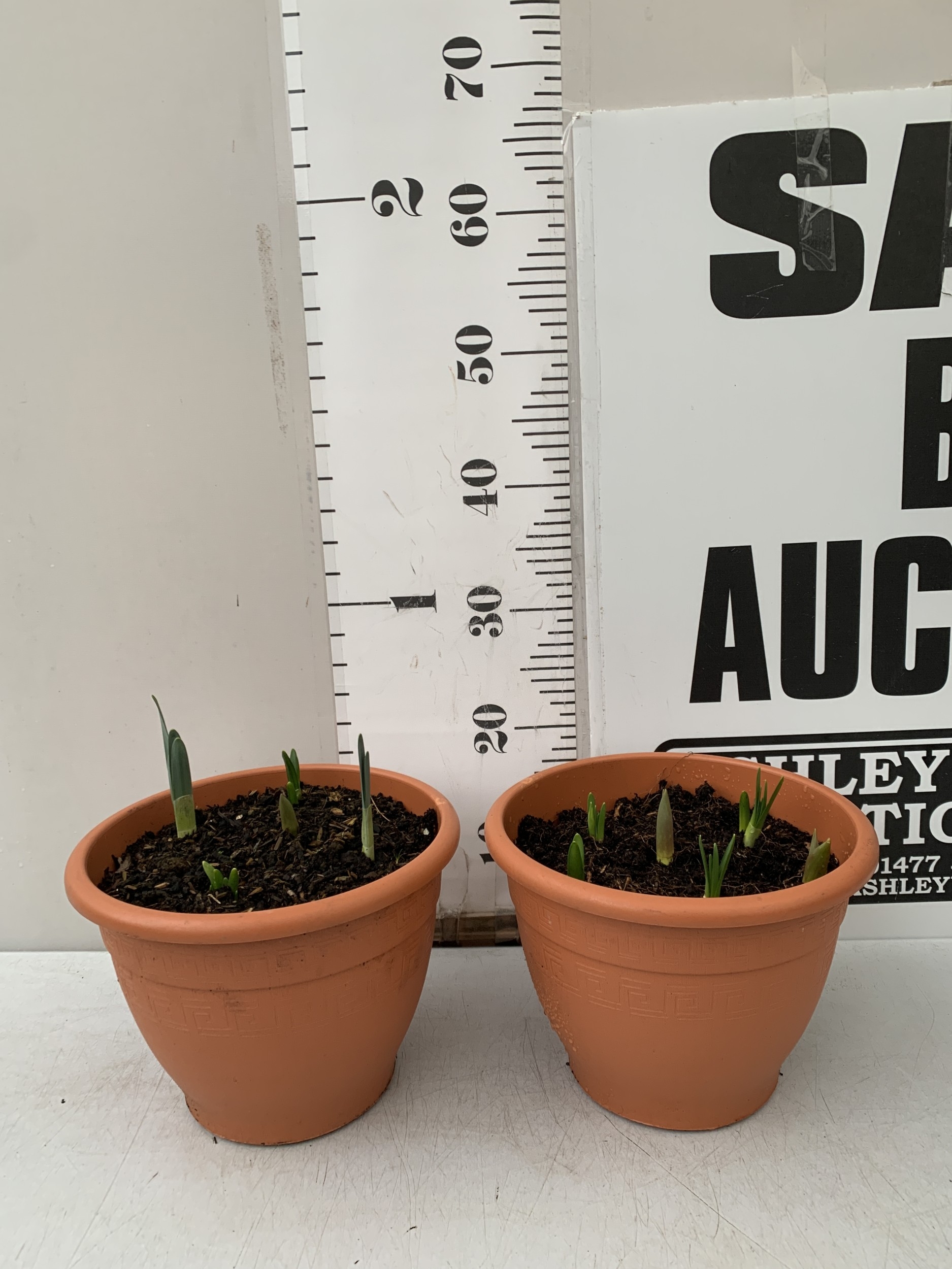 TWO PLANTERS CONTAINING MIXED SPRING BULBS TO INCLUDE DAFFODILS, TULIPS AND CROCUS ETC. PLANTERS MEASURE 25CM IN DIAMETER. TO BE SOLD FOR THE TWO