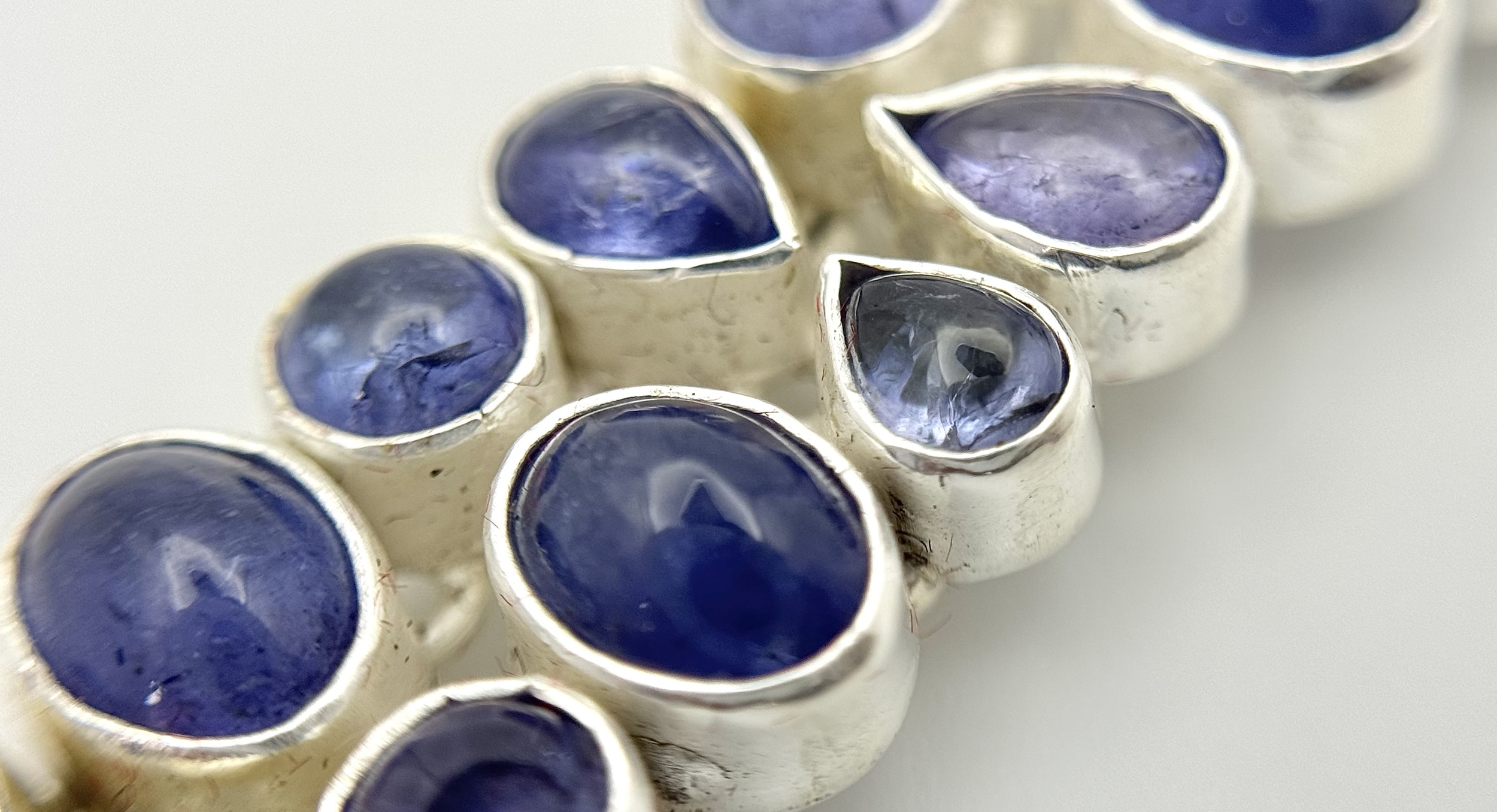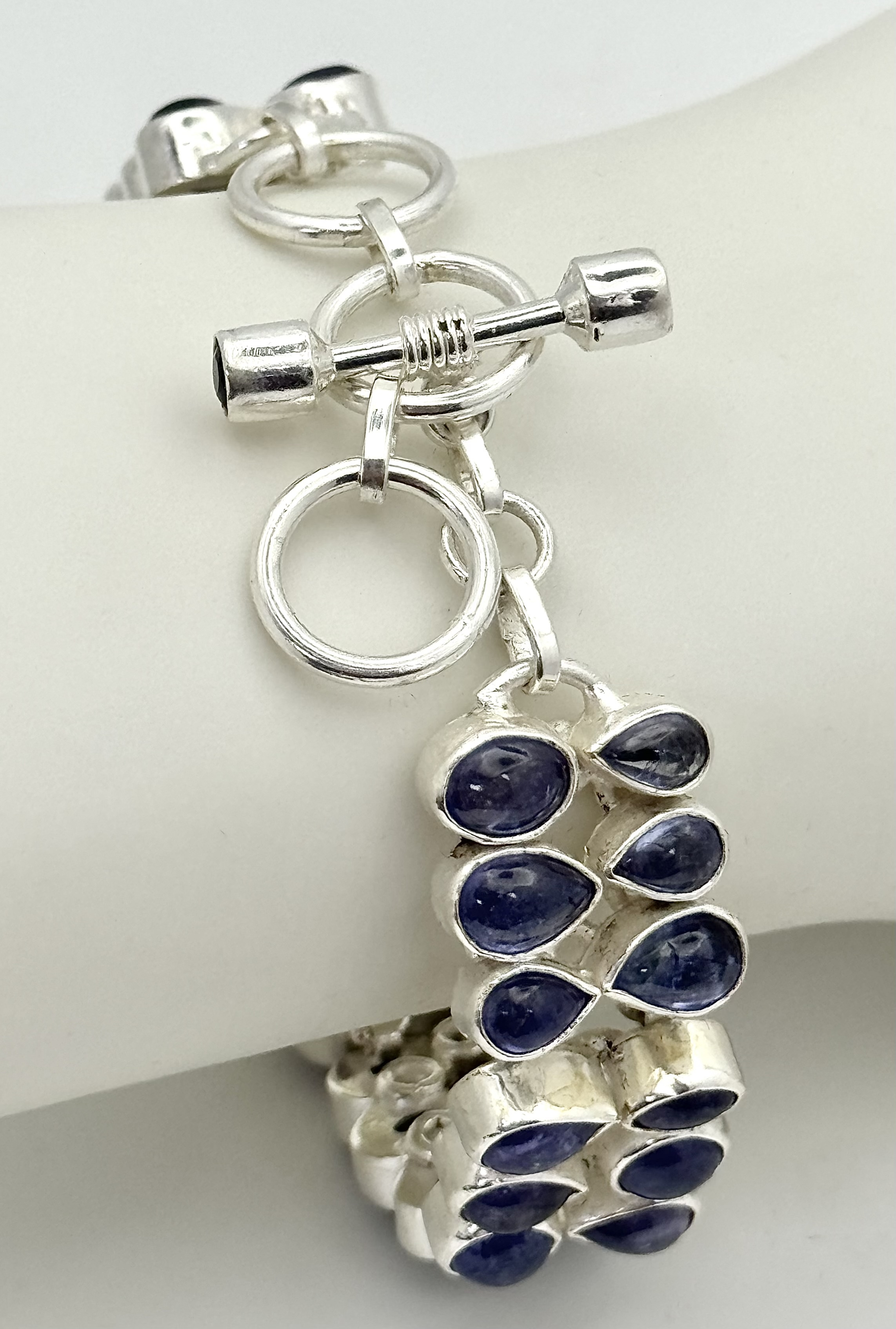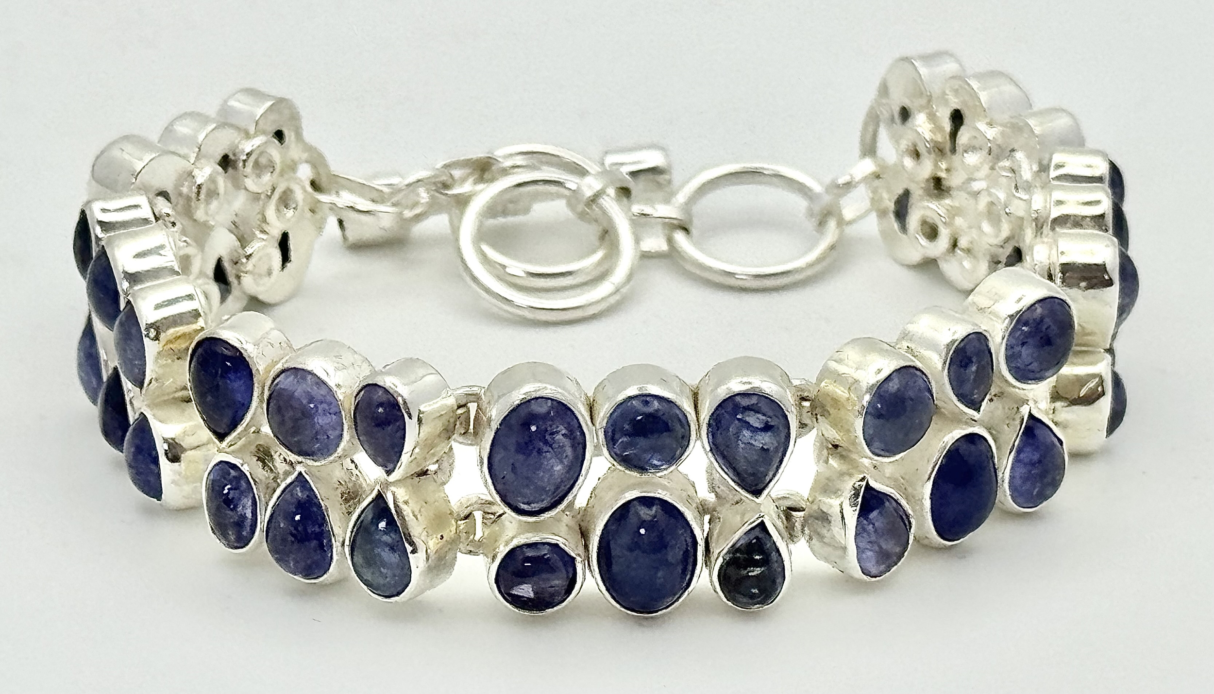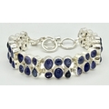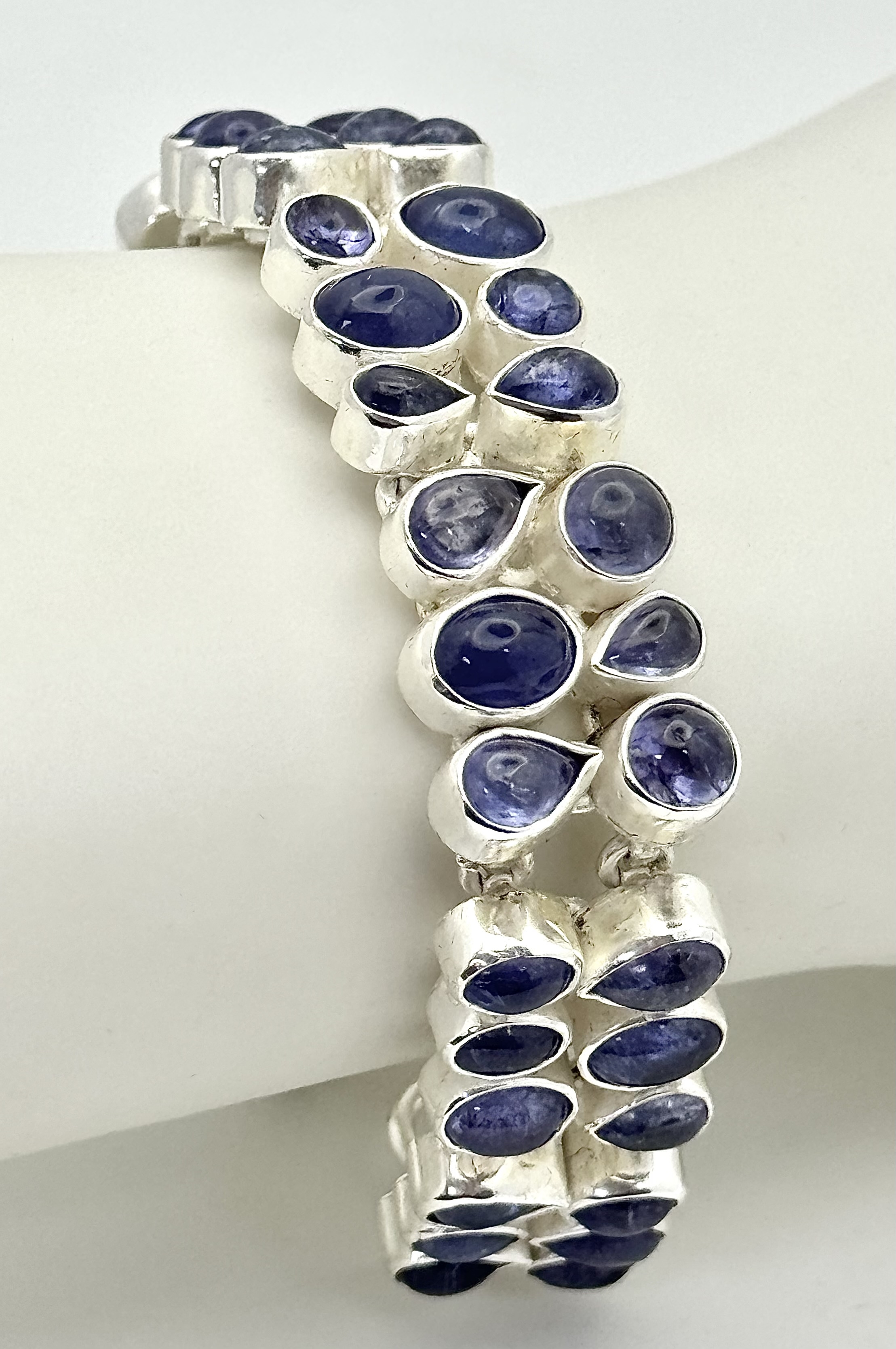 A Gorgeous Double Row Tanzanite Gemstone Bracelet. Round and pear-shaped cuts. Set in 925 Silver. 38.5g total weight.
