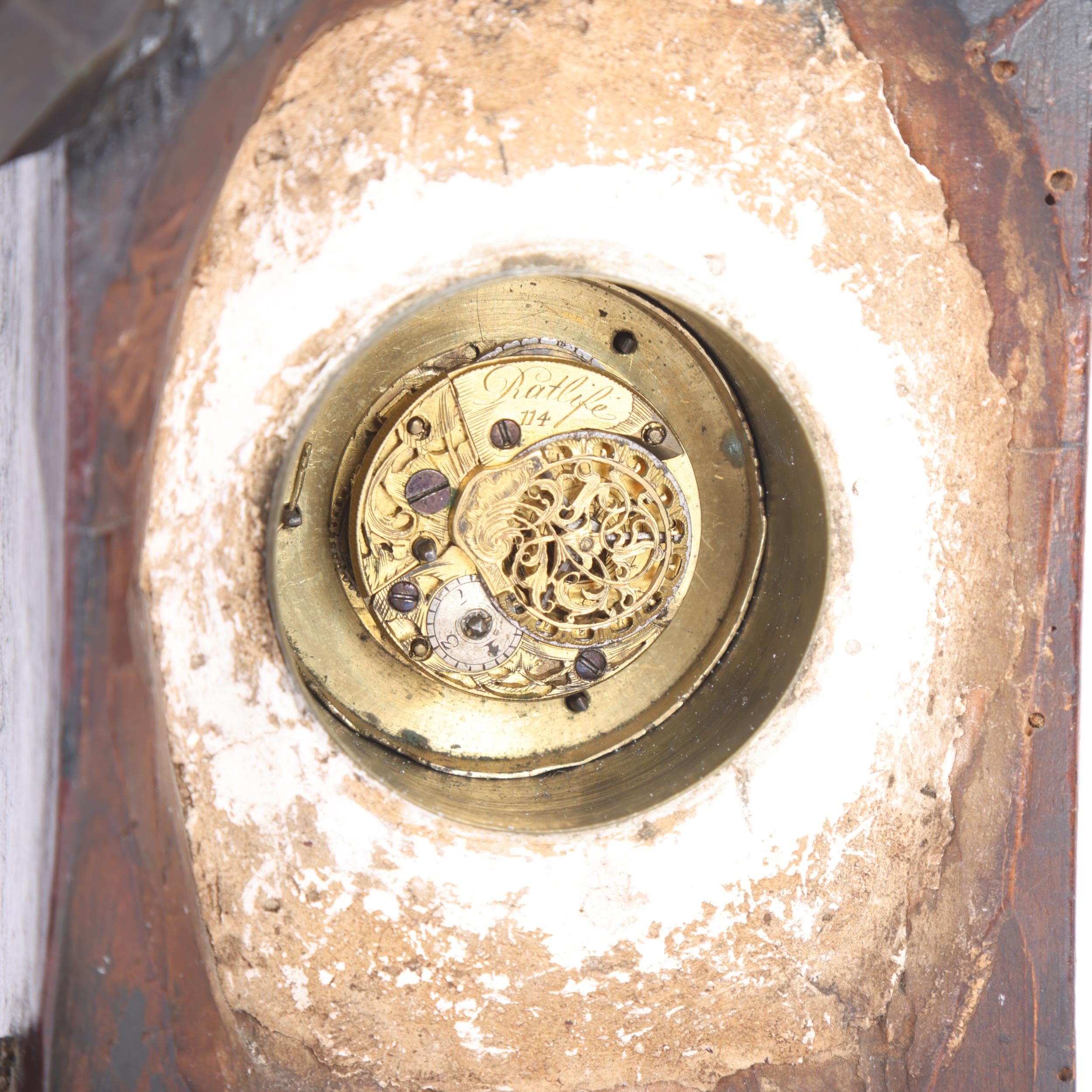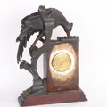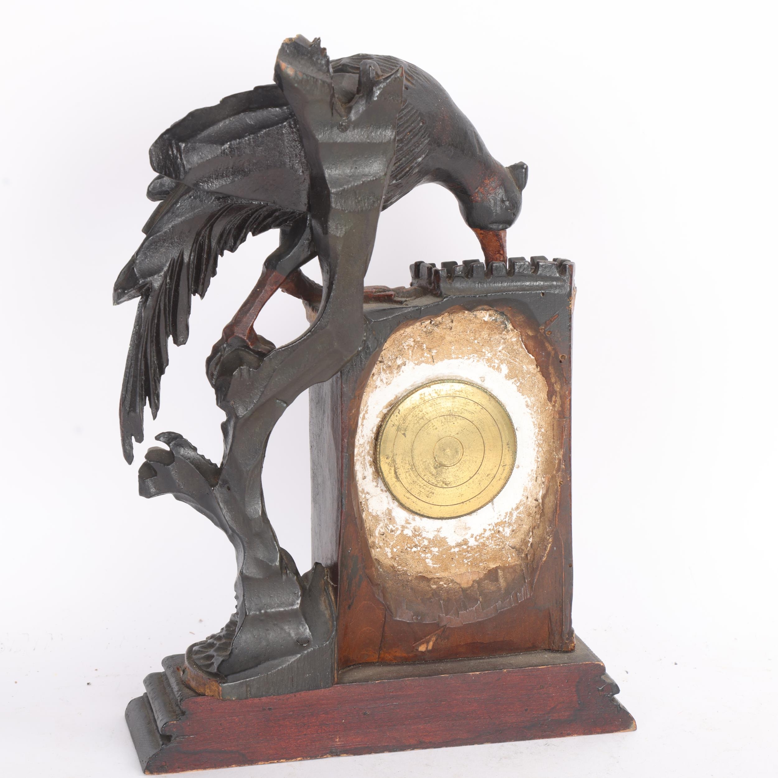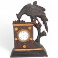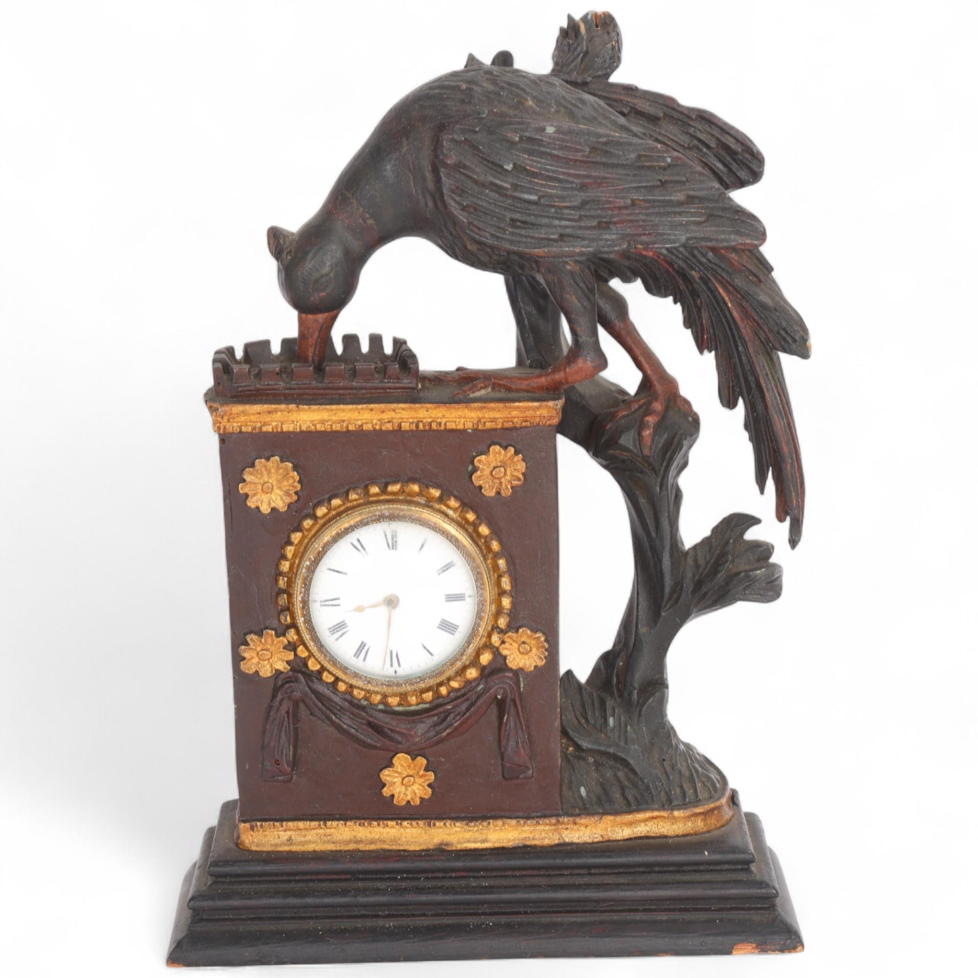 A Continental carved and painted wood cased mantel clock, surmounted by a bird, height 28cm