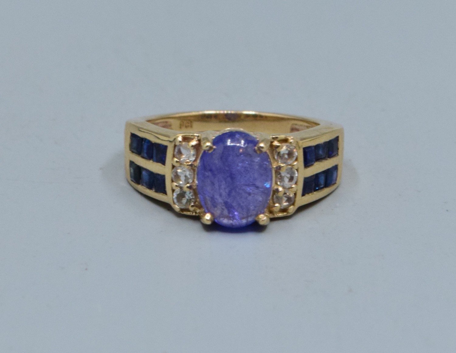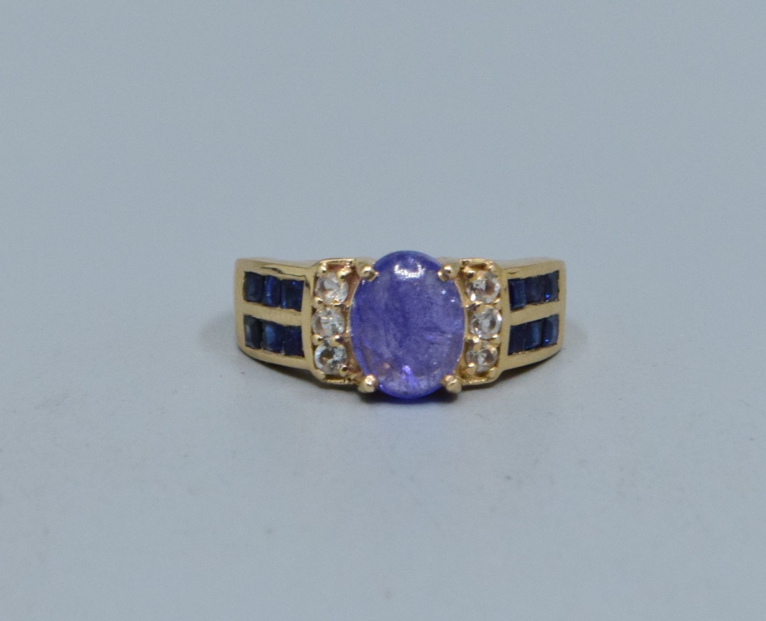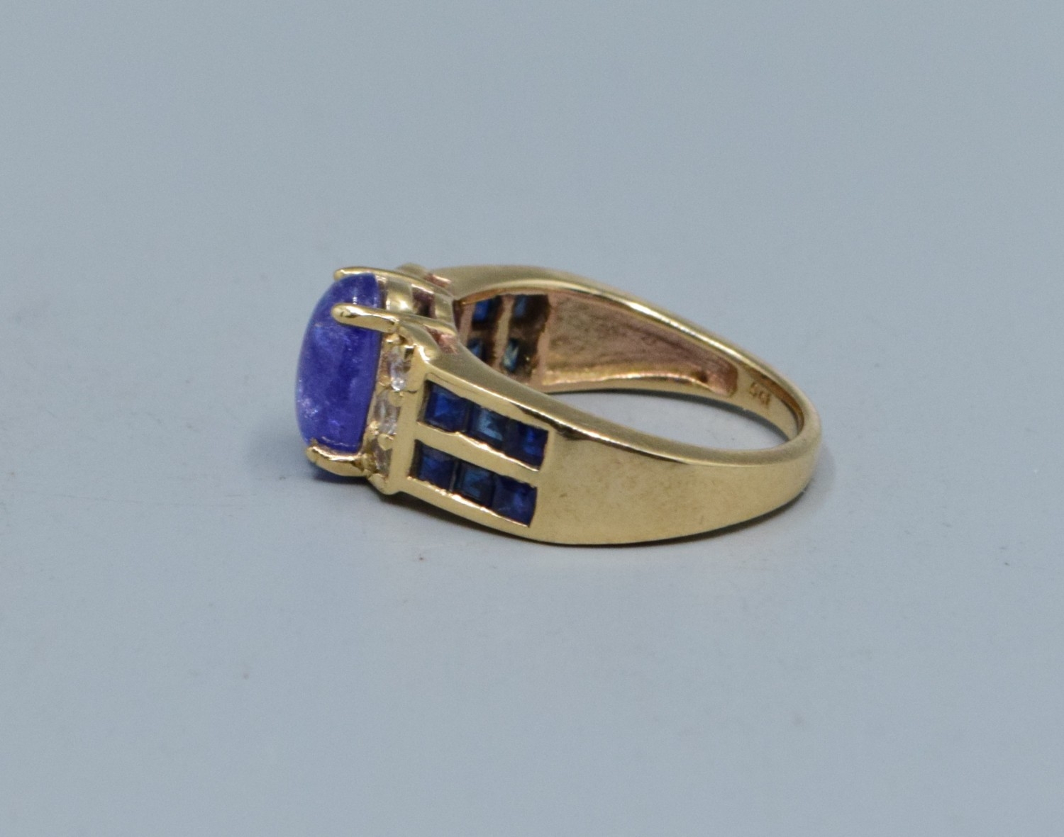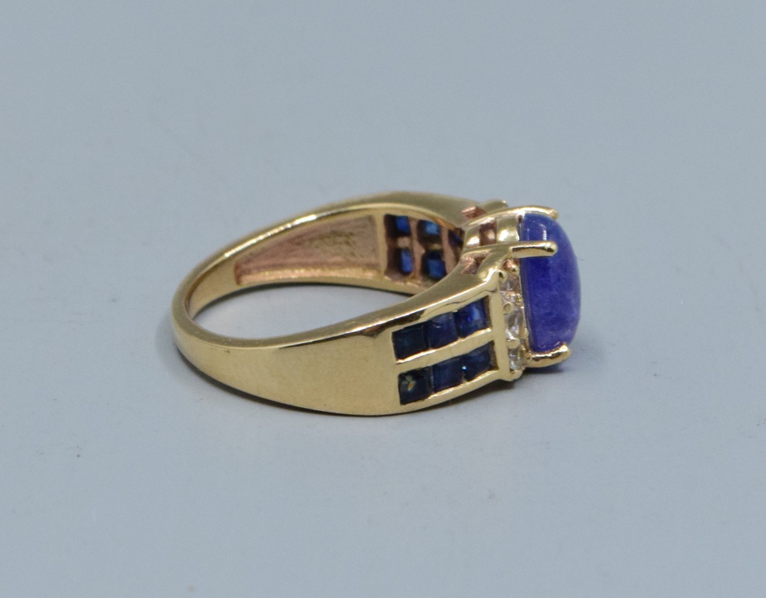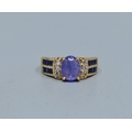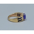 9ct gold ladies cabochon unpolished Amethyst ring with Amethyst and clear gem set decoration to the shoulders size L, 4.3grams