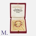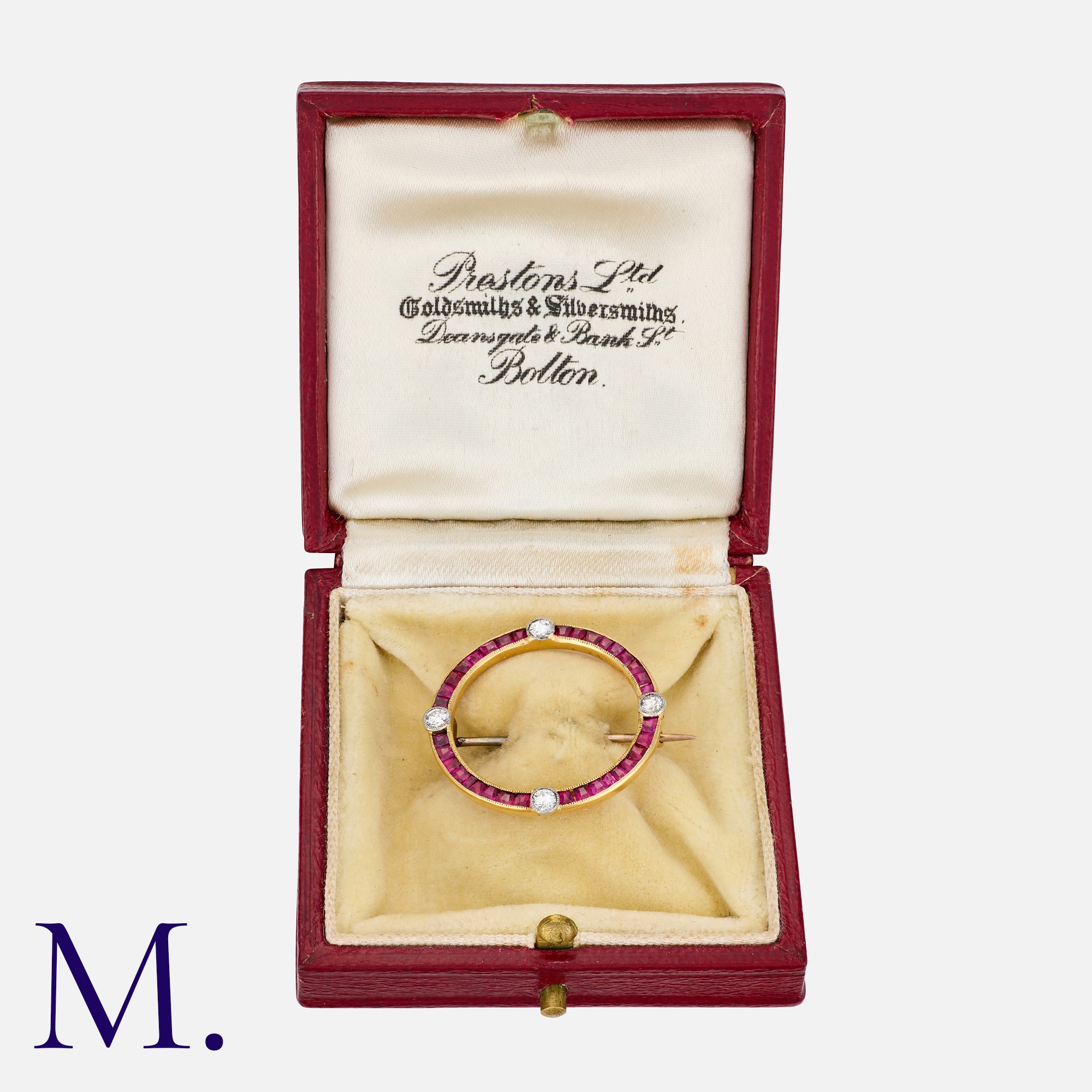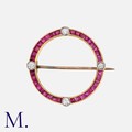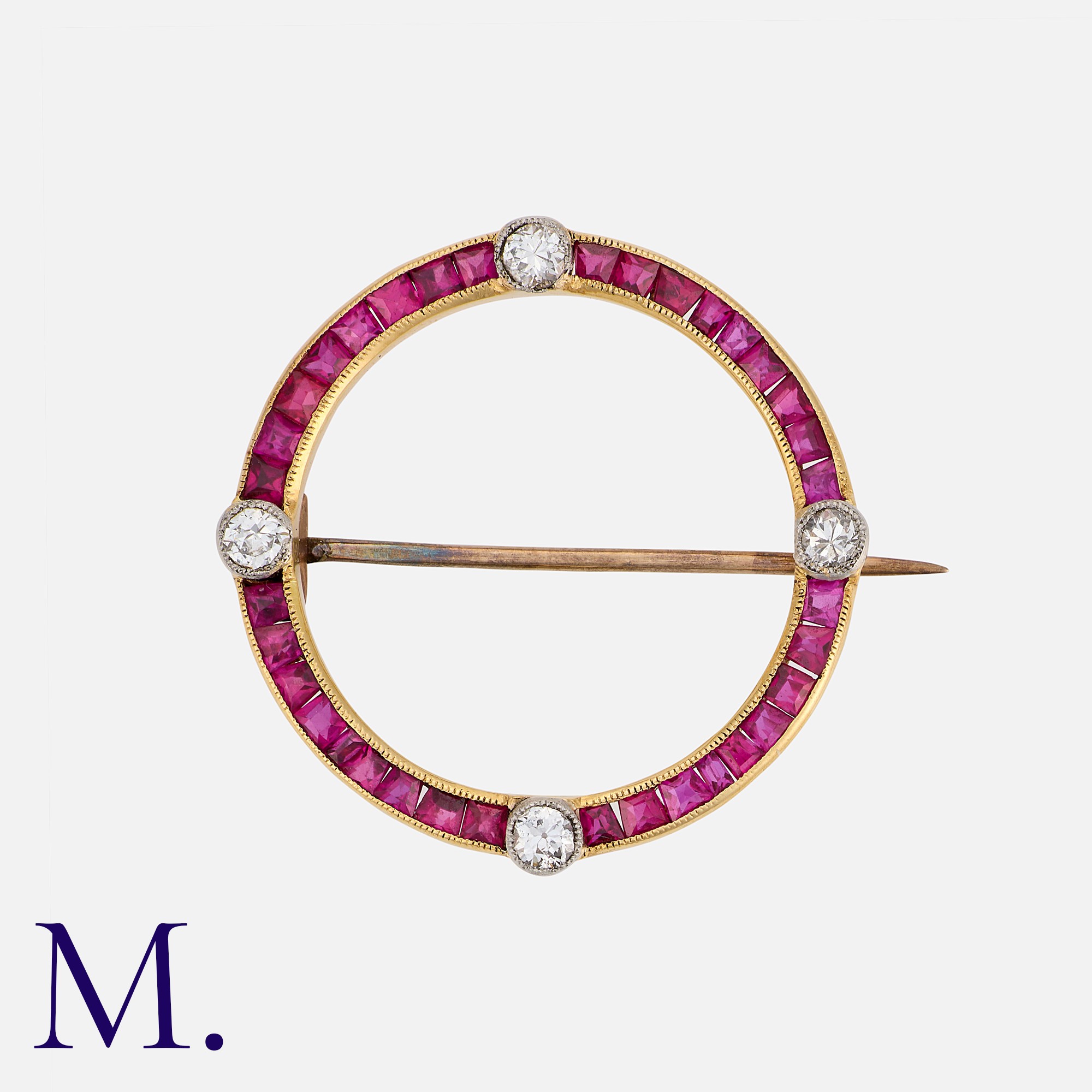 An Art Deco Ruby and Diamond Brooch in yellow gold, of circular form, set with calibre cut rubies, accented by four round cut diamonds.