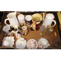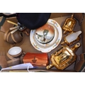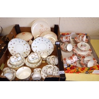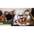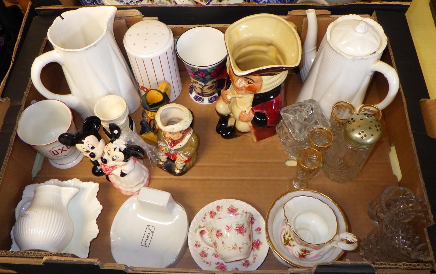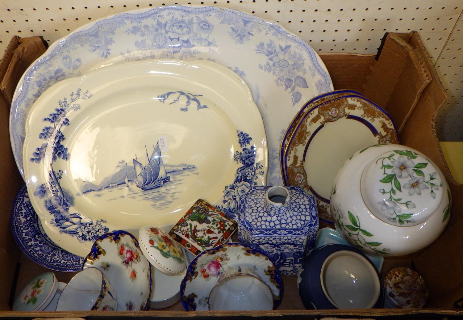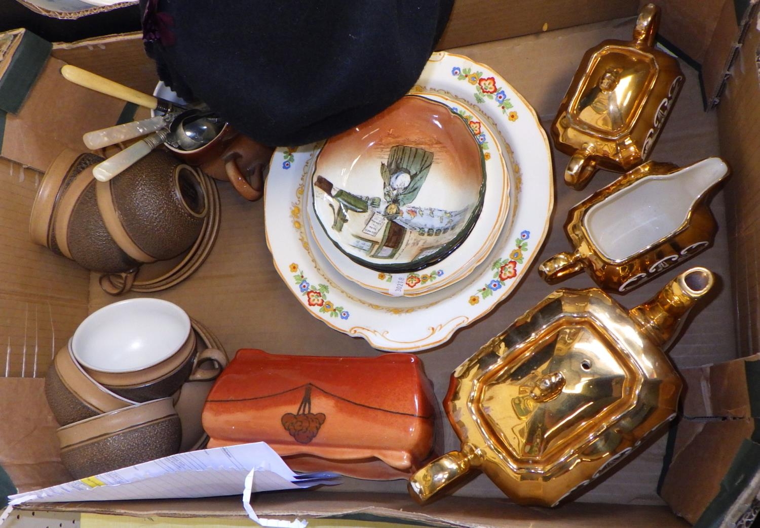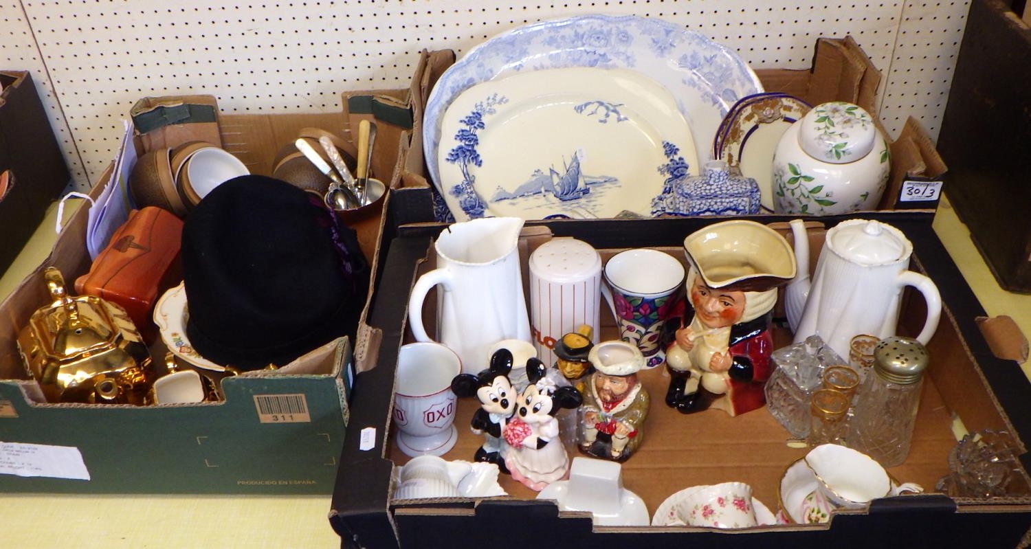 Three boxes of misc ceramics and glass to include Shelley, Royal Albert, Sadler etc together with a Dickins & Jones ladies hat (3)