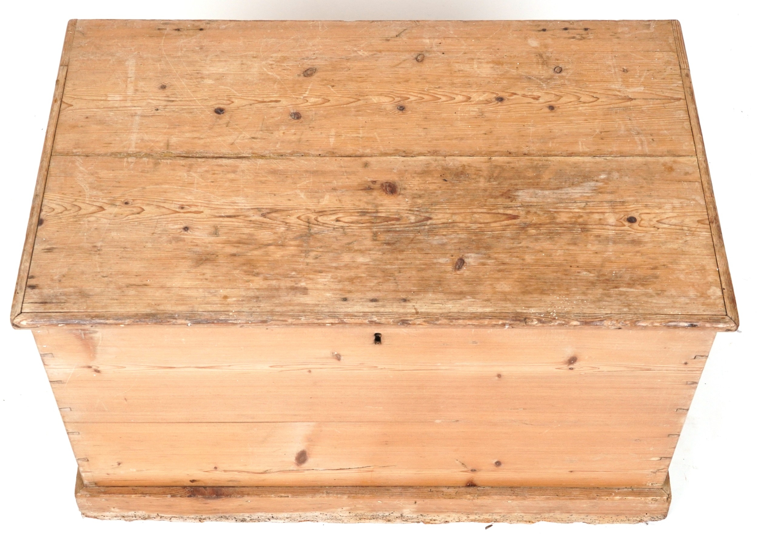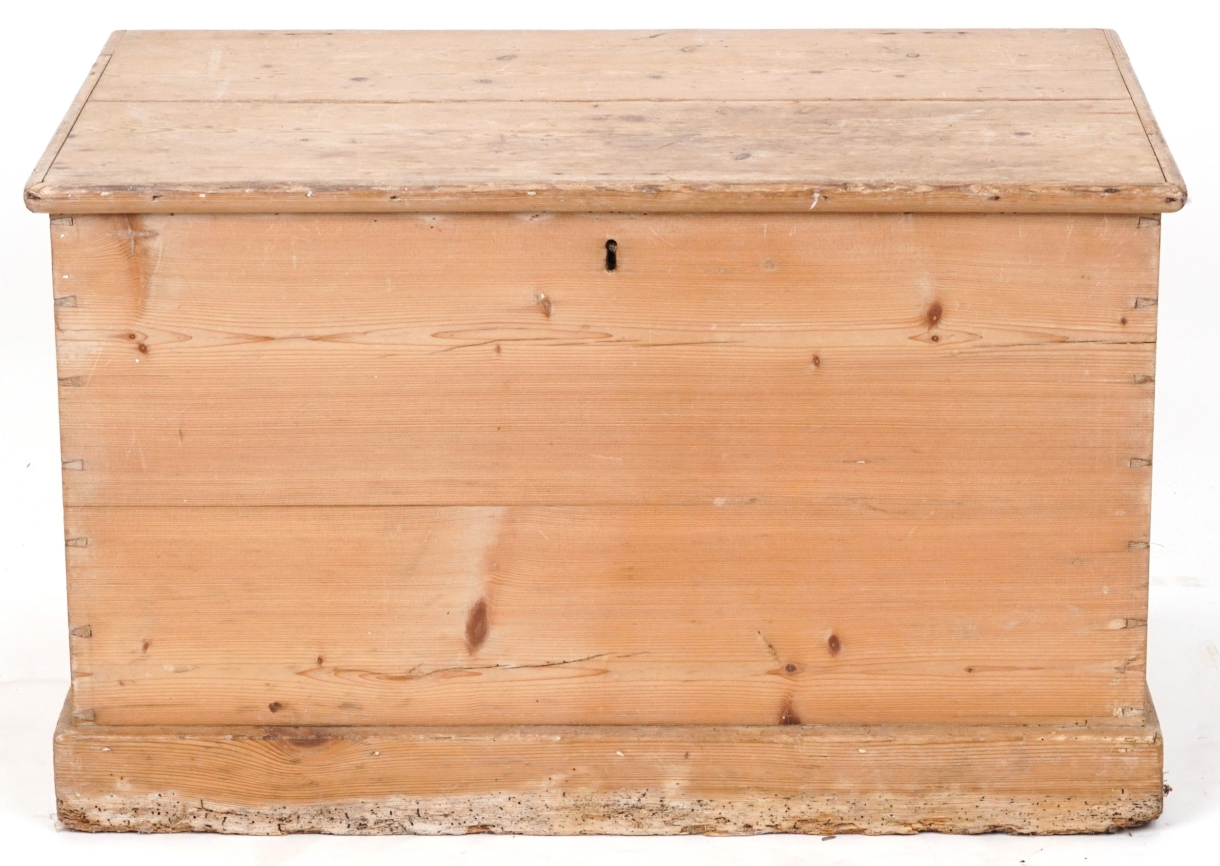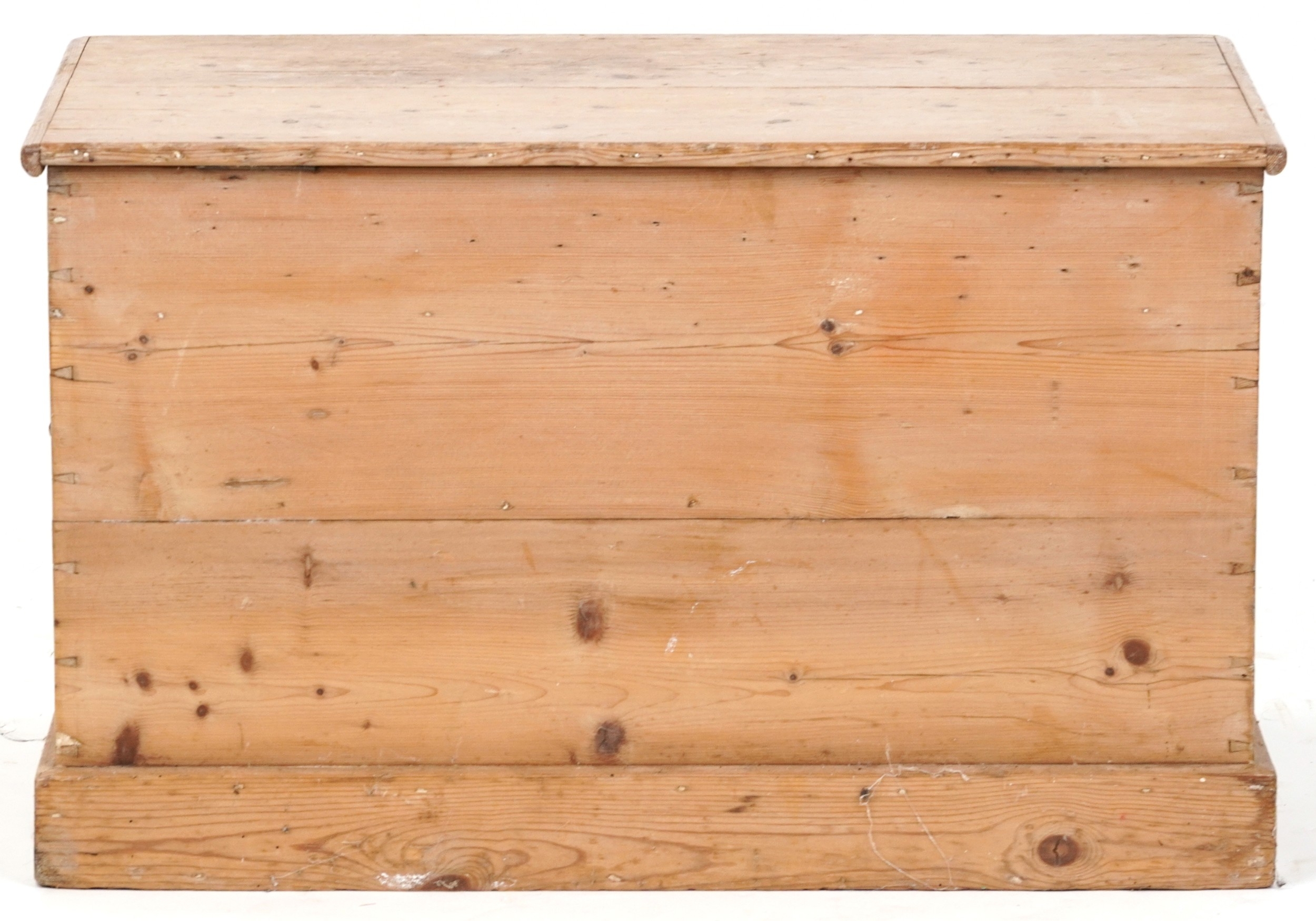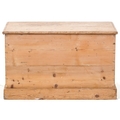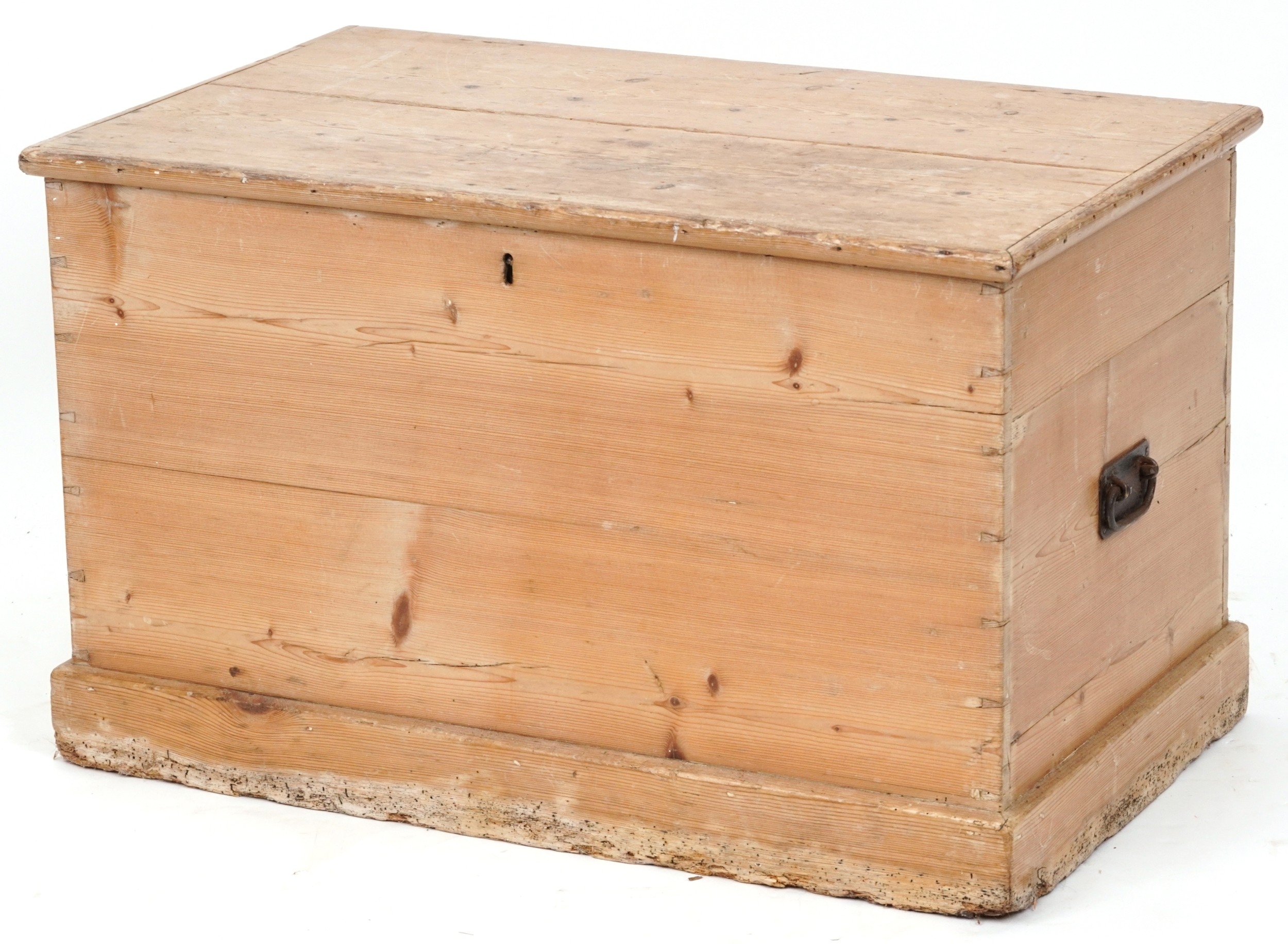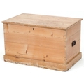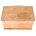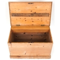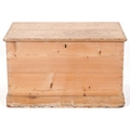 An early 20th century stripped blanket box, the hinged lid revealing a candle box, fitted with drop handles, on a plinth base, 48cm H x 79cm W x 47cm D.