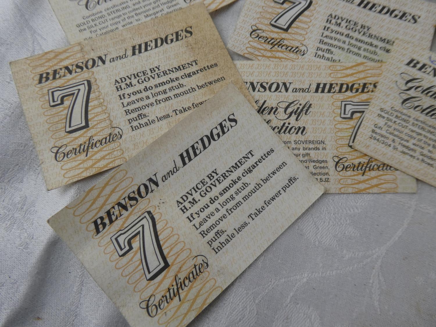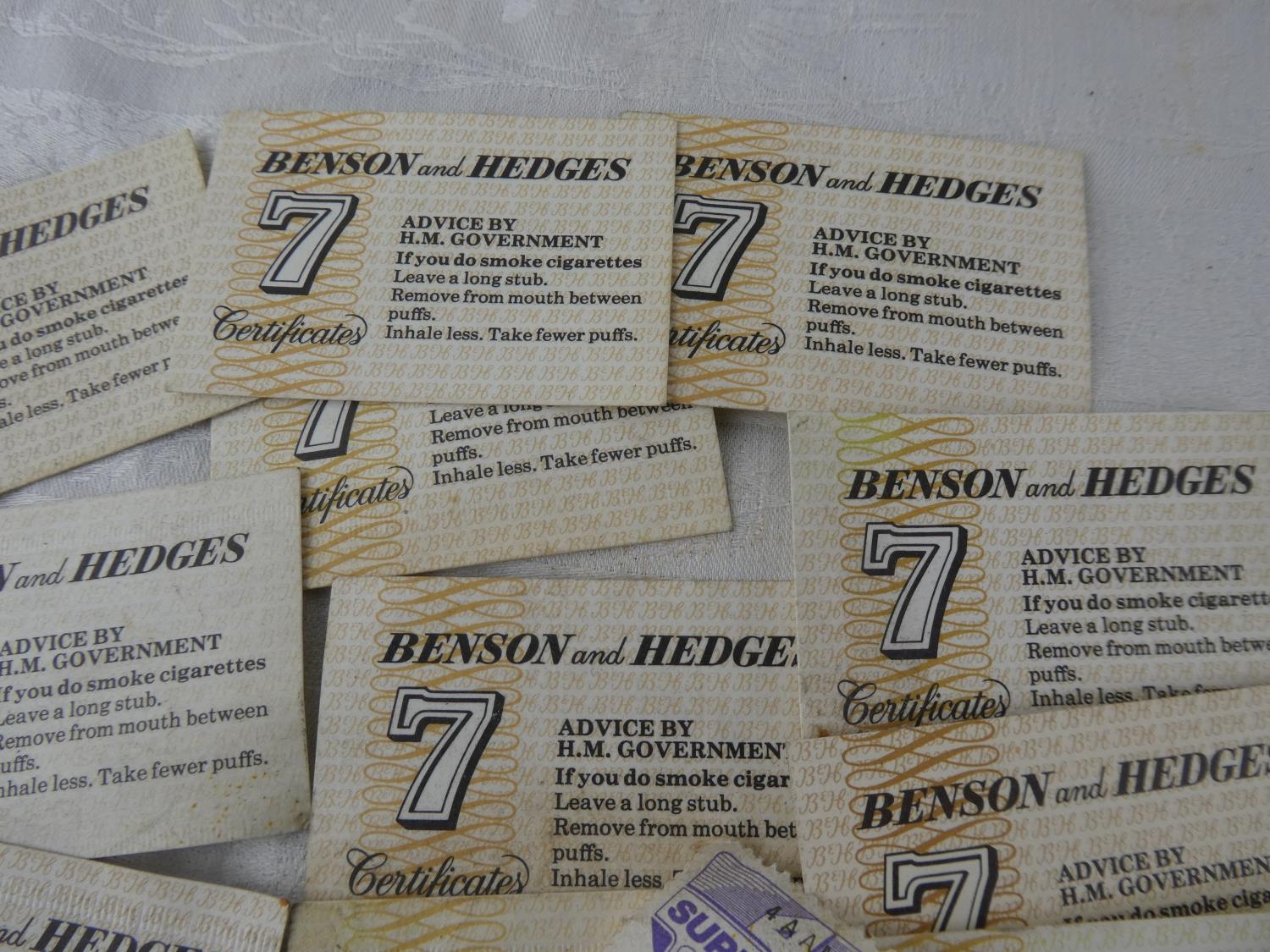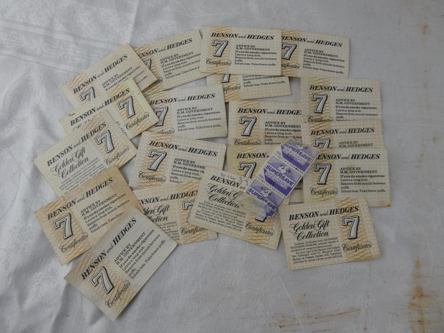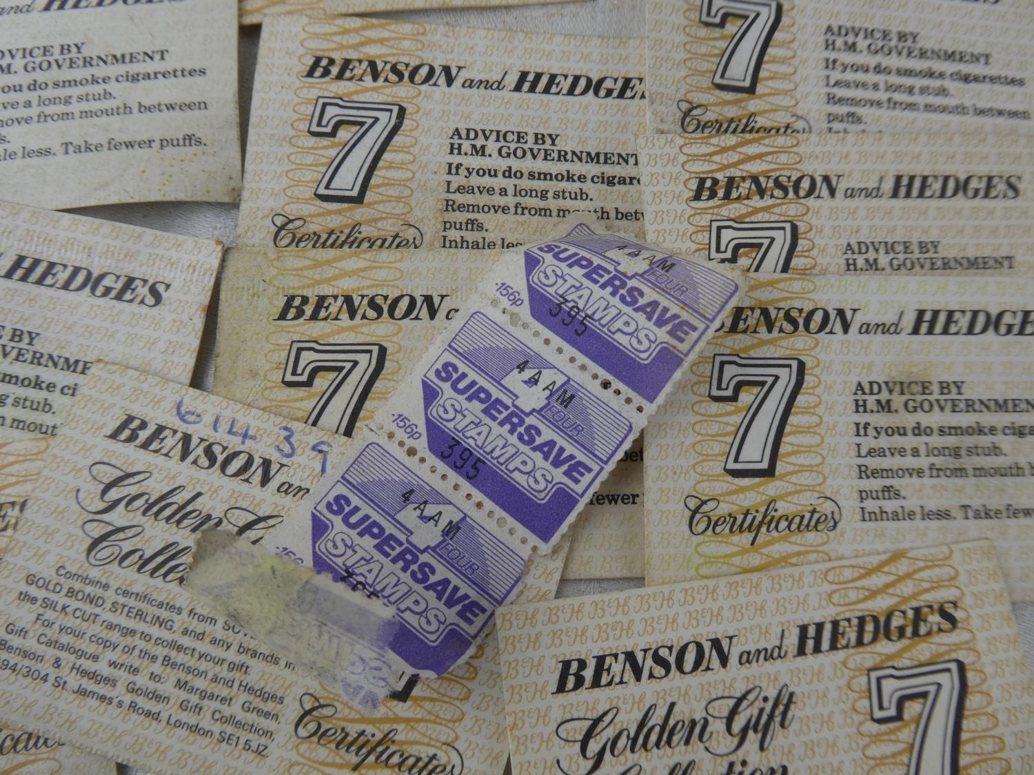 A large collection of Benson and Hedges '7' certificates and four vintage Supersave stamps.