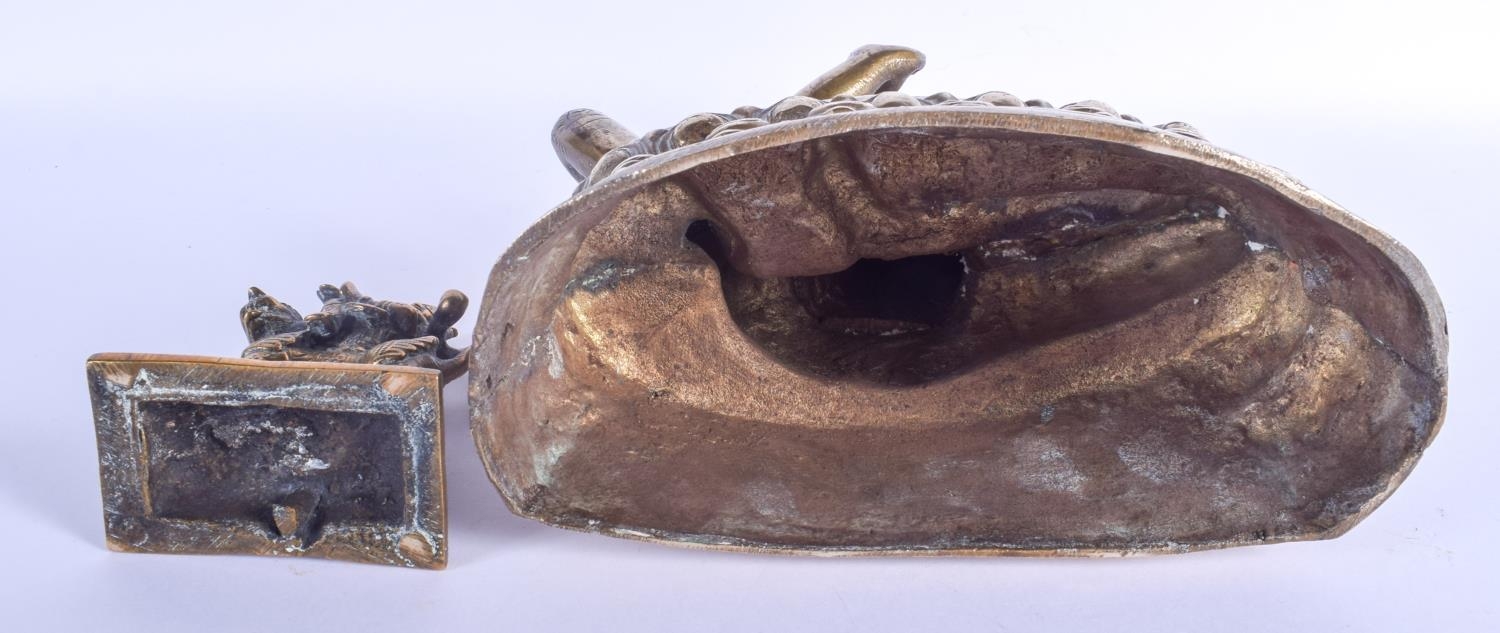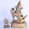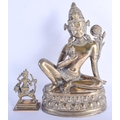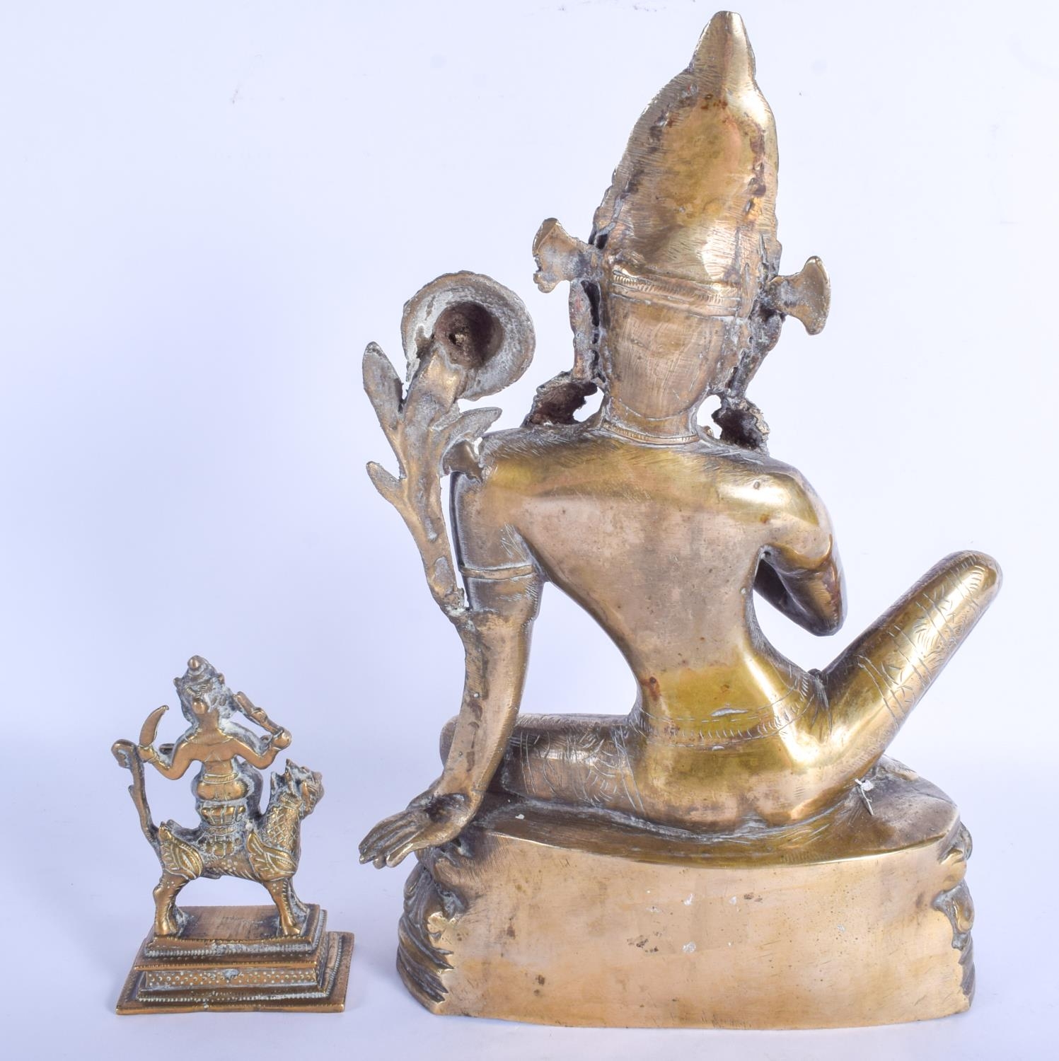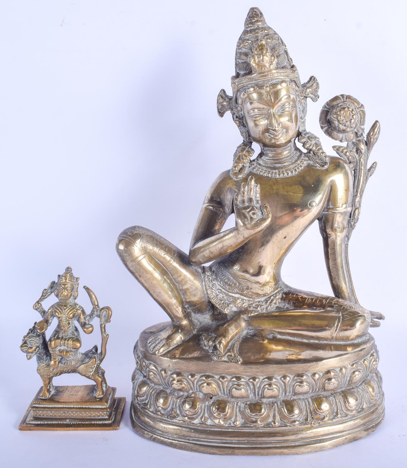 A 19TH CENTURY INDIAN POLISHED BRONZE FIGURE OF A BUDDHA together with a smaller buddhistic deity. Largest 32 cm high. (2)