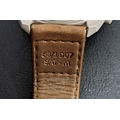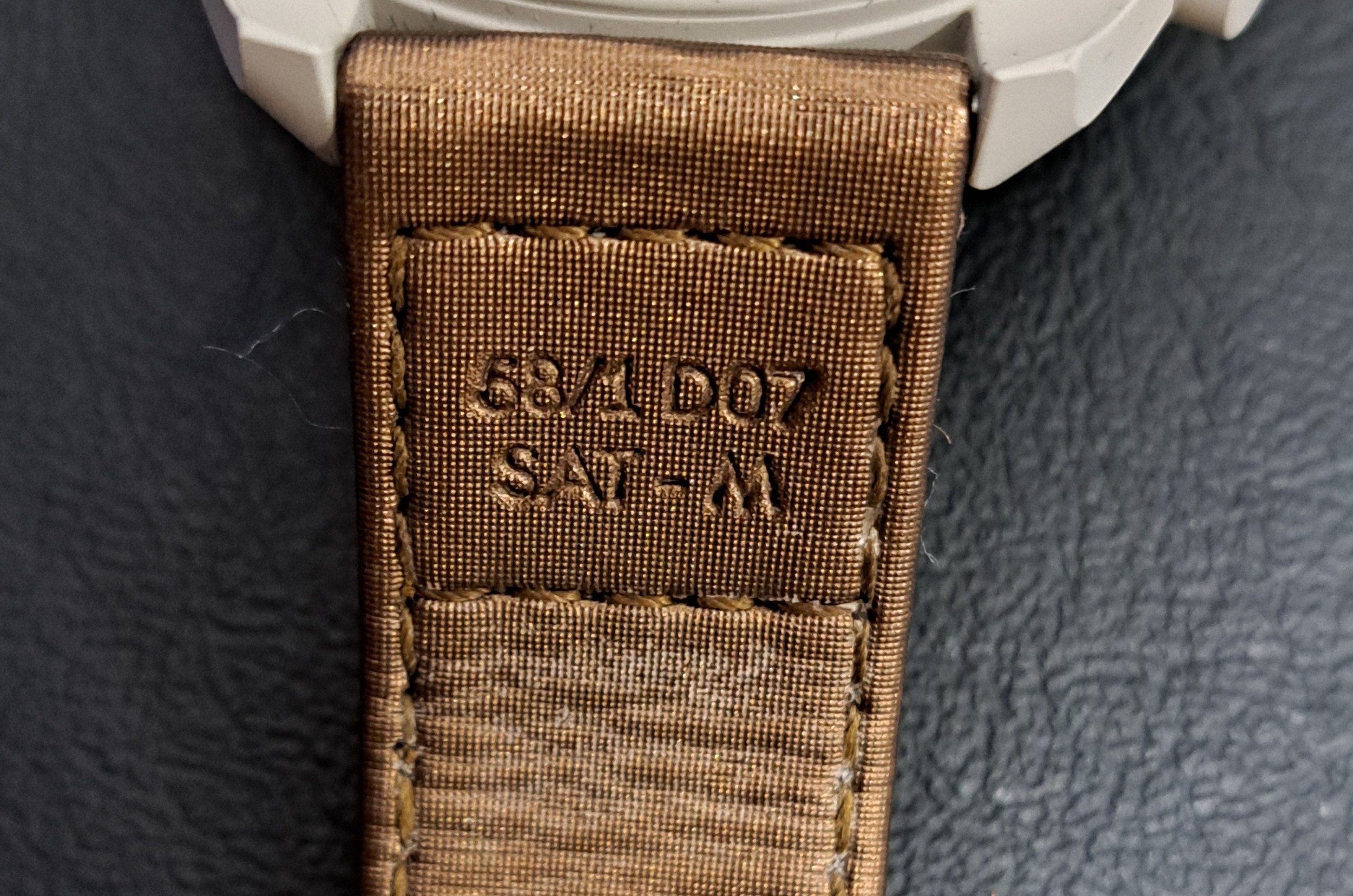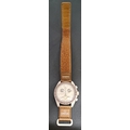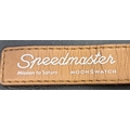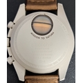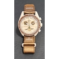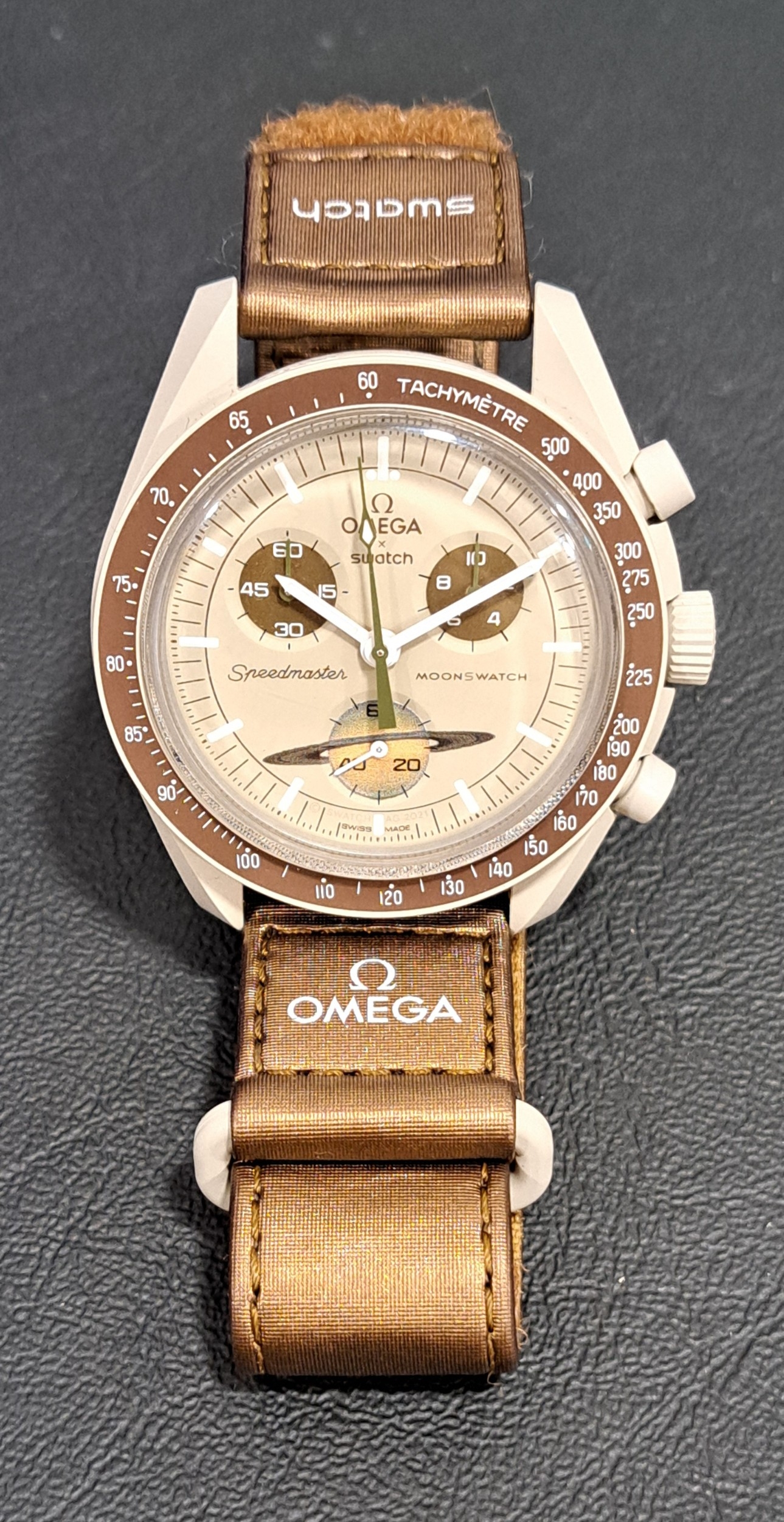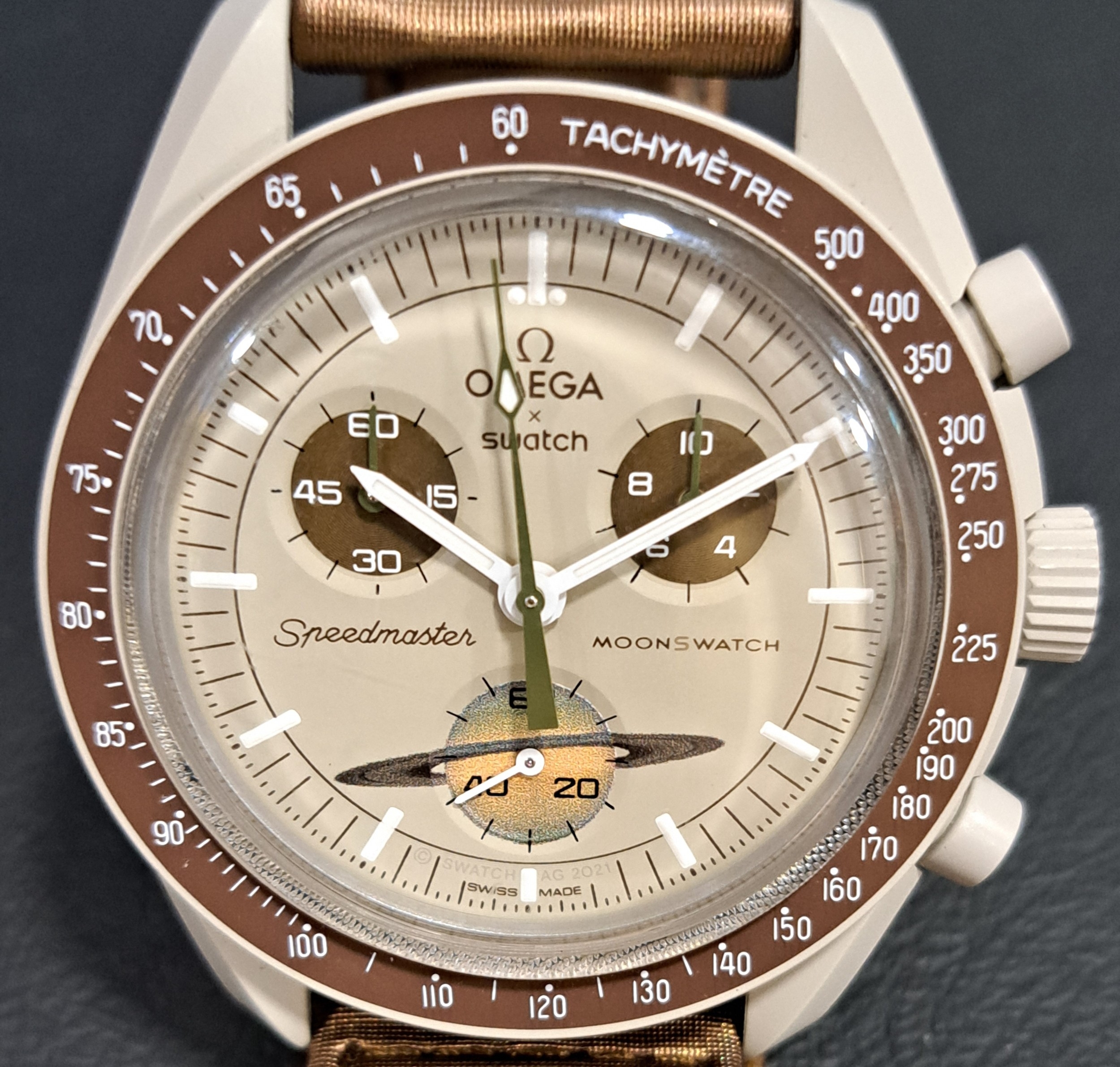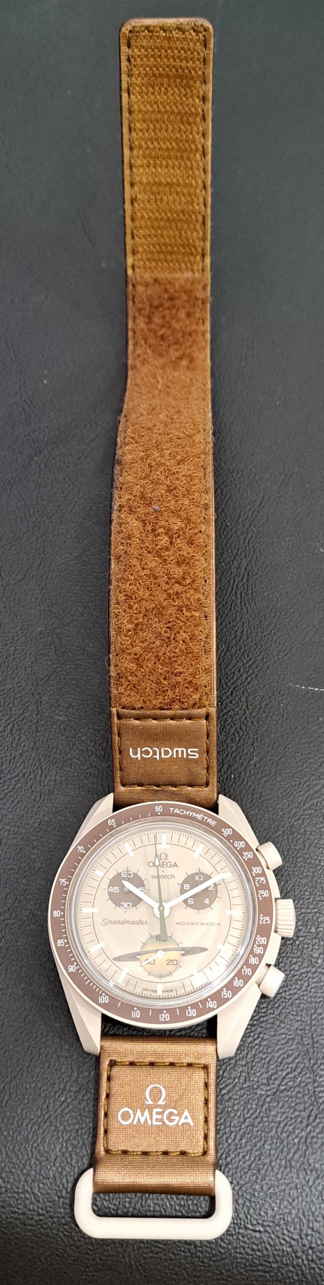 the beige dial on the Bioceramic Speedmaster with three subsidiary dials, the seconds subdial at 6 o'clock depicting Saturn's rings, on brown Velcro strap