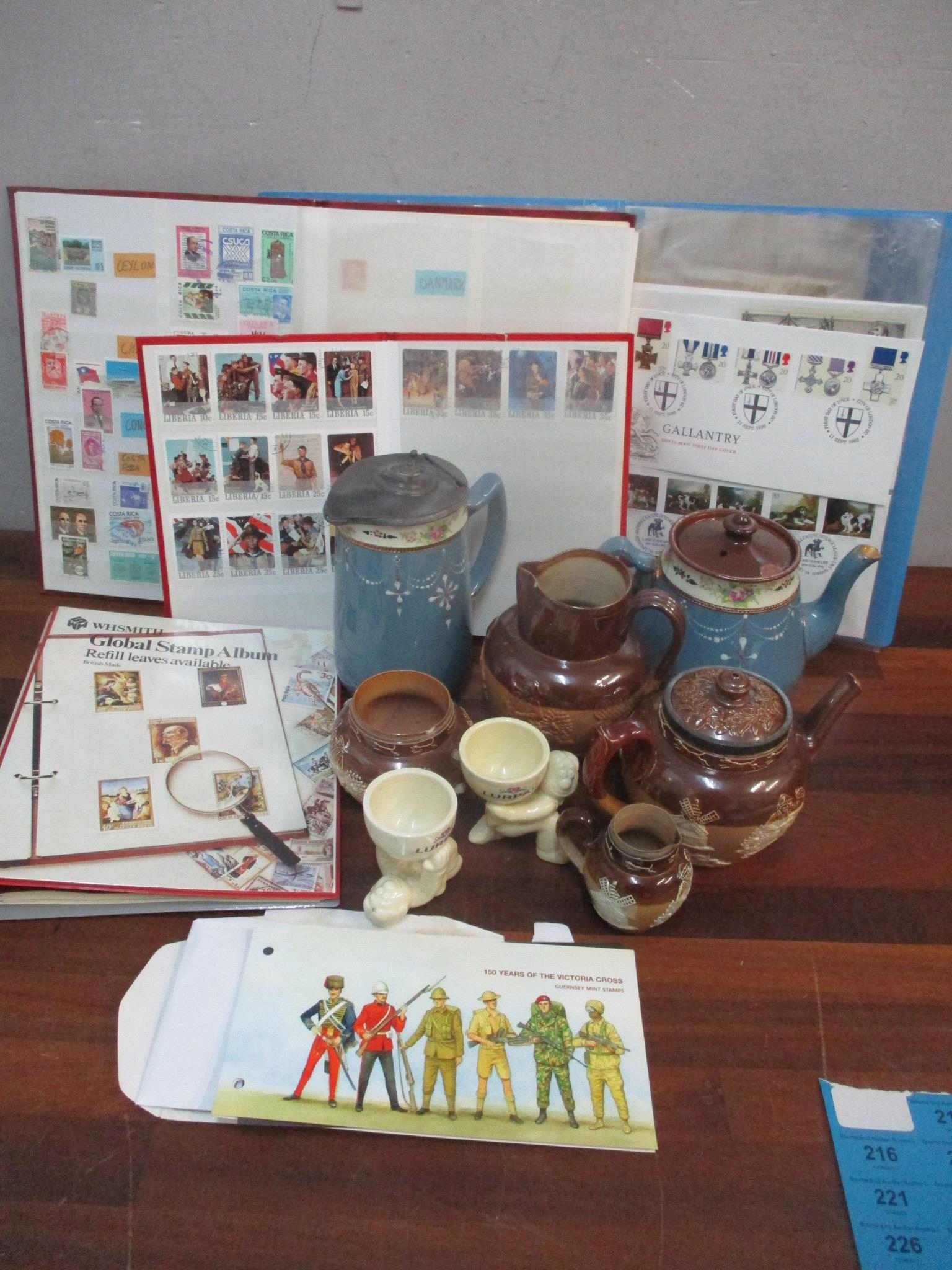 Two part-filled stamp albums to include World stamps Australia, Jamaica, Peru and First Day covers, along with mixed stoneware to include Doulton teapot A/F, harvest jug, Lurpak eggcups (2) and other items Location: BWR