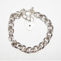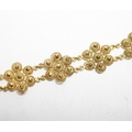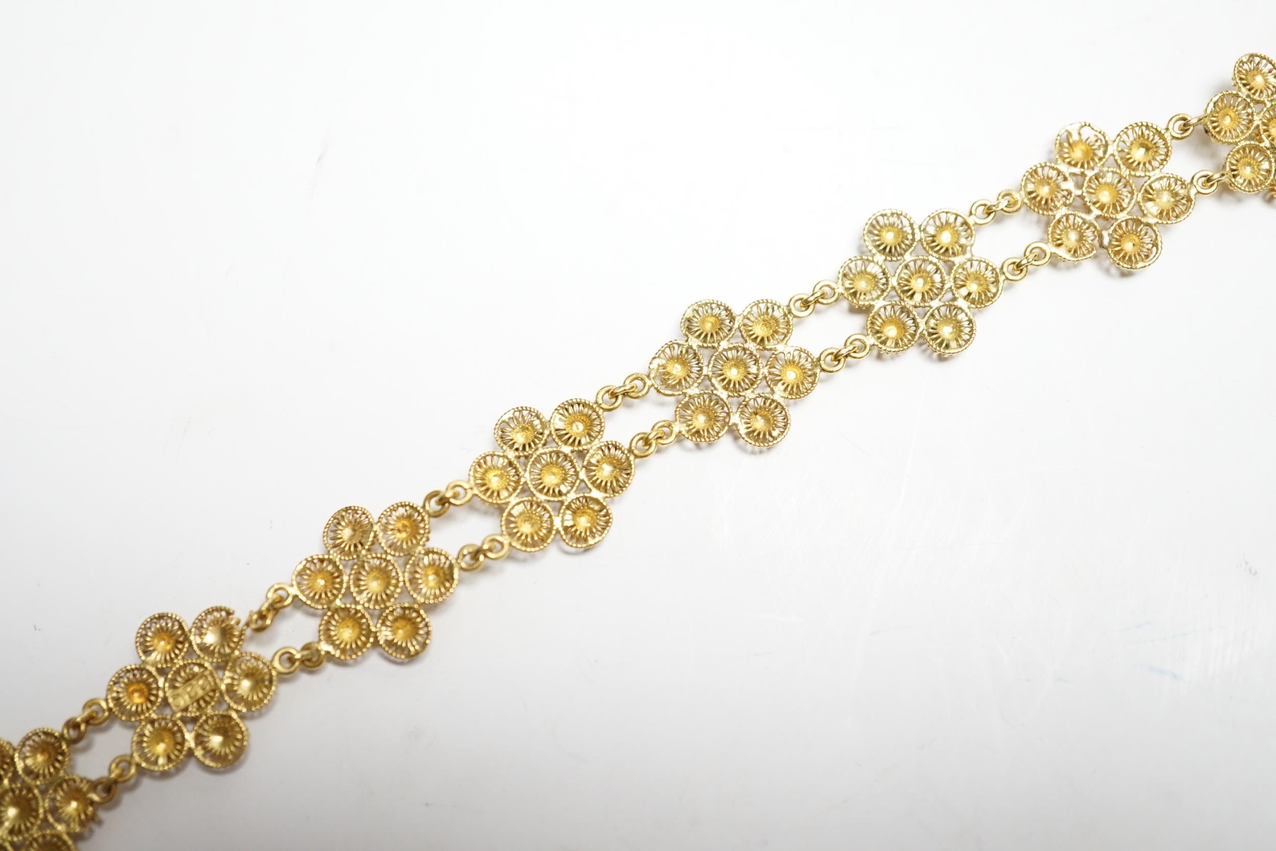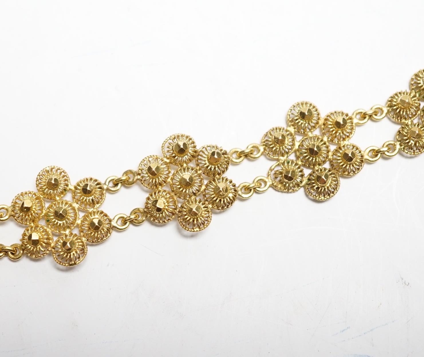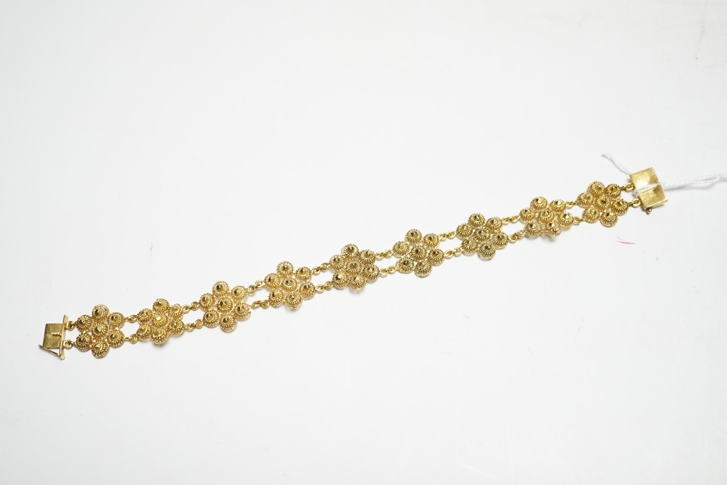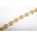 A yellow metal 'bright cut engraved' flower head link bracelet, 16cm, 14.7 grams.