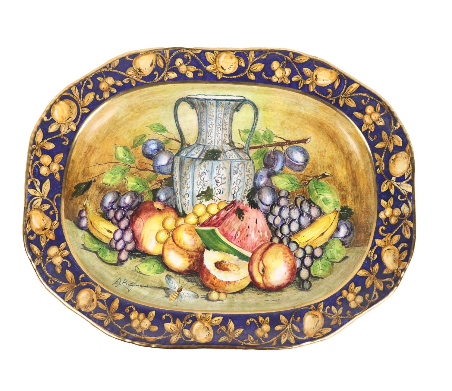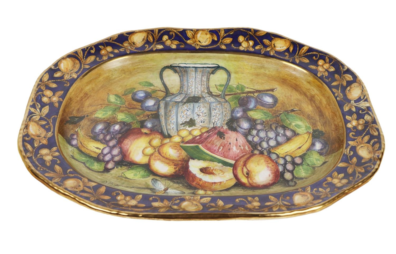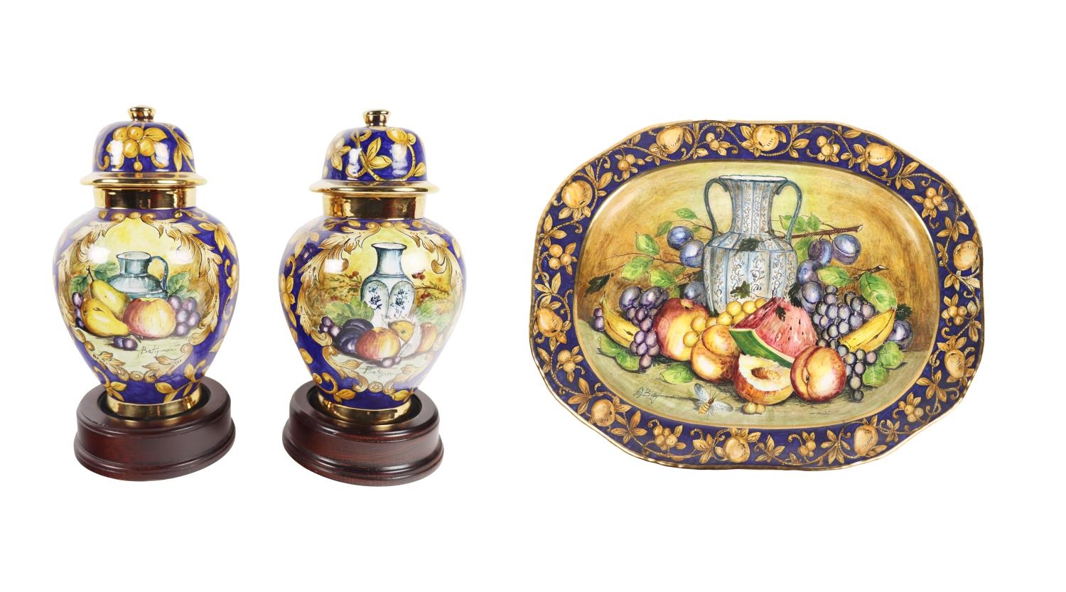 An attractive pair of Italian fruit decorated Urns & Covers, by Batiquani of Italy, approx. 30cms high (12"); together with a matching similarly decorated Platter, approx. 56cms diameter (23"). (3)