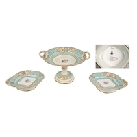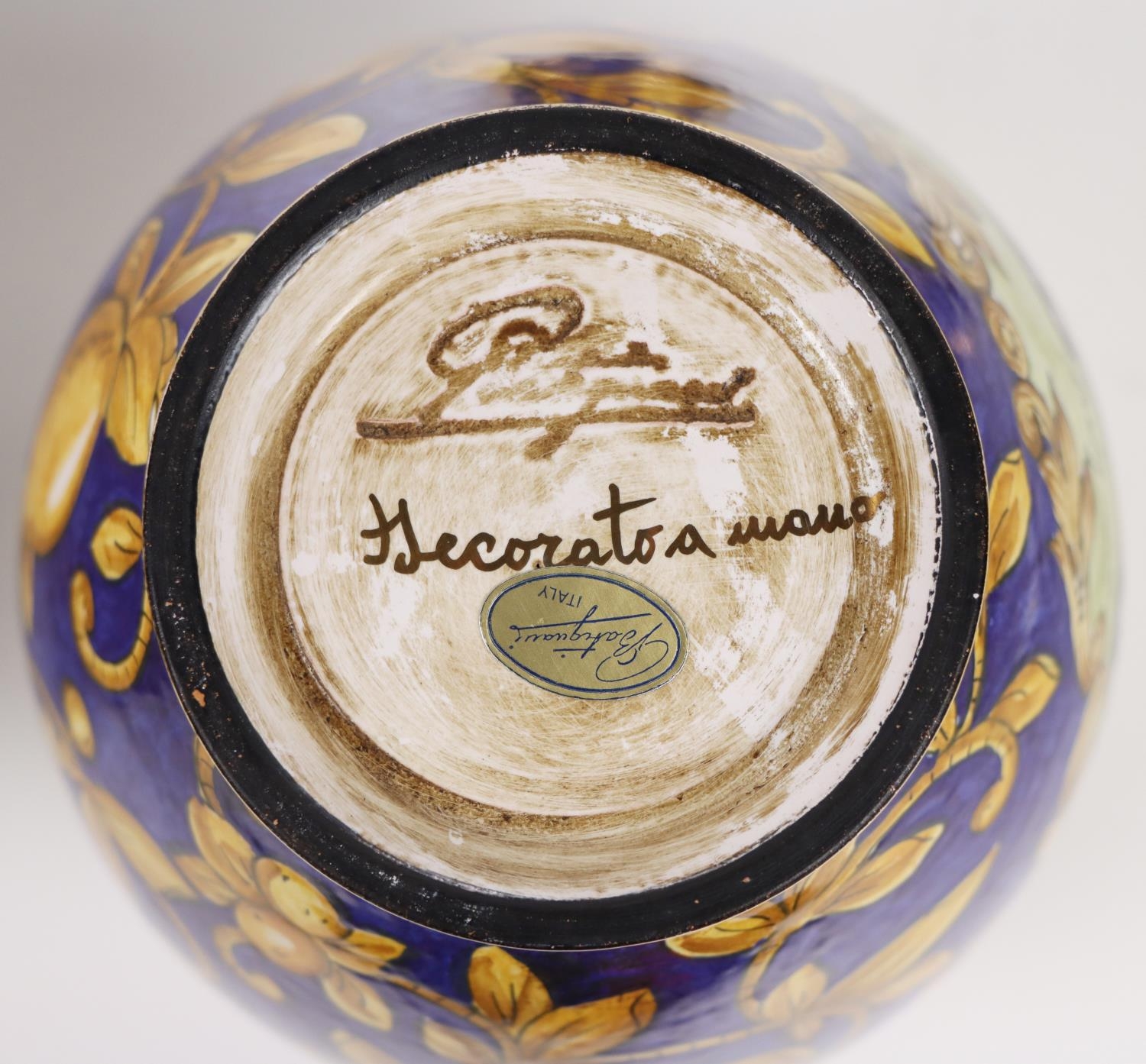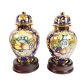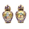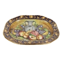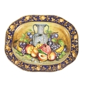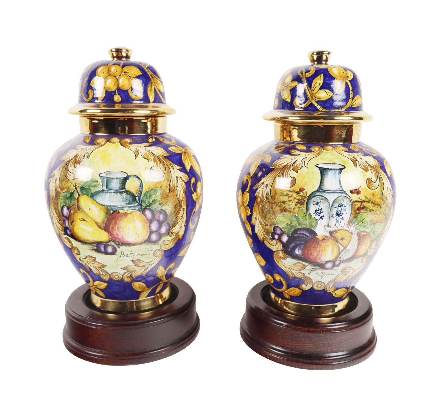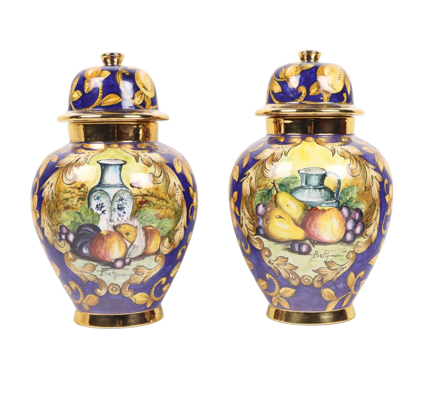 An attractive pair of Italian fruit decorated Urns & Covers, by Batiquani of Italy, approx. 30cms high (12"); together with a matching similarly decorated Platter, approx. 56cms diameter (23"). (3)