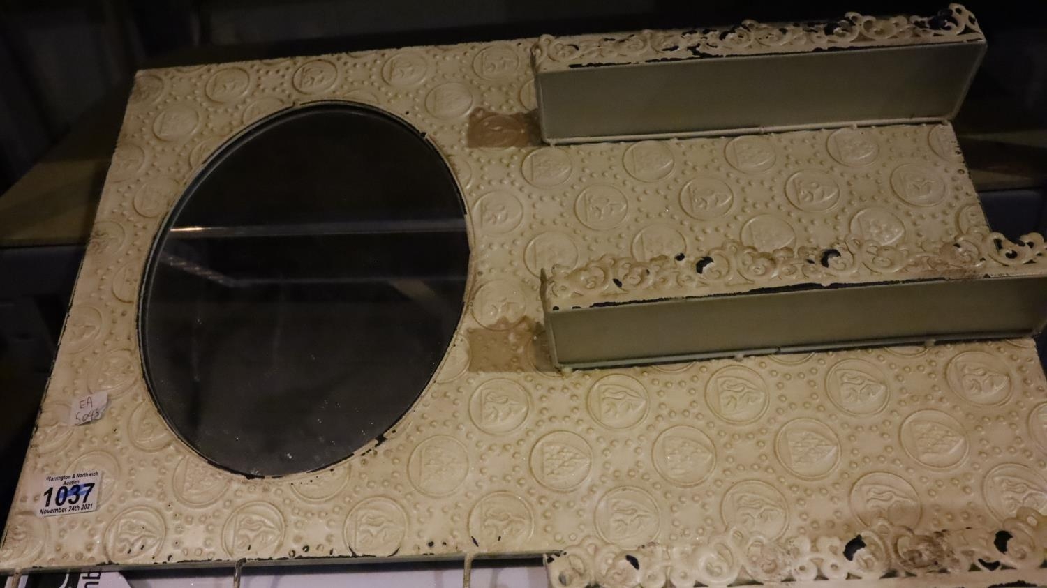 Boxed large modern photograph frame, a vintage tin and a wall mounted hall mirror with shelving and coat hooks. Not available for in-house P&P, contact Paul O'Hea at Mailboxes on 01925 659133